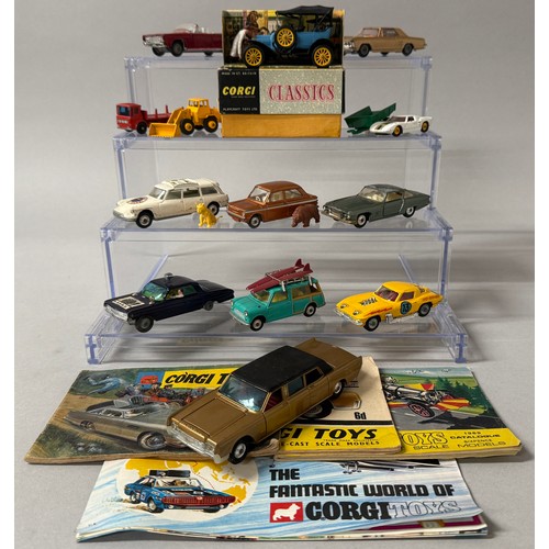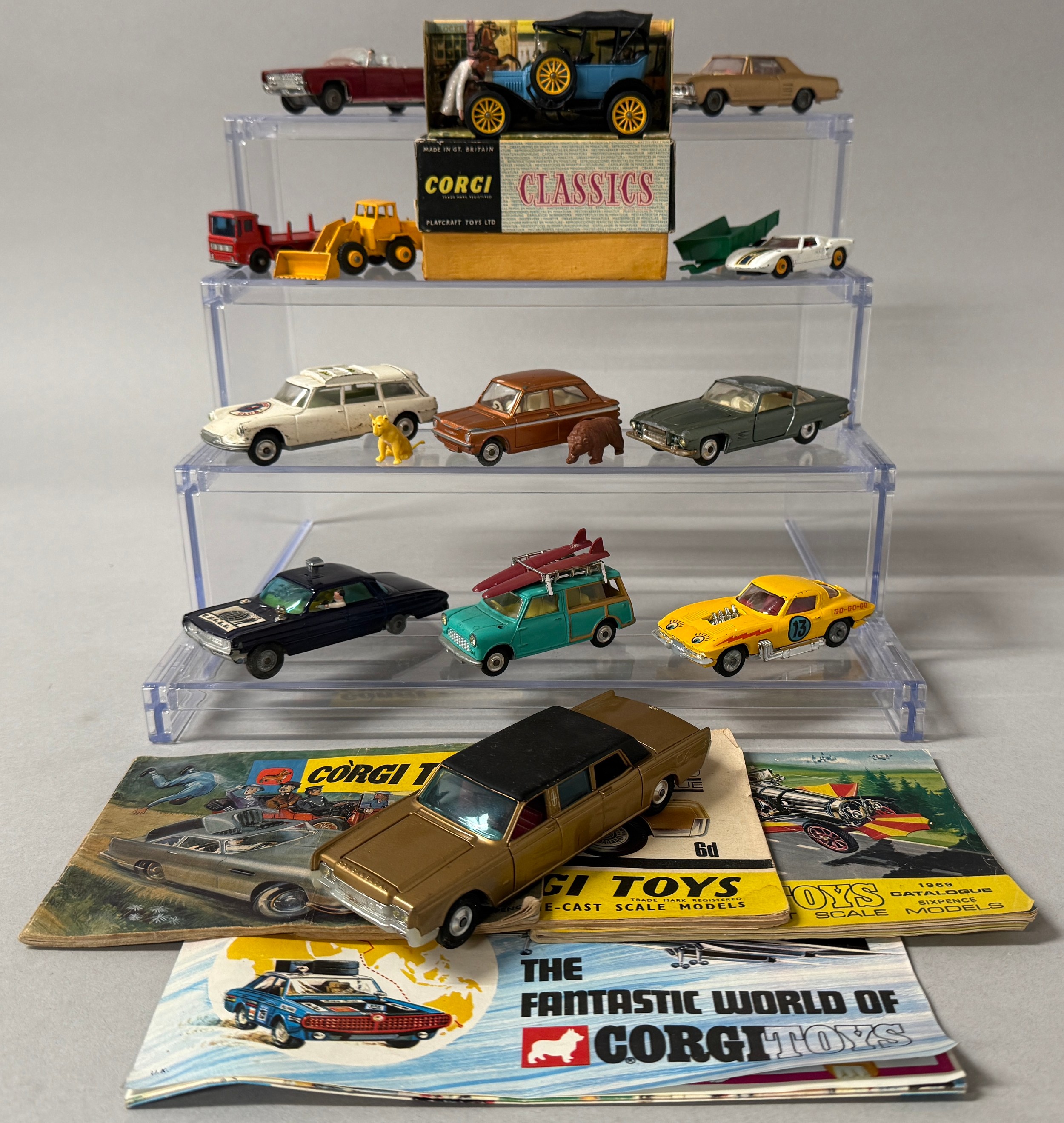 Corgi Toys - 245 Buick Riviera, gold body, red interior, cast hubs; 262 Lincoln Continental, Lehmann-Peterson black over gold body, red interior, spun hubs; 475 Citroen Safari Ski Jump, white body, Corgi Ski Club decal to bonnet, sky blue and tan interior, spun hubs (lacking roof rack); 485 Austin Mini Countryman, turquoise body, yellow interior, roof rack with surf boards, spun hubs (lacking figure); 9013 1915 Ford, blue body, black interior, yellow cast hubs, mini figure, boxed; others Chevrolet Corvette Sting Ray, Hillman Imp, Ghia L6.4, Oldsmobile Super 88 (U.N.C.L.E.), 1966, 1967-1968 and 1969 catalogues etc, playworn (qty)