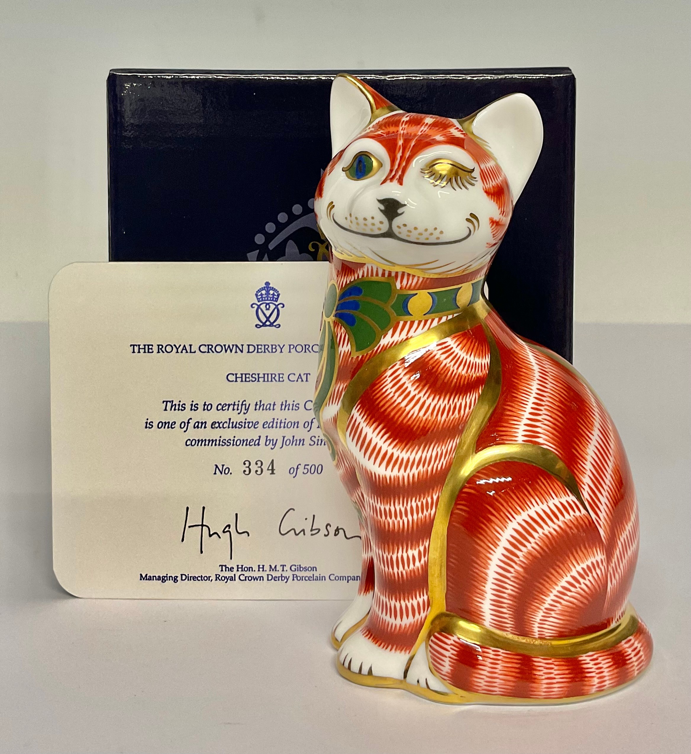 A Royal Crown Derby paperweight, Cheshire Cat, exclusively commissioned by John Sinclair, limited edition 334/500, gold stopper, 13.5cm, printed mark in red, certificate, boxed