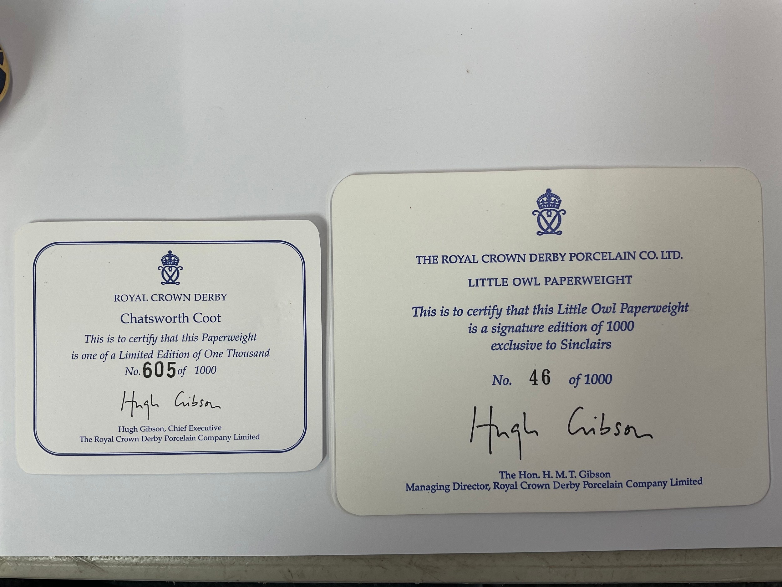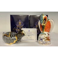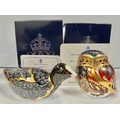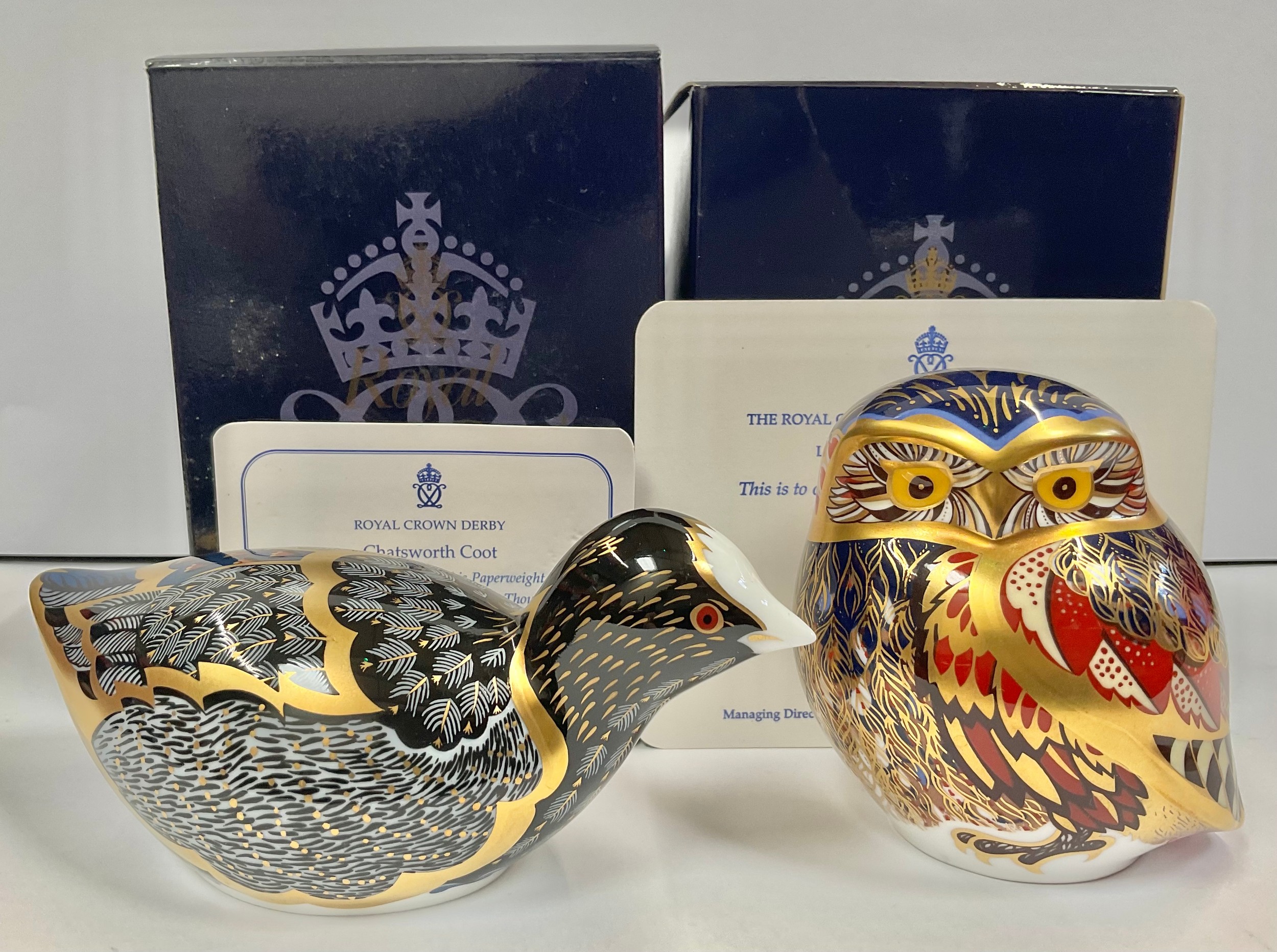 A Royal Crown Derby paperweight, Chatsworth Coot, limited edition 605/1,000, gold stopper, 12cm long, printed mark in red, certificate, boxed; another, Little Owl, Sinclairs exclusive, designed by John Ablitt, limited signature edition, 46/1,000, gold stopper, 8cm, printed mark in red with facsimile signature, certificate, boxed (2)