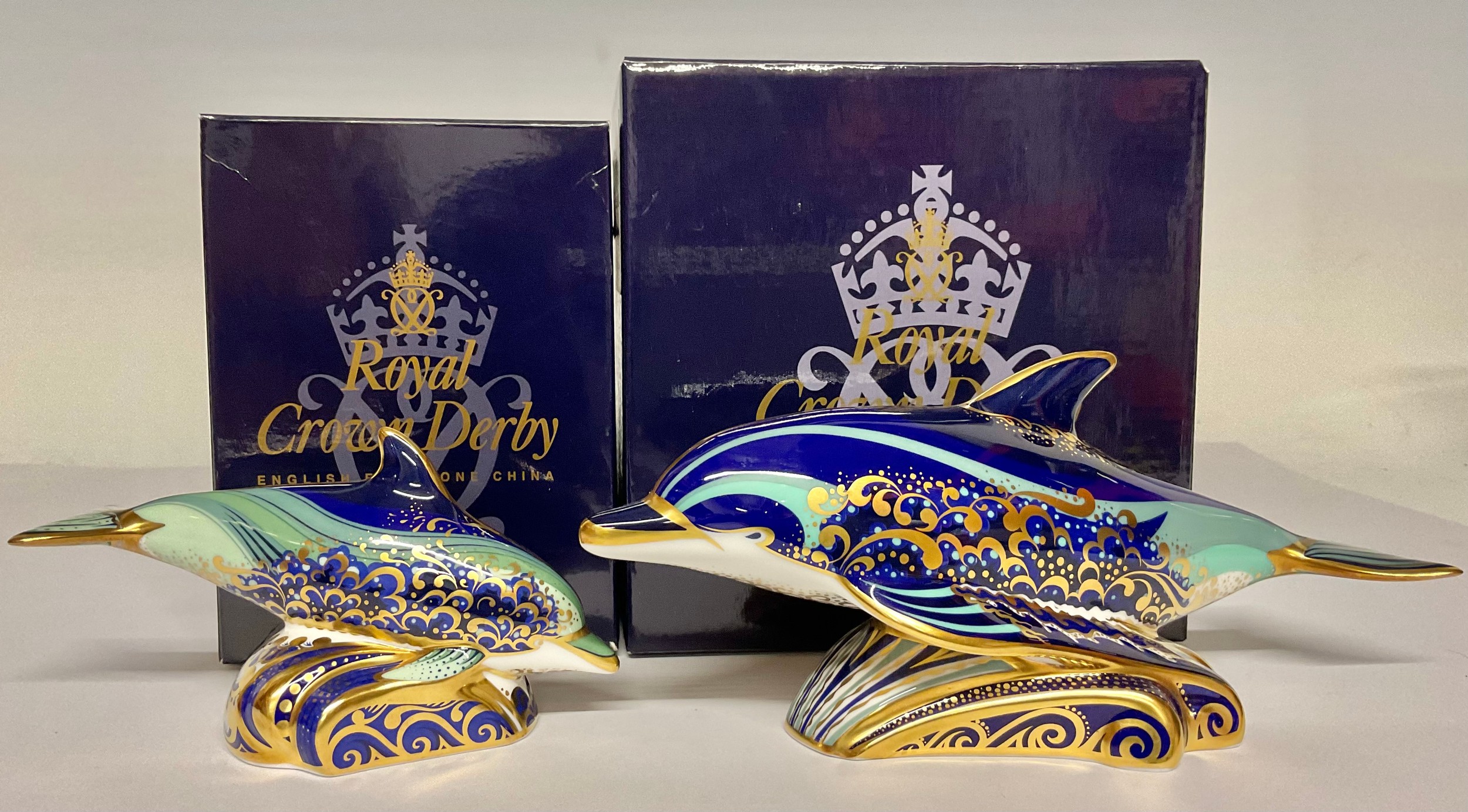 A pair of Royal Crown Derby paperweights, Bottlenose Dolphin and Baby Bottlenose Dolphin, gold stoppers, the Dolphin 19cm long, printed marks in red, each boxed