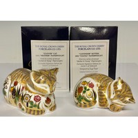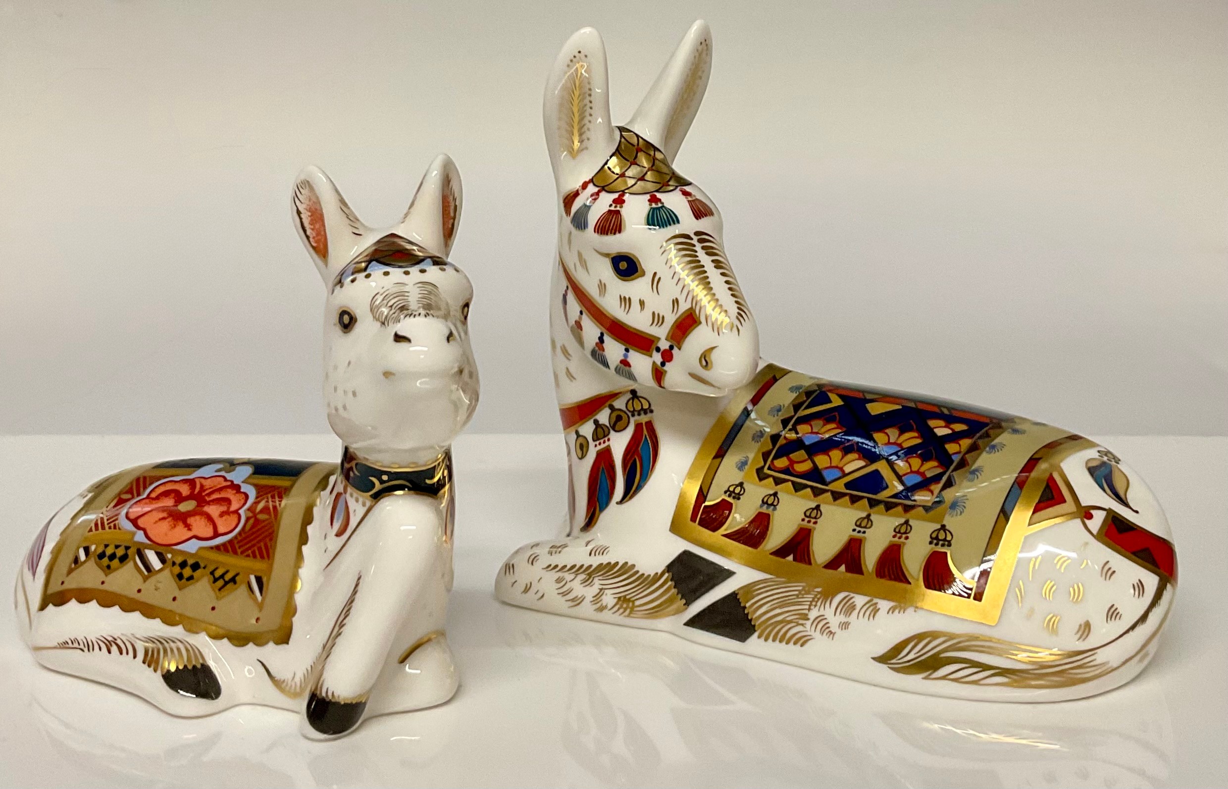 A pair of Royal Crown Derby paperweights, comprising Thistle Donkey, a signature edition of 1,500 exclusively commissioned by Goviers of Sidmouth, designed by John Ablitt, gold stopper, 14cm long, printed mark in red, signed by John Ablitt in gold; Holly Foal, a signature edition of 1,500 exclusively commissioned by Goviers of Sidmouth, designed by John Ablitt, gold stopper, 10cm long, printed mark in red (2)