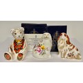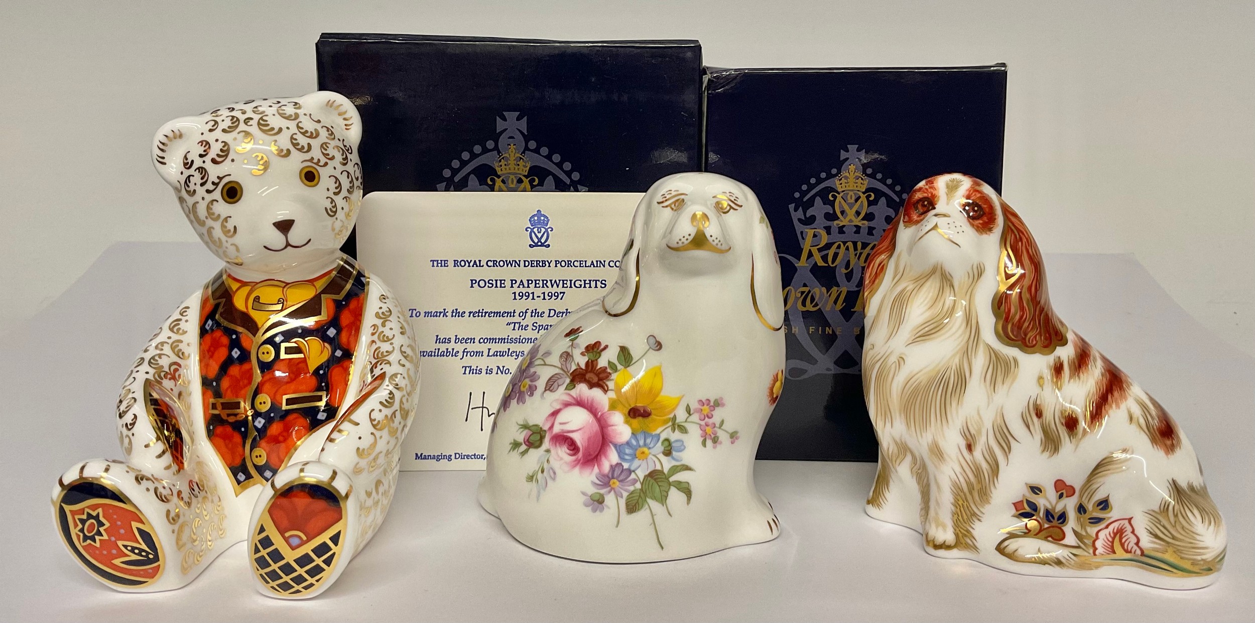A Royal Crown Derby paperweight, Cavalier King Charles Spaniel, gold stopper, 10cm, printed mark in red, boxed; others, Debonair Bear, Collectors Guild exclusive, gold stopper, 11cm, printed mark in red, boxed; Posie Spaniel, exclusive limited edition 1,015/1,500, no stopper, printed mark in red, certificate (3)