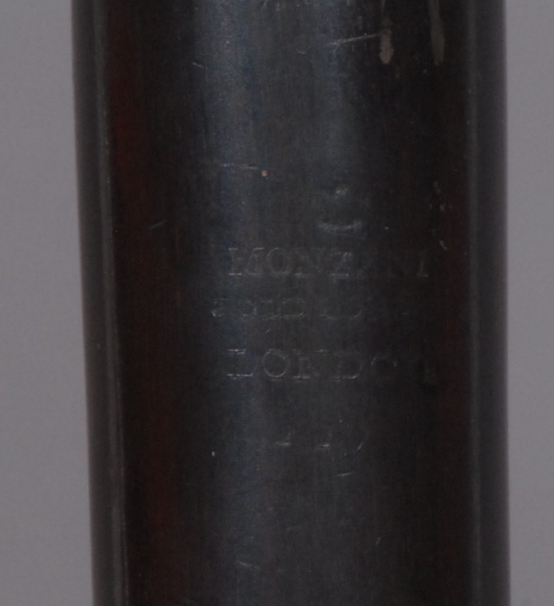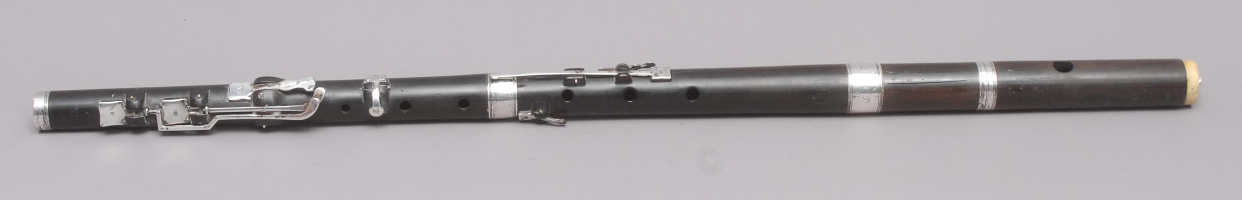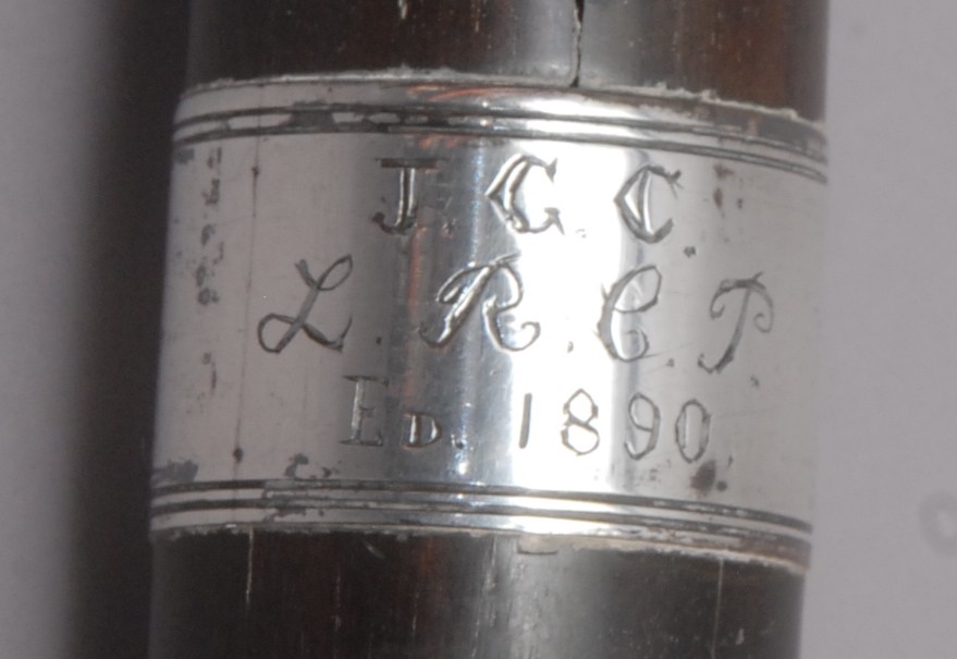 A George IV silver coloured metal mounted cocus wood flute, by Monzani, London, 68cm long, serial no. 1811, c.1821