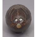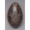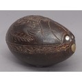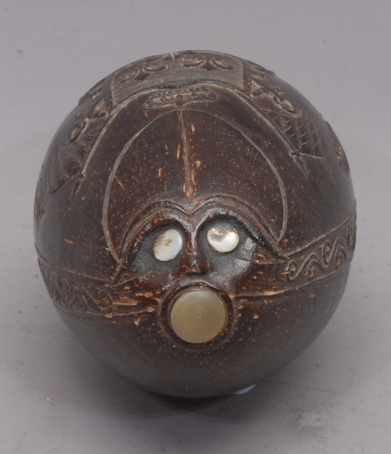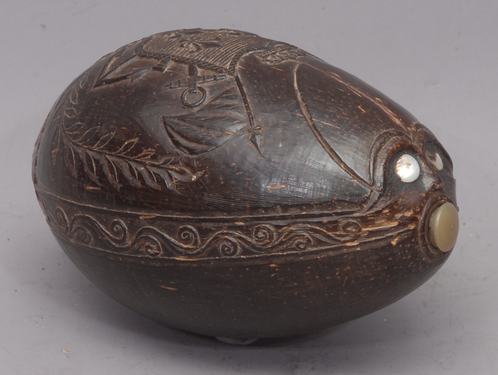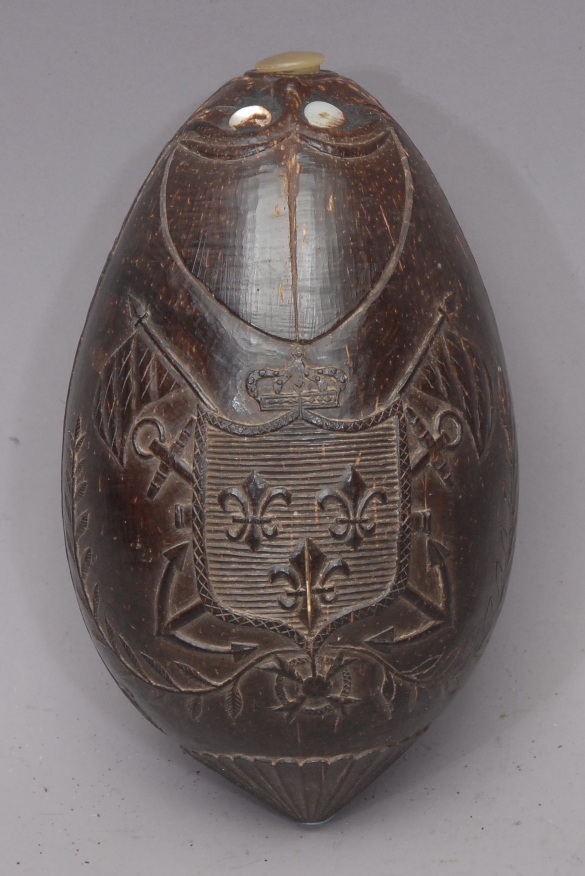 A 19th century French coconut bugbear flask, carved in relief with crossed anchors and the coat of arms of France, inlaid with mother of pearl, 16cm long