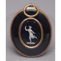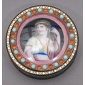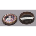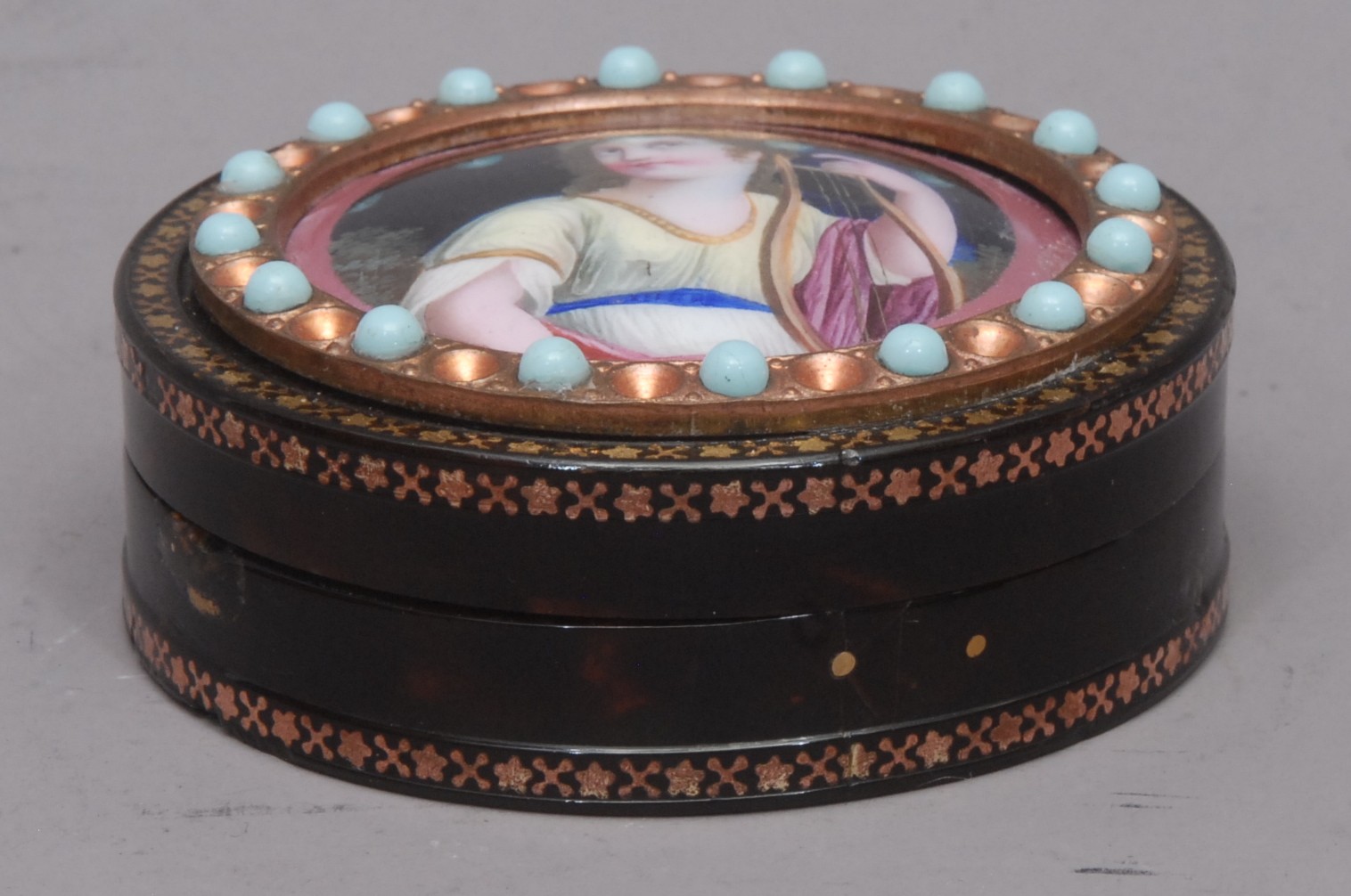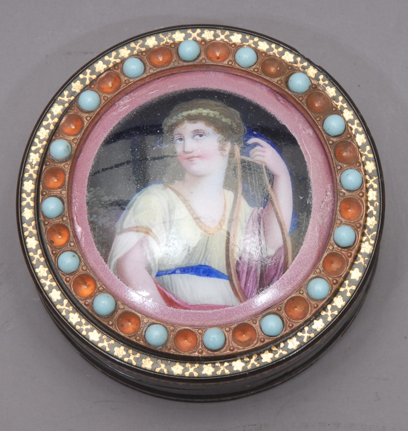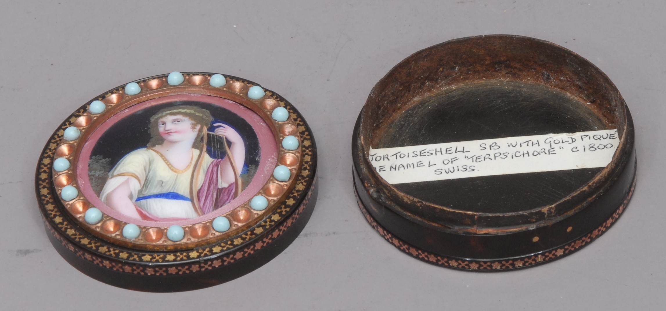 A 19th century Swiss tortoiseshell and enamel circular snuff box, the press close cover hand-painted with a portrait of Terpsichore, Greek goddess of dance and choral song, 6.5cm diameter, c. 1800