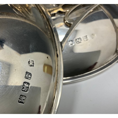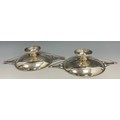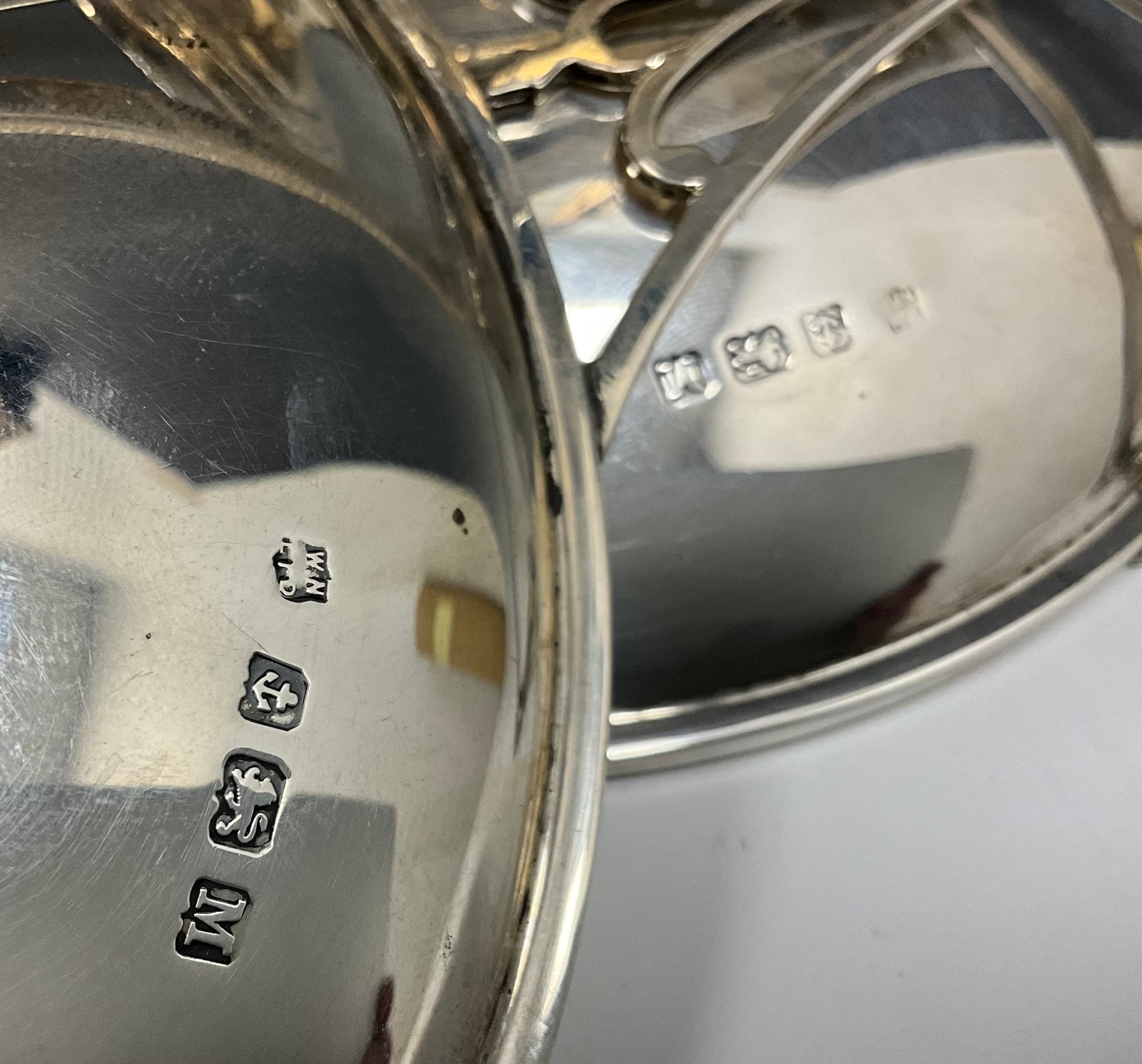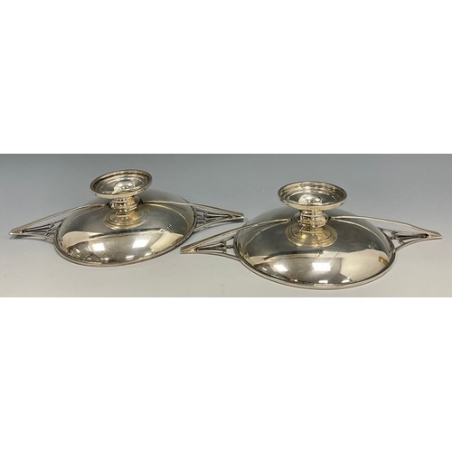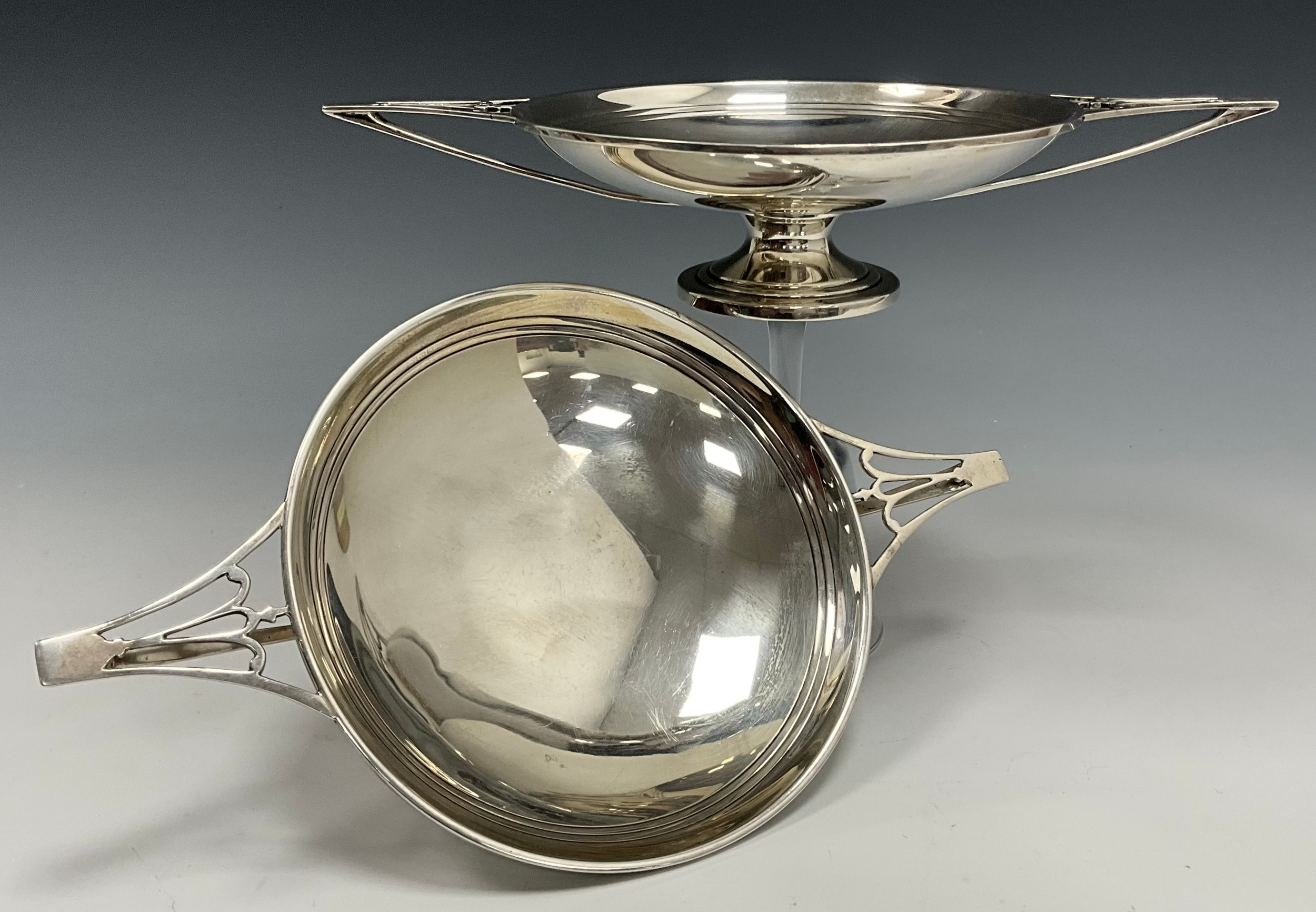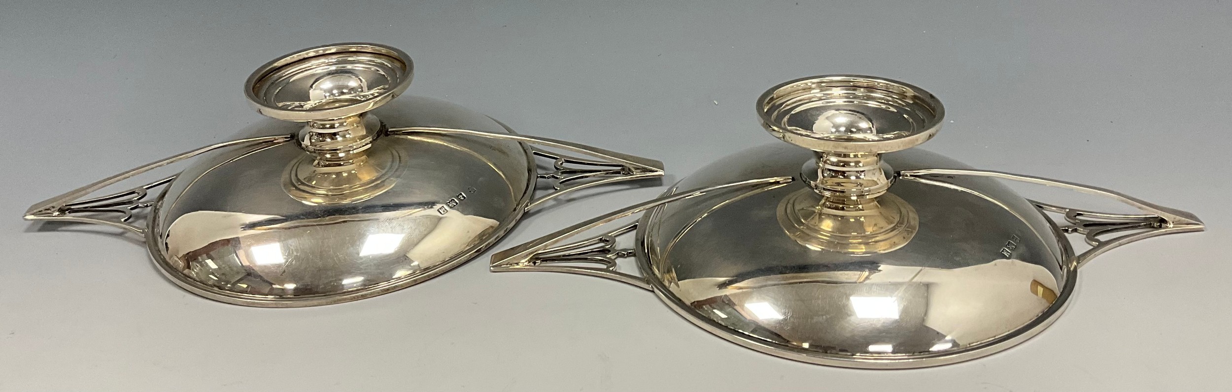 A pair of Art Deco pedestal bonbon dishes, ringed circular body, pierced tapering handles, 25.2cm wide overall, William Neale & Son Ltd , Birmingham 1936, 475g gross (2)