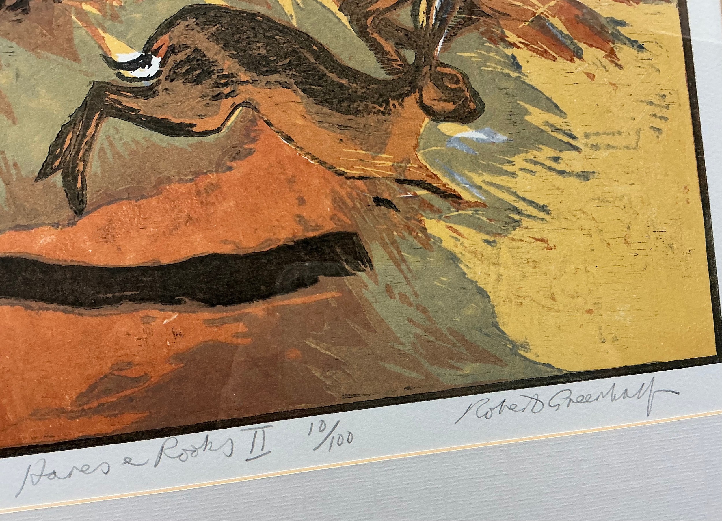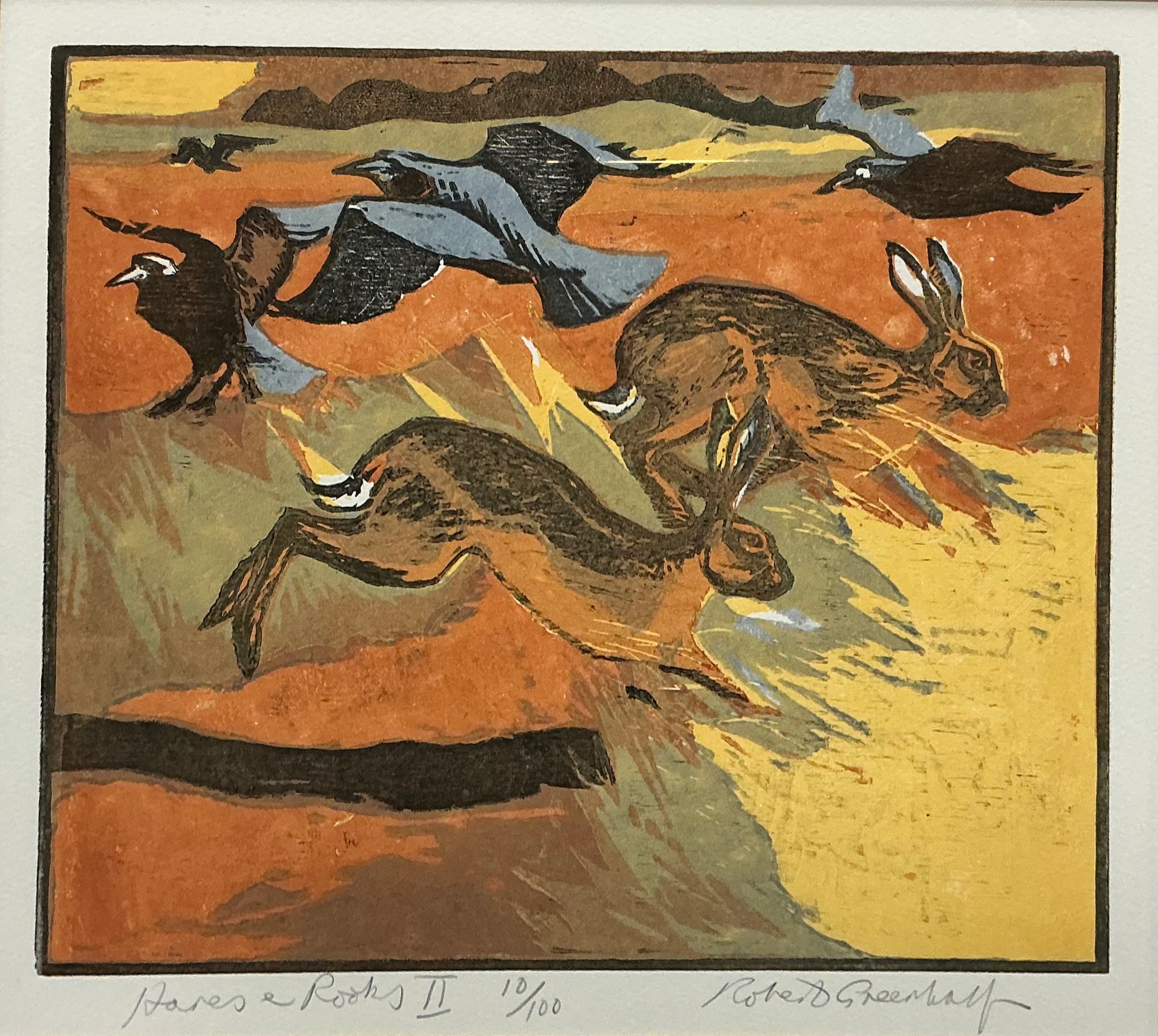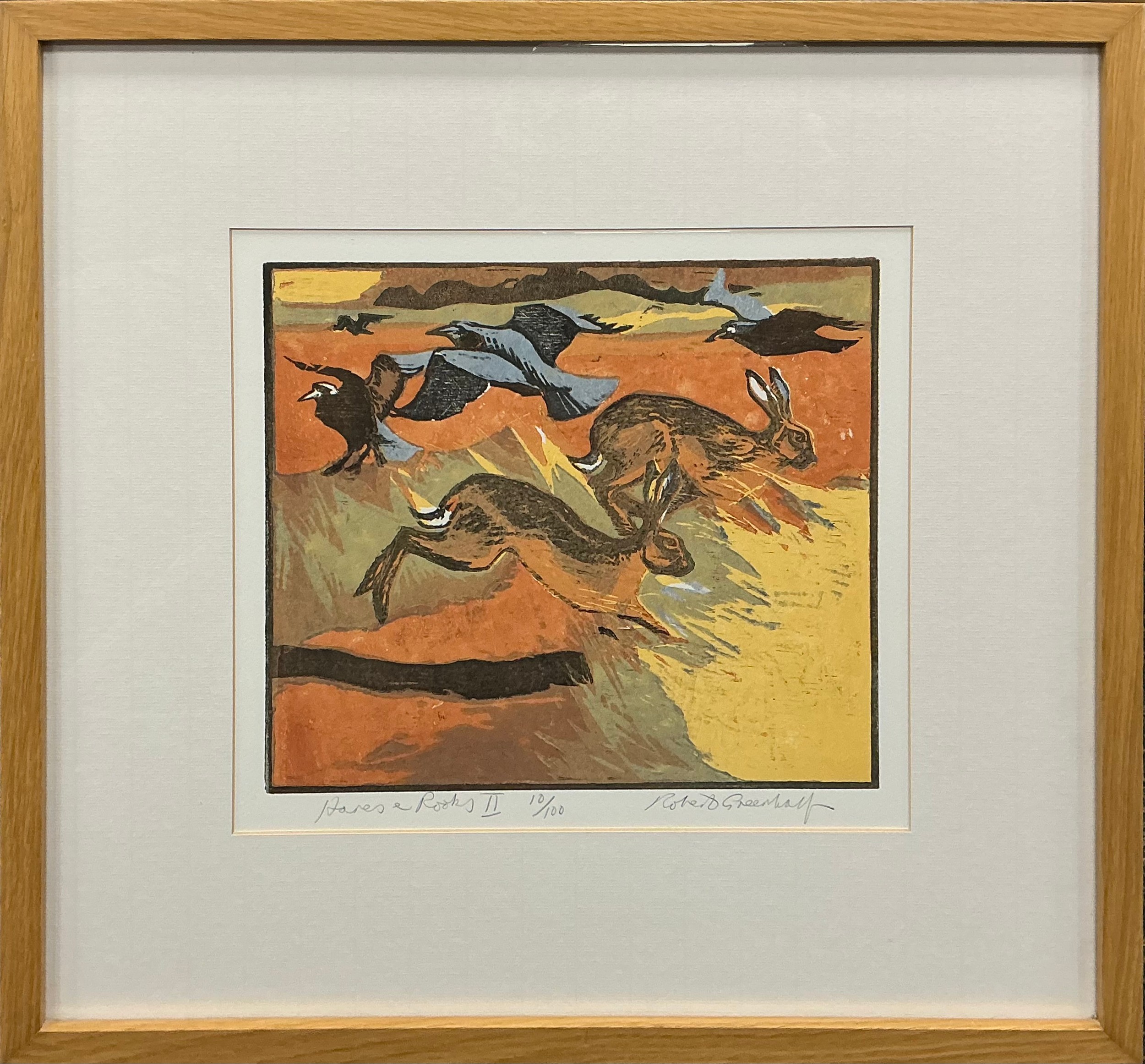 Robert Greenhalf (British, bn. 1950), Hares and Rooks II, signed, titled, and numbered 10/100 in pencil to lower margin, woodcut print, 24cm x 28cm.