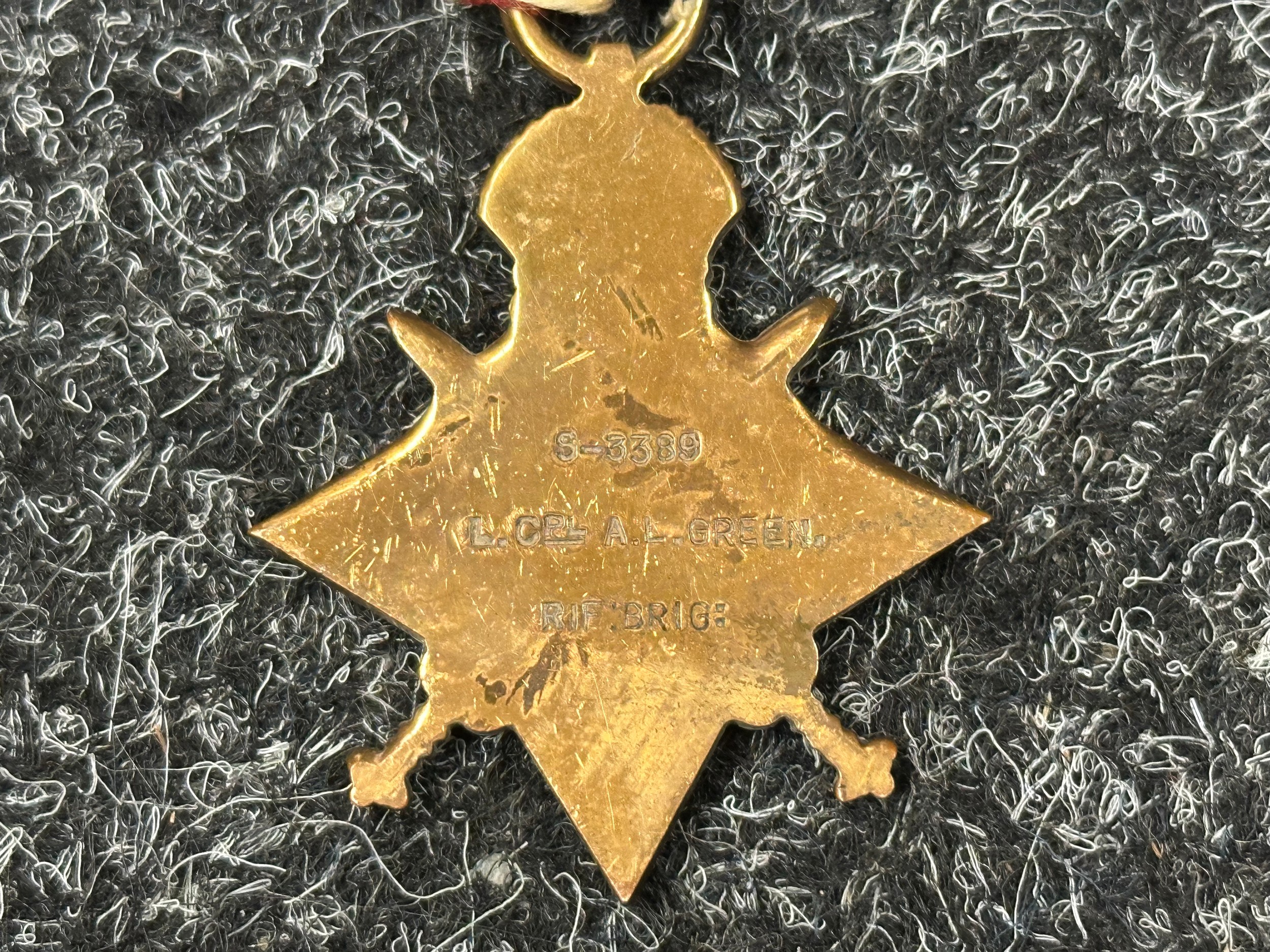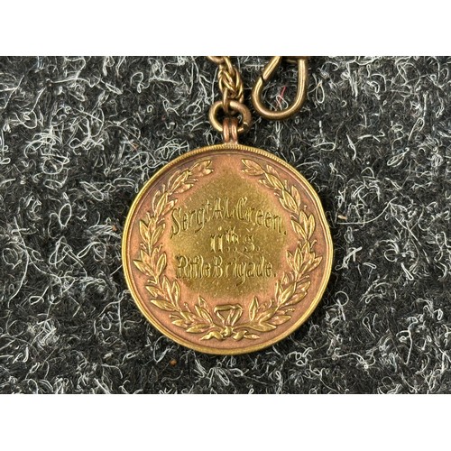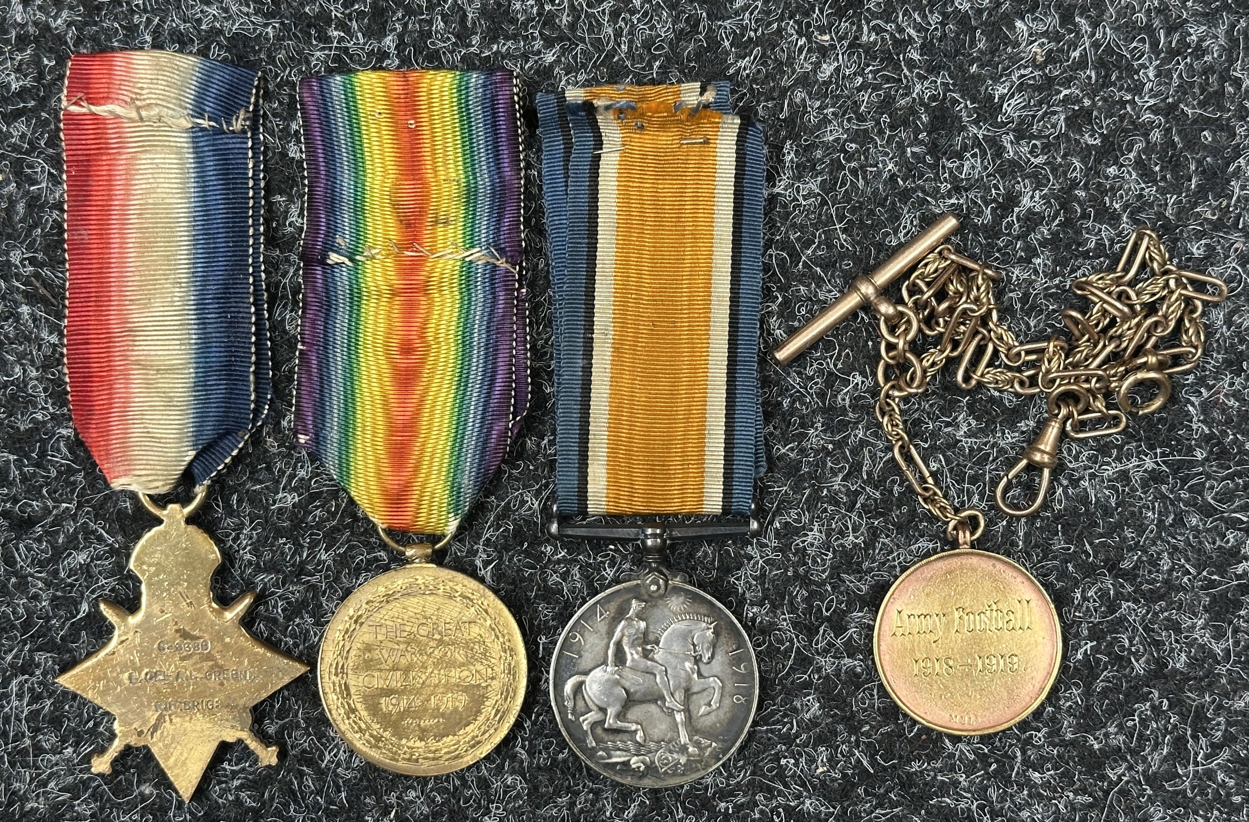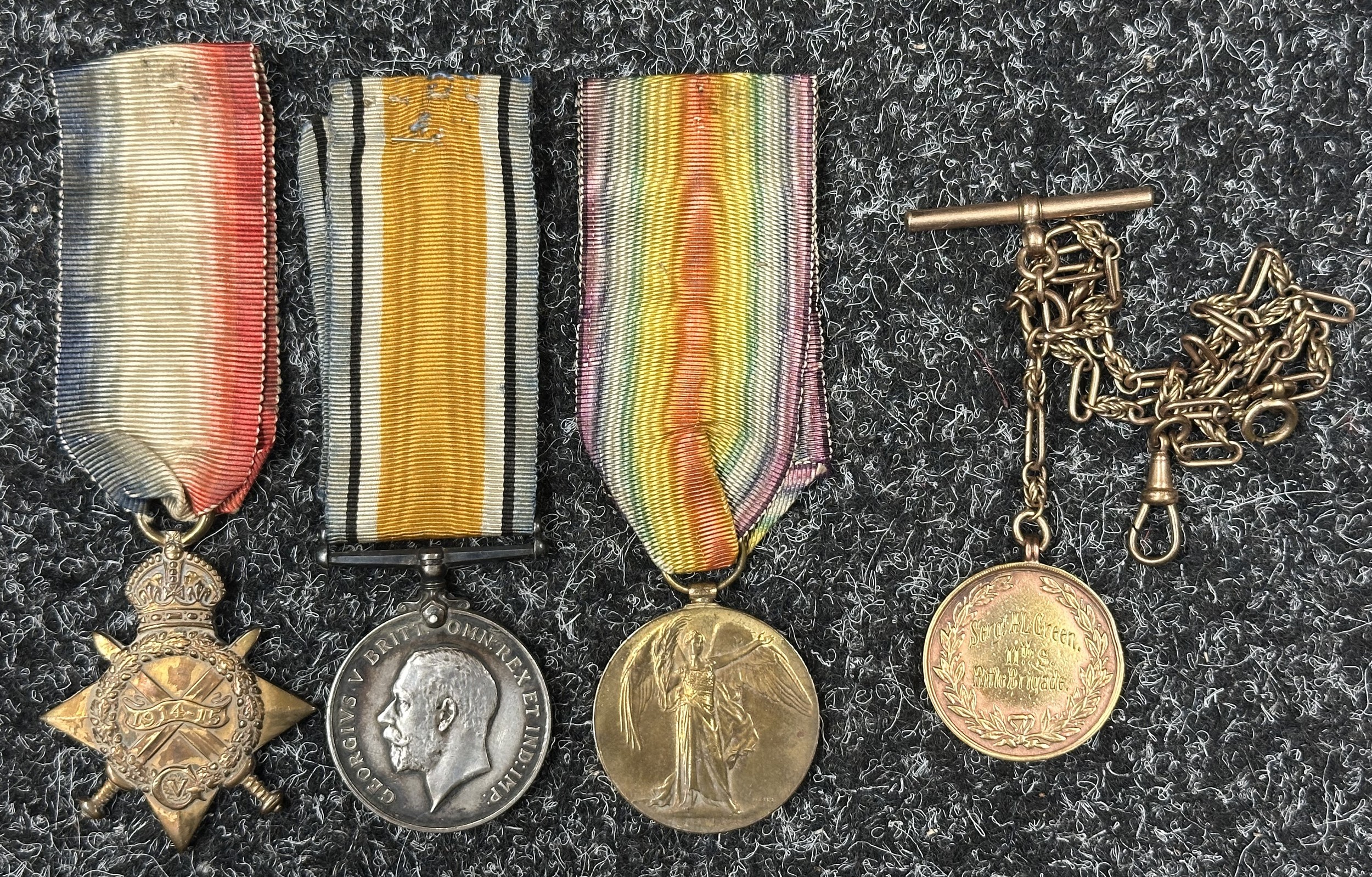 WW1 British Medal group to S-3389 Sjt AL Green, Rifle Brigade compring of 1914-15 Star, War Medal and Victory Medal all complete with original ribbons and a Regimental Army Football 1918-1919 medalion engraved to Sergt AL Green, 11th S Rifle Brigade on a chain.