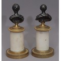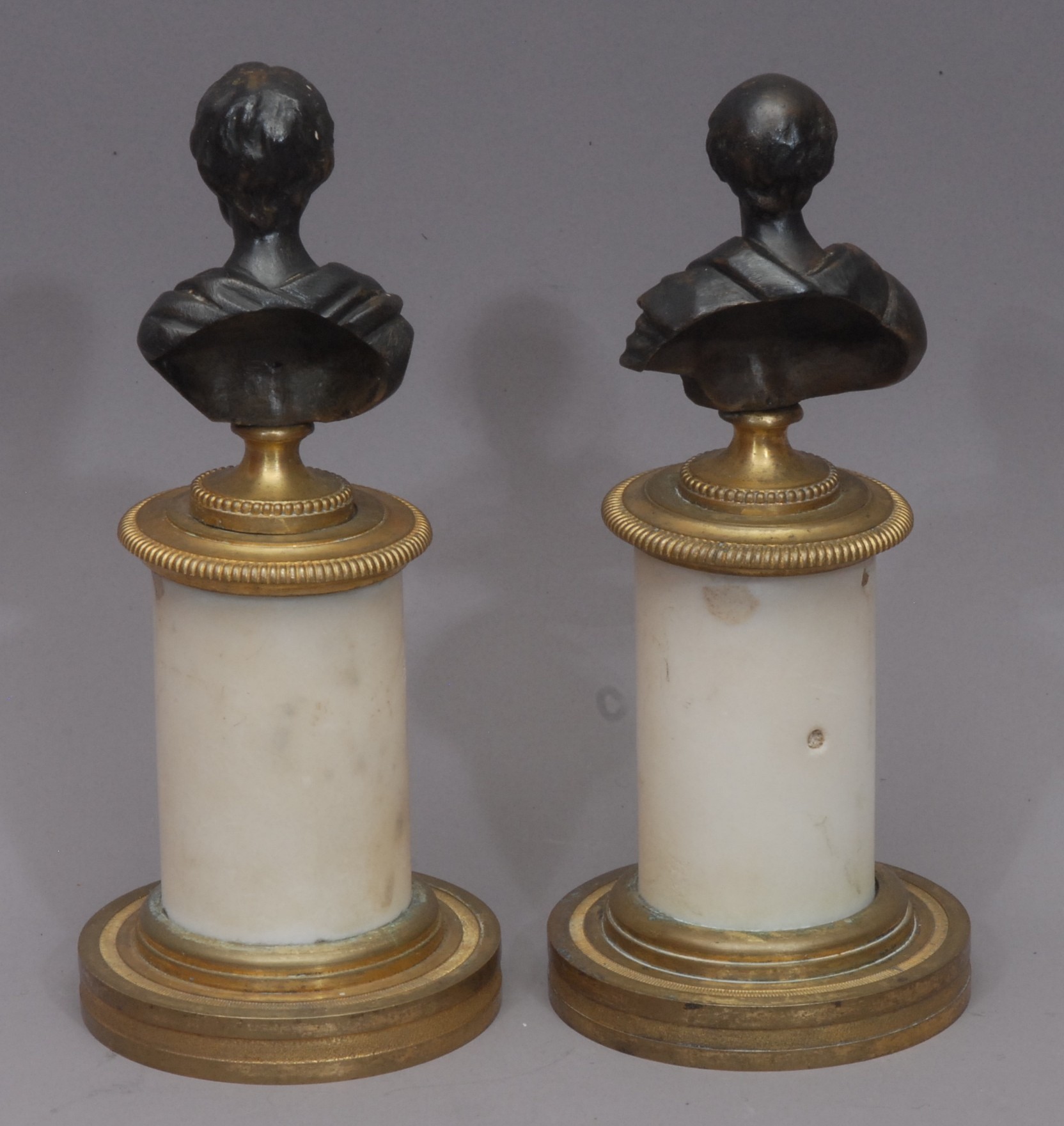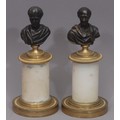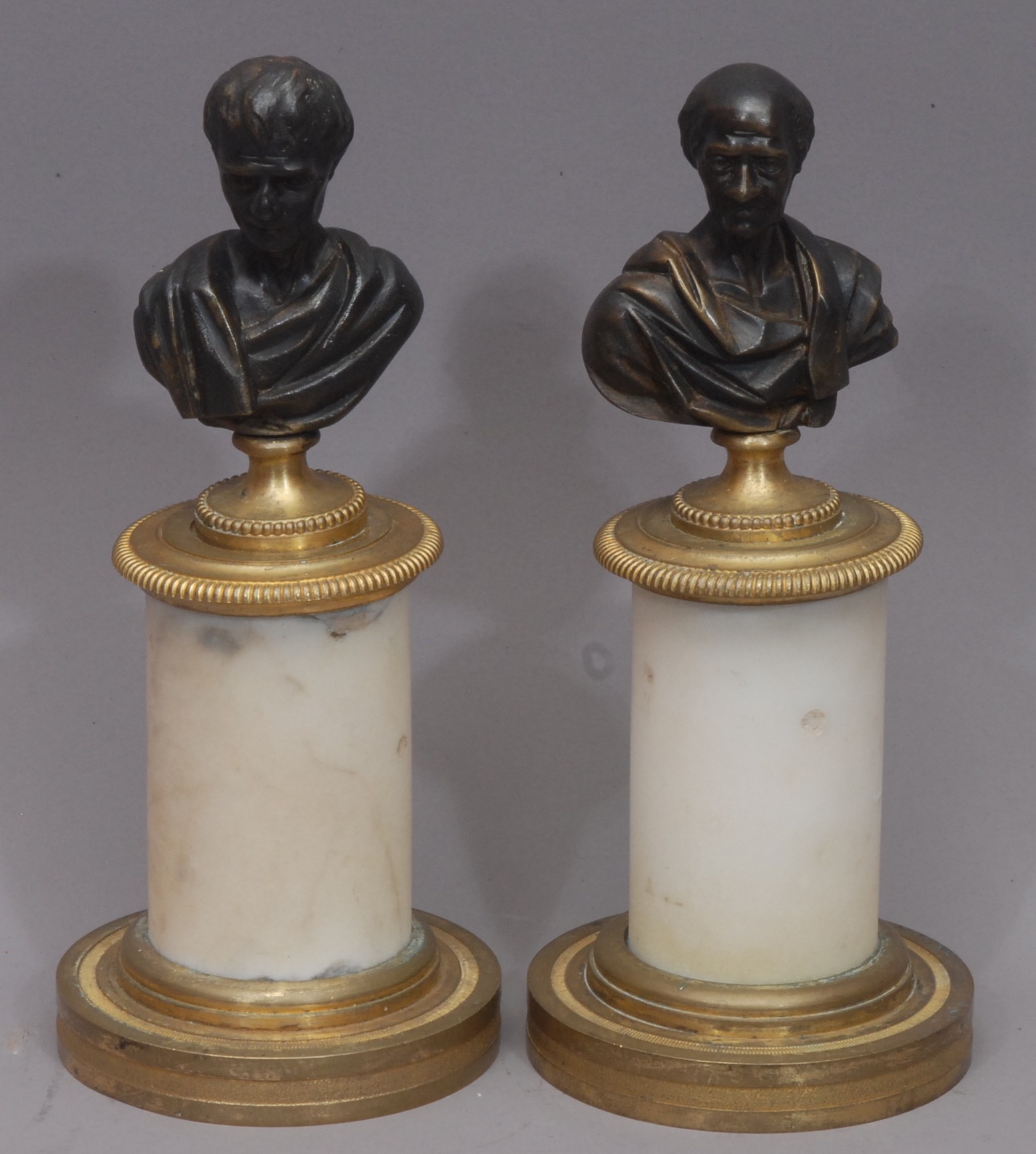 A pair of Regency patinated bronze cabinet busts, Julius Caesar and another, alabaster and gilt metal mounted pedestal bases, the largest 17cm high overall (2)