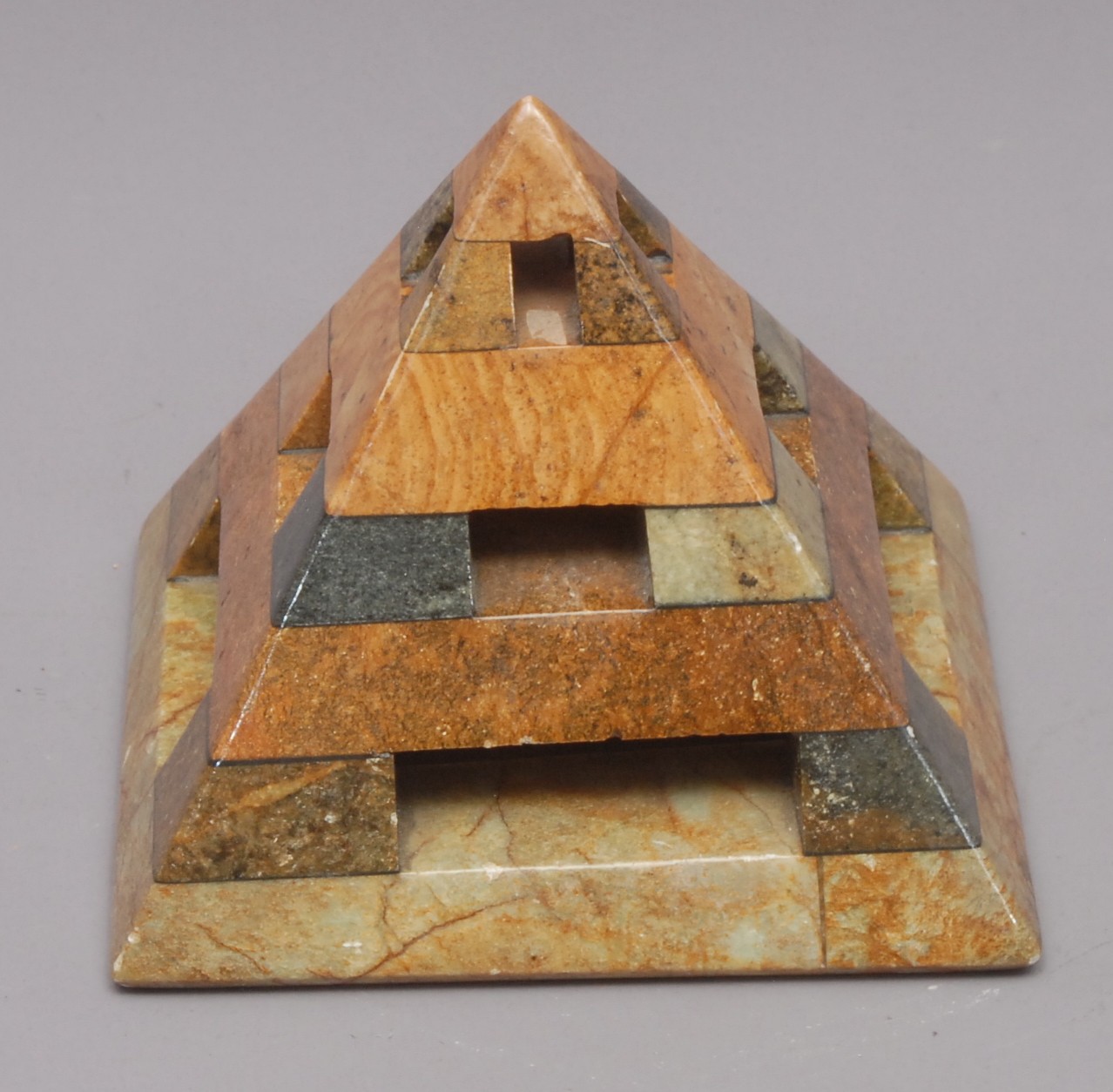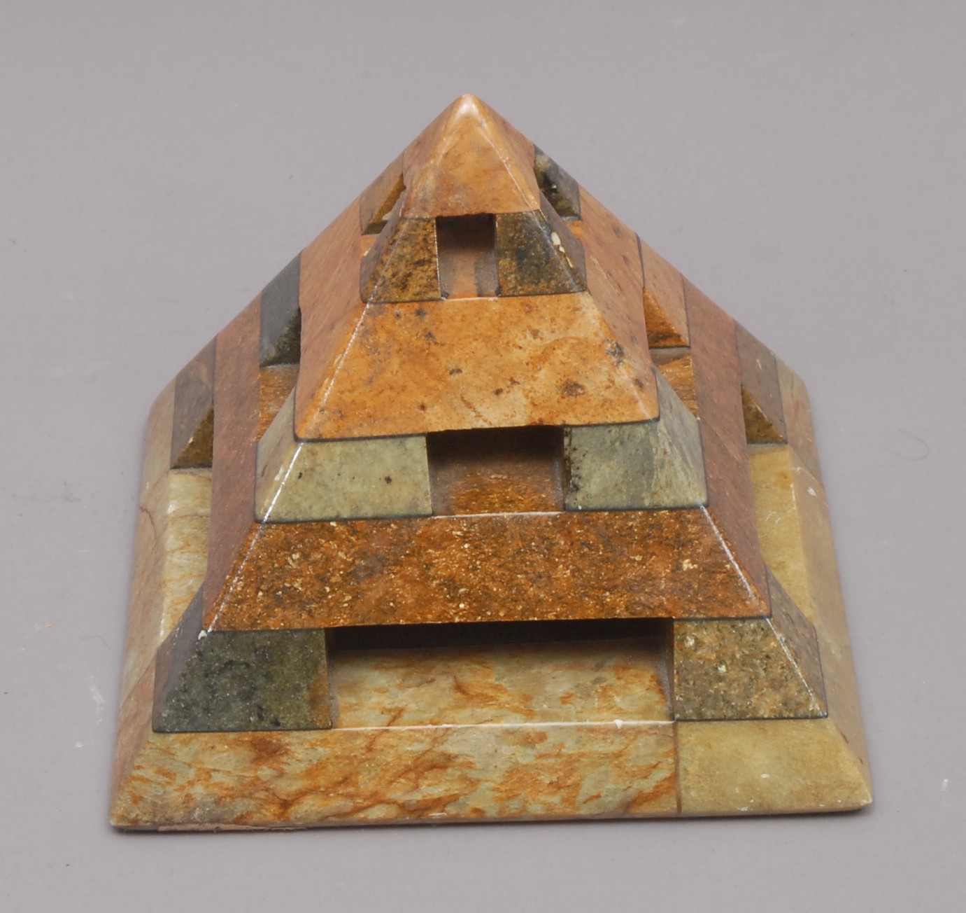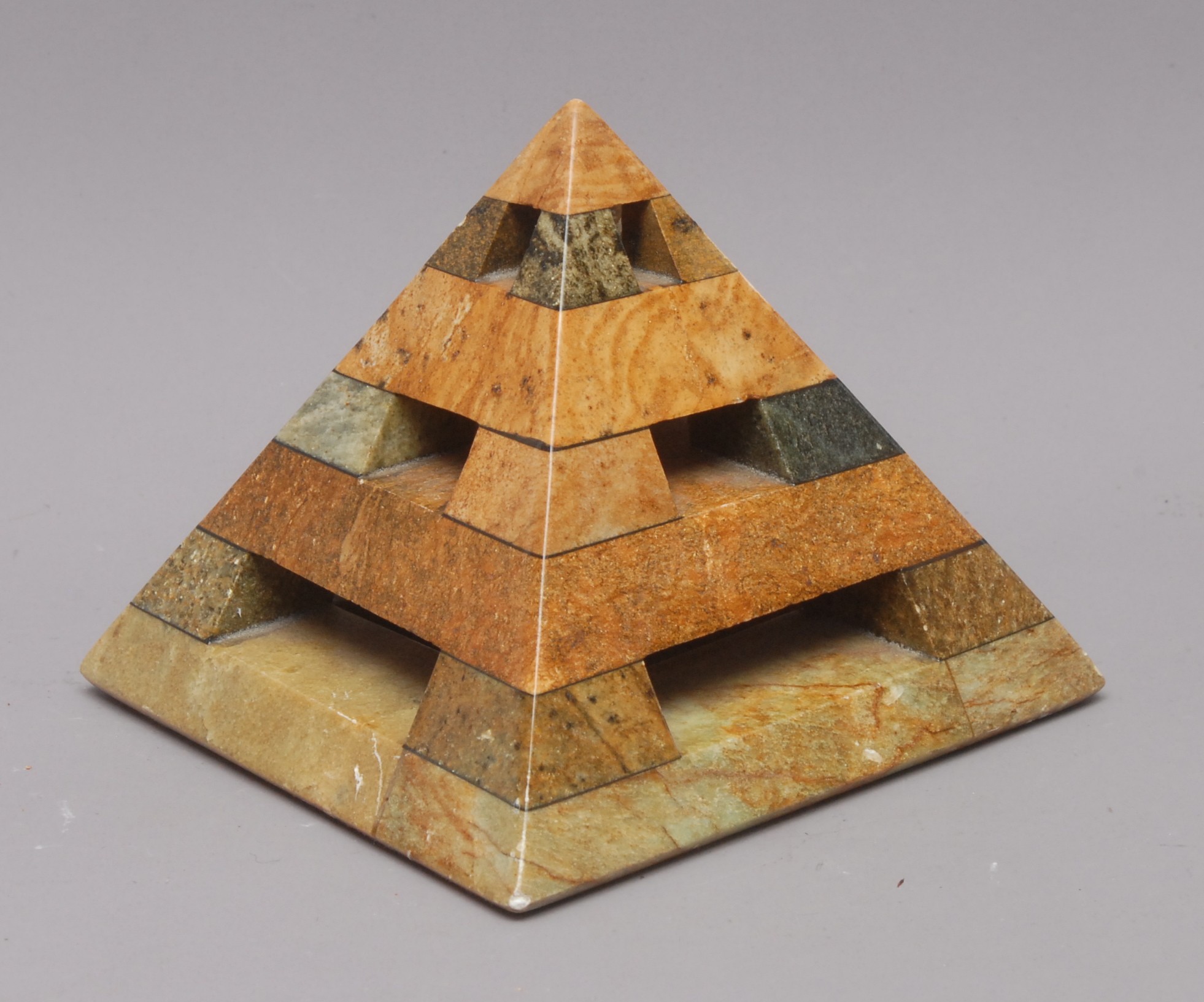 A Grand Tour style marble pyramid desk weight, pierced sides, 10cm high, 20th century