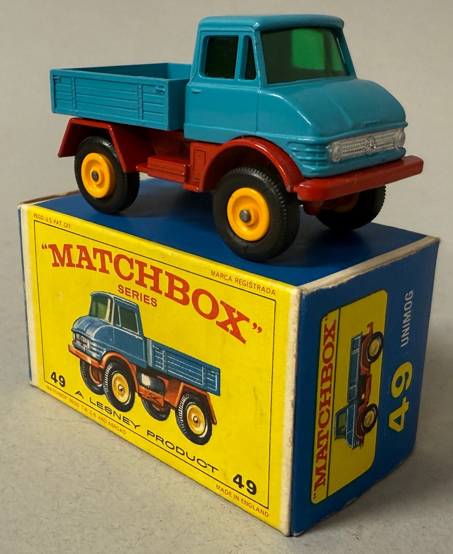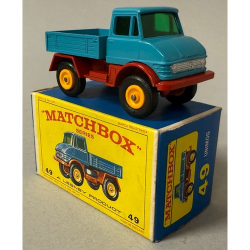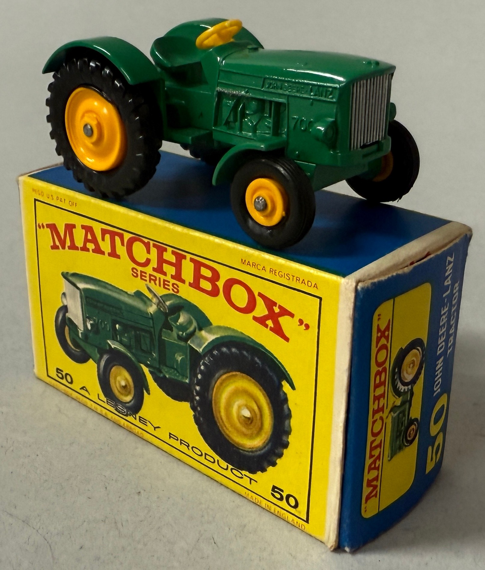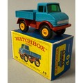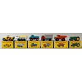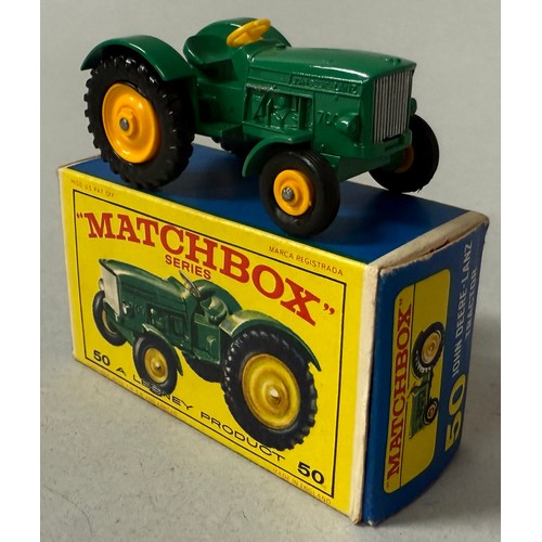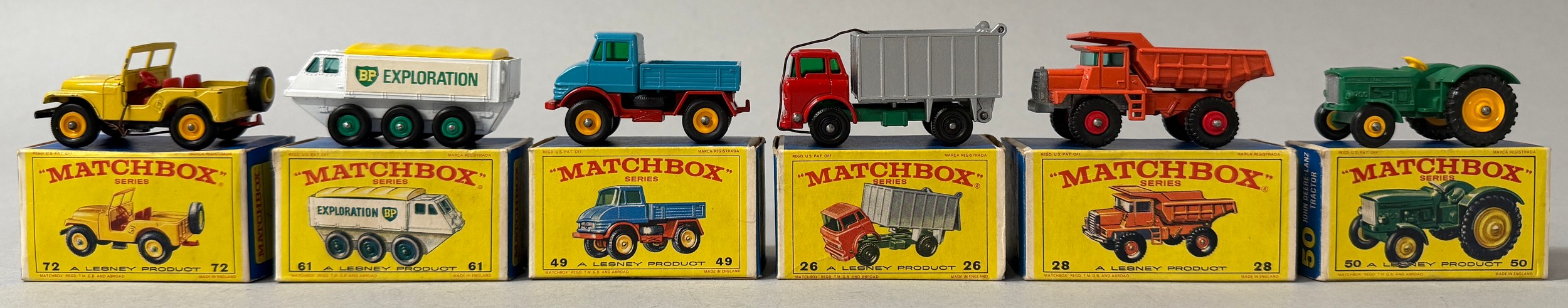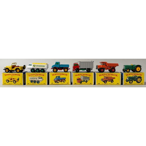 Matchbox - Series, 28 Mack Dump Truck, orange body, boxed; 26 G.M.C. Tipper Truck, red, green and silver body, boxed; 49 Unimog, blue and red body, boxed; 50 John Deere-Lanz Tractor, green body, boxed; 61 Alvis Stalwart, yellow over white body, 'BP Exploration' decal to sides, boxed; 72 Standard Jeep, yellow body, red interior, boxed, all blue and yellow cardboard boxes (6)
