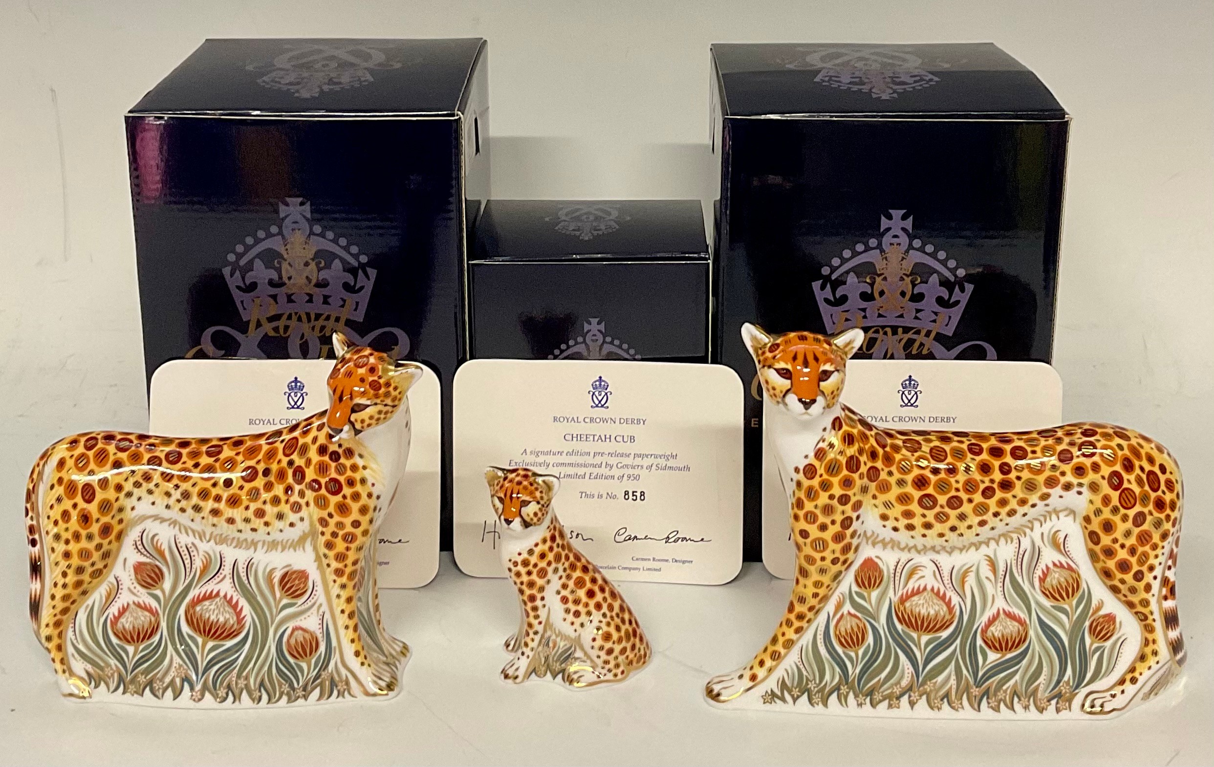 A Royal Crown Derby paperweight family, comprising Cheetah Daddy, Cheetah and Cheetah Cub, exclusively commissioned by Goviers of Sidmouth, a signature pre-release designed by Carmen Roome, limited edition 858/950, gold stoppers, the father 17cm long, the mother 13cm high, the cub 7.5cm high, printed marks in gold with facsimile signatures, certificates, each boxed (3)
