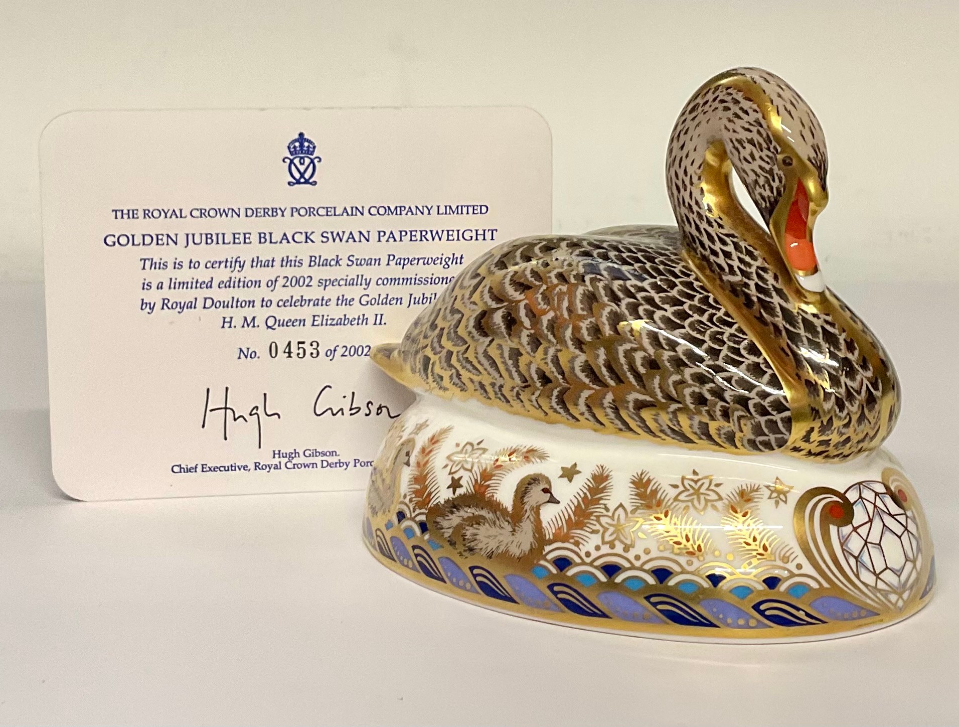 A Royal Crown Derby paperweight, Black Swan, specially commissioned to celebrate the Golden Jubilee of H.M Queen Elizabeth II, limited edition 453/2,002, 21st anniversary gold stopper, 14cm wide, facsimile signed on the base by Sue Rowe, printed mark in red, certificate