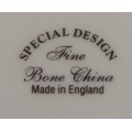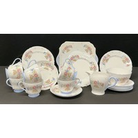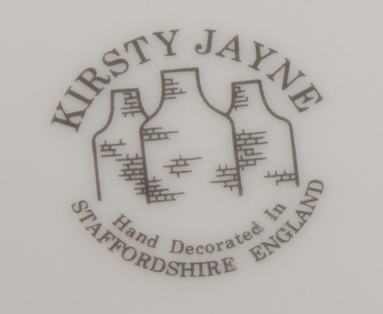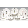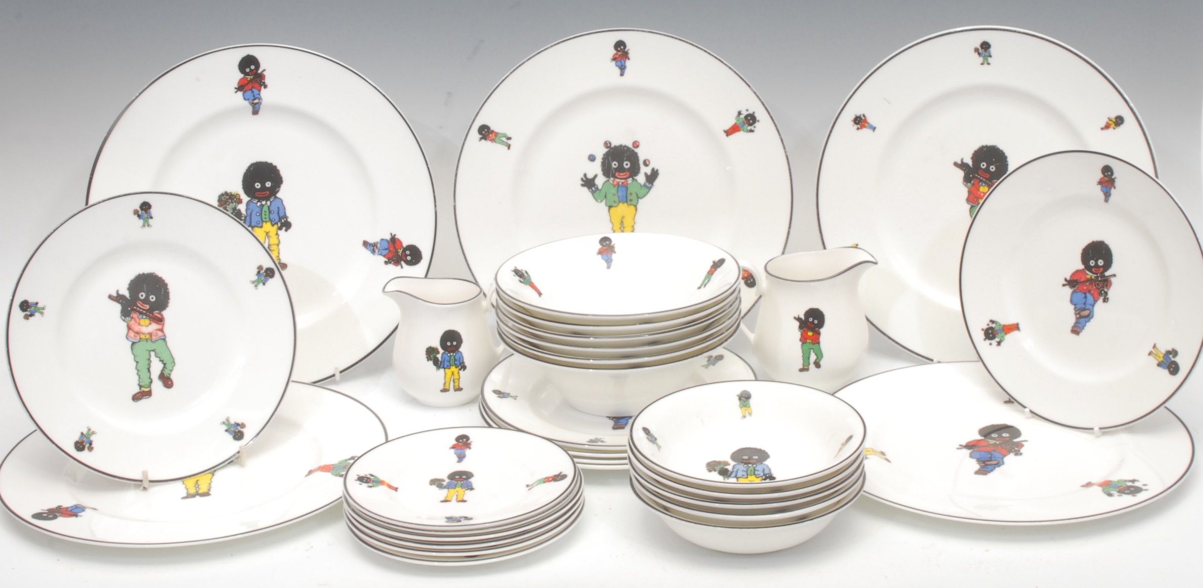 A Staffordshire dinner service and breakfast service, transfer printed with 'Gollies' posing as musicians, jugglers and suitors, comprising five dinner plates, six side plates, six tea plates, five fruit bowls, six cereal dishes, milk jug and cream jug, assorted factory marks including Kirsty Jayne, c.1980