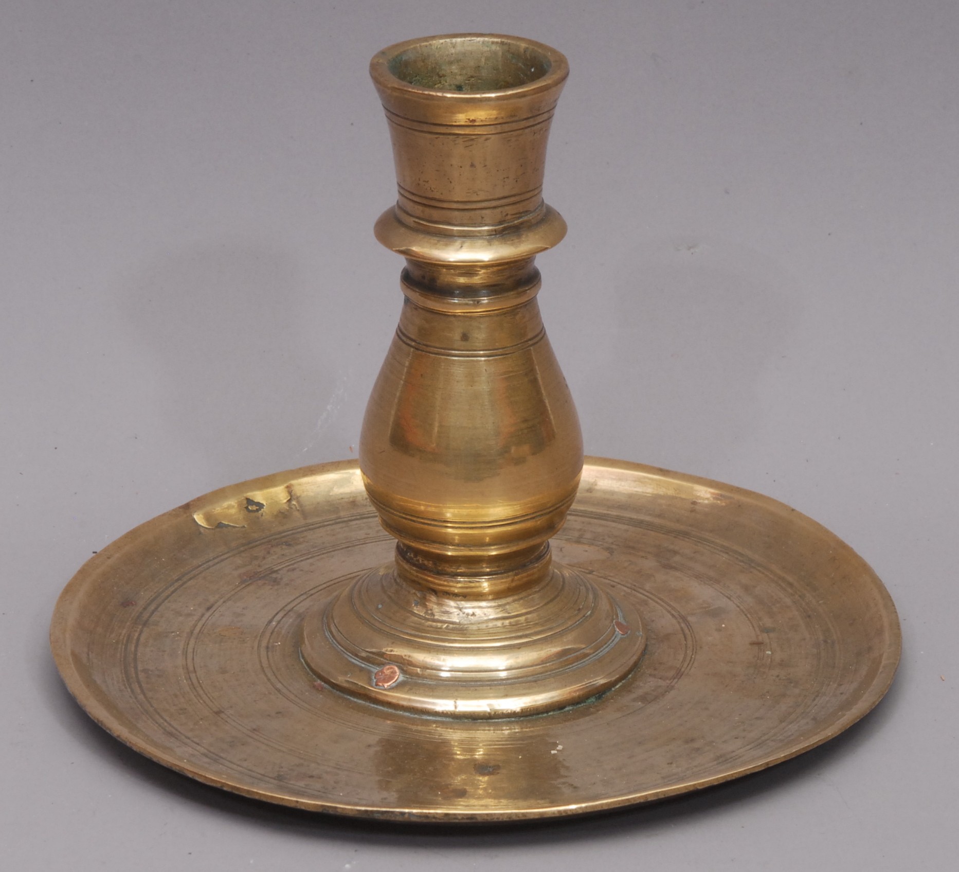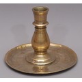 A 19th century Islamic brass candlestick, dished base, 16cm ...