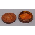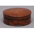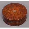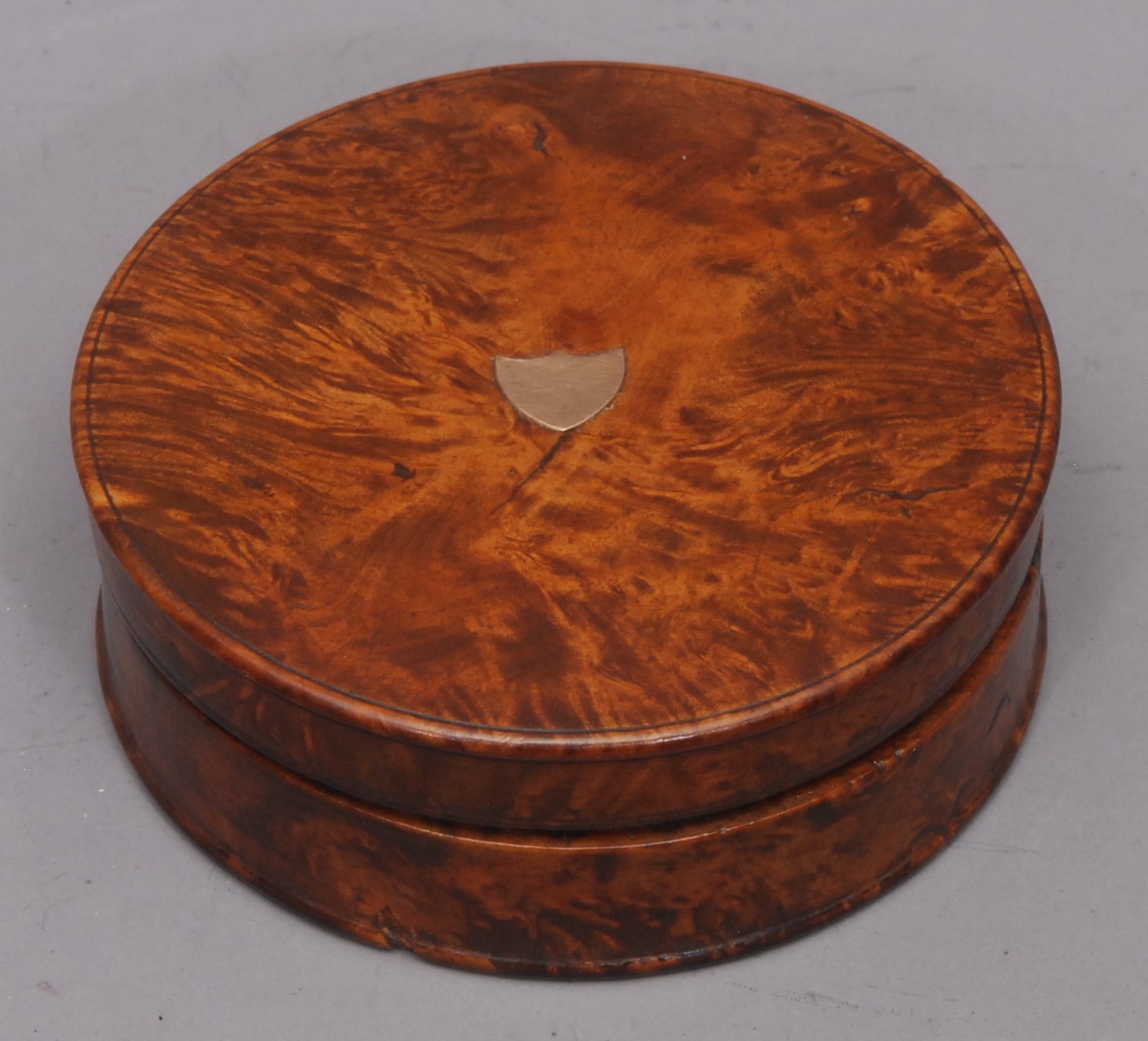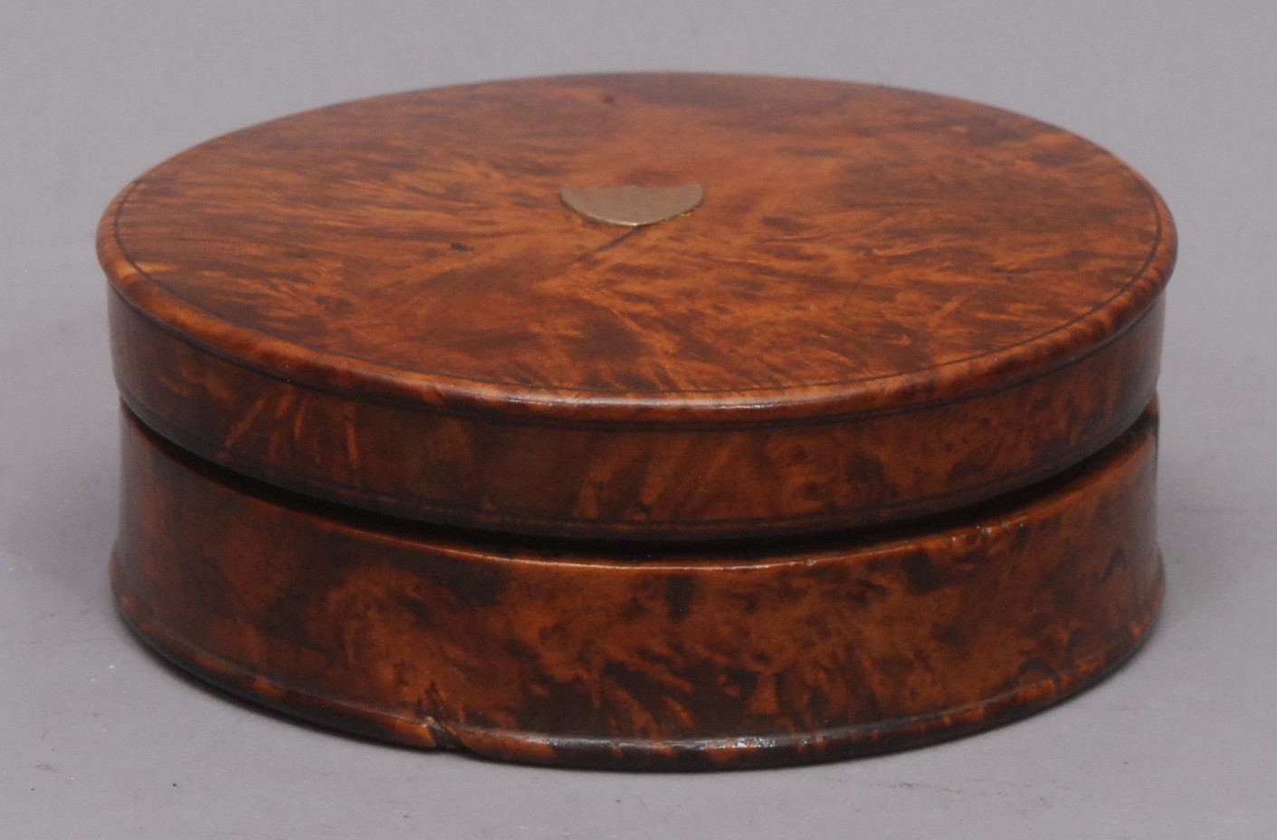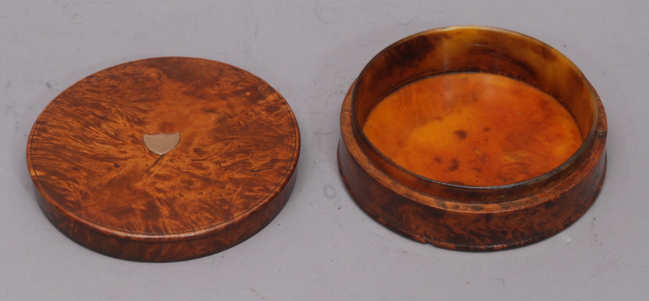 A 19th century faux-walnut circular snuff box, push close cover centred by a gold coloured metal shield shaped cartouche, 2.5cm high, 7cm diameter, c. 1840