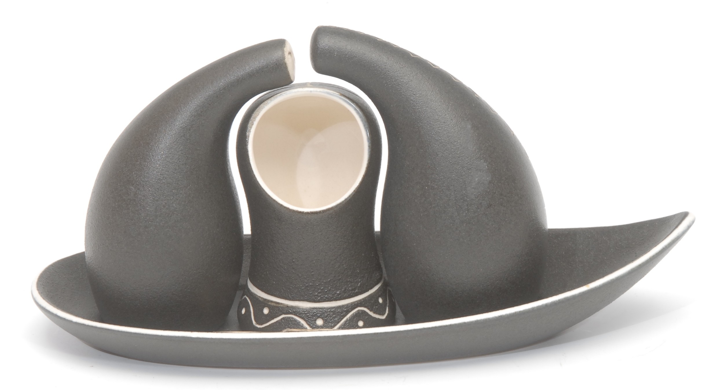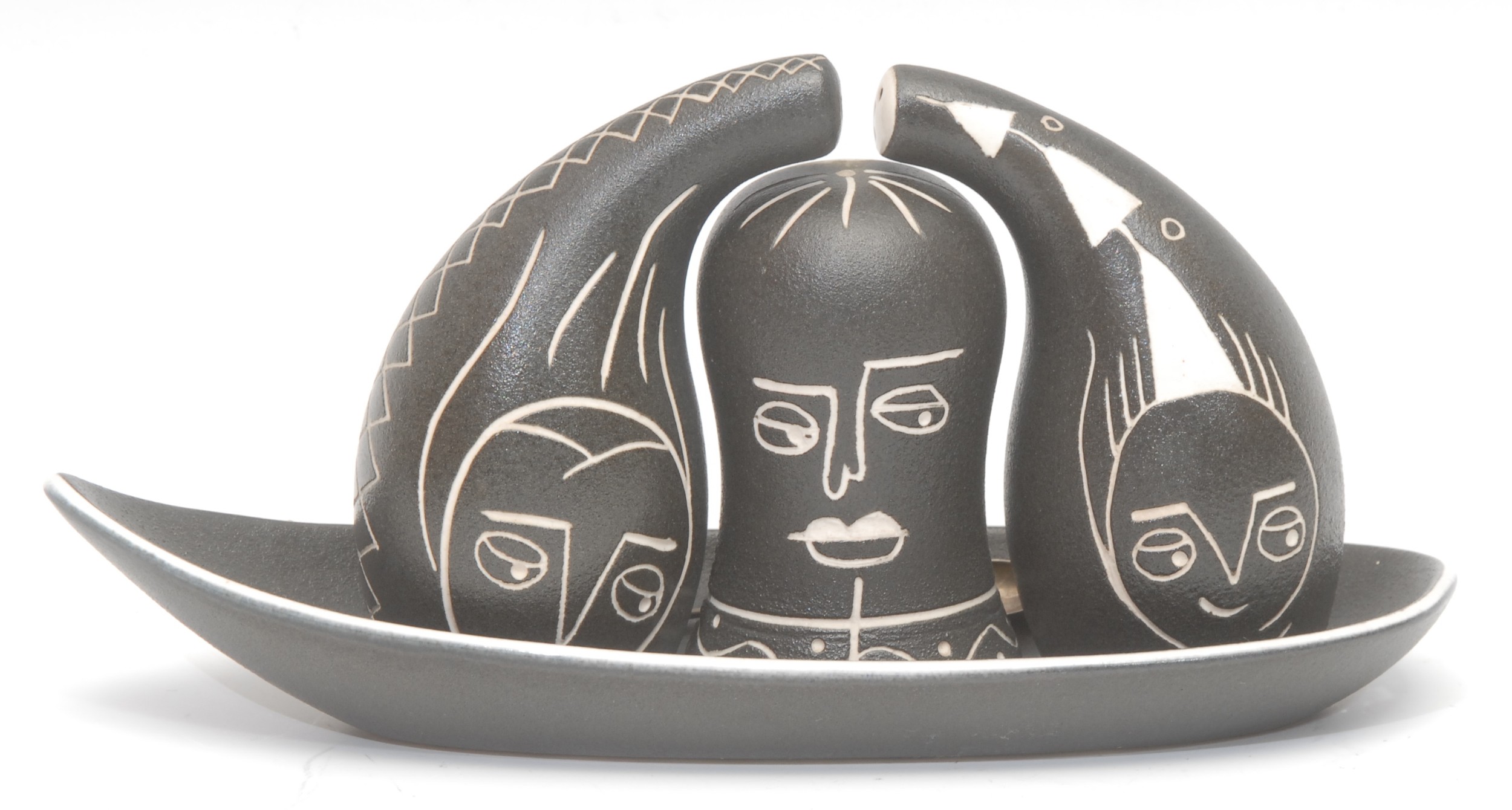 A Denby Tigo Ware clown pattern cruet set, designed by Tibor Reich (1916-1996), 10cm high, 20.5cm wide