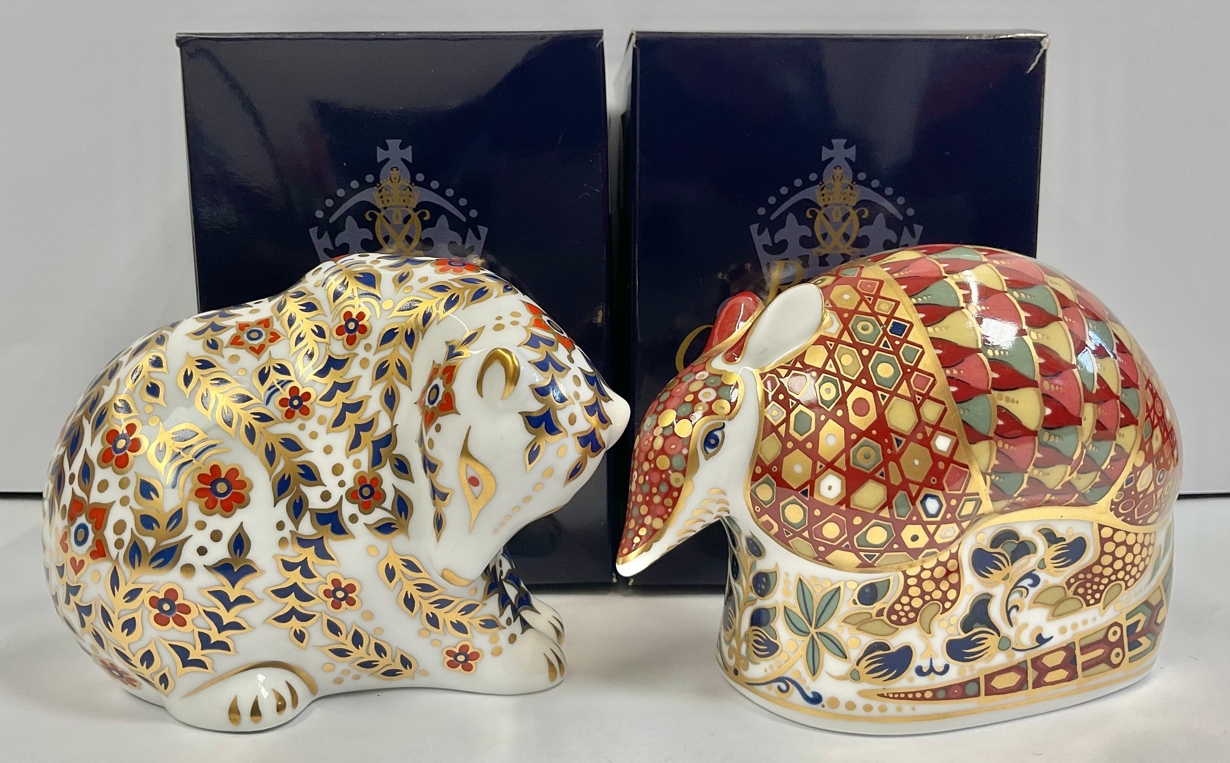 A Royal Crown Derby paperweight, Armadillo, gold stopper, 8.5cm, printed mark in red, boxed; another, Russian Bear, gold stopper, 9cm, printed mark in red, boxed (2)