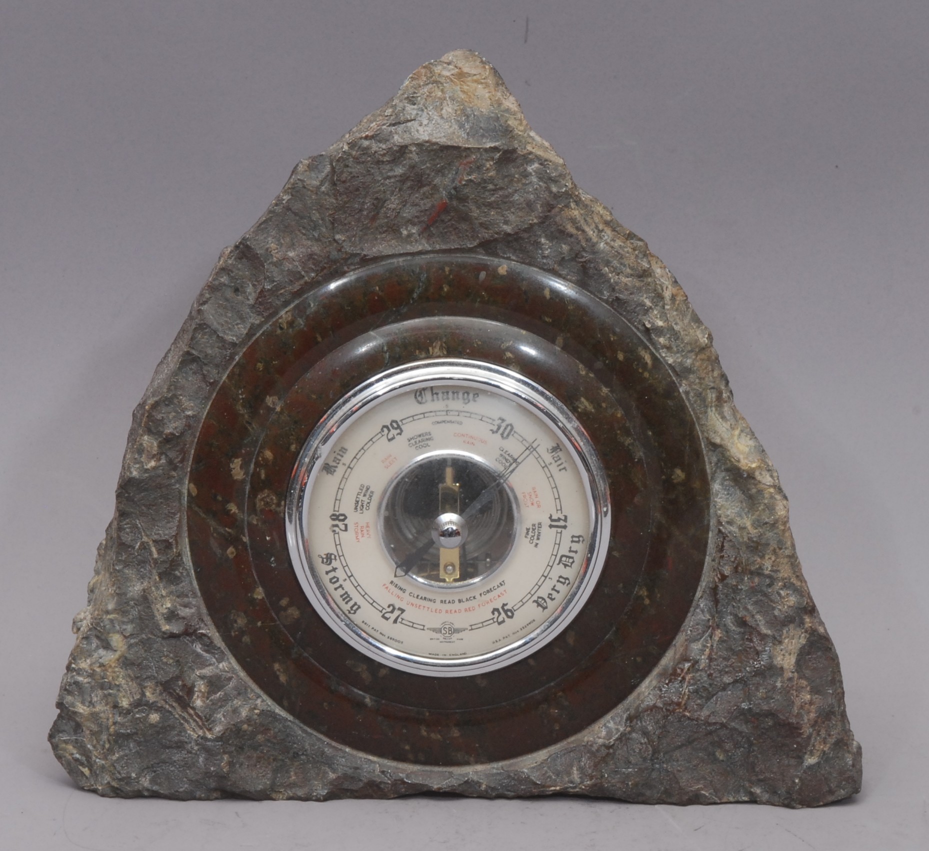 A Cornish serpentine aneroid barometer, the enamel dial insc...