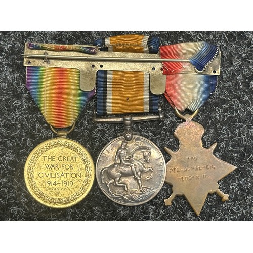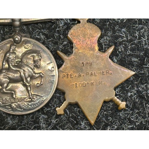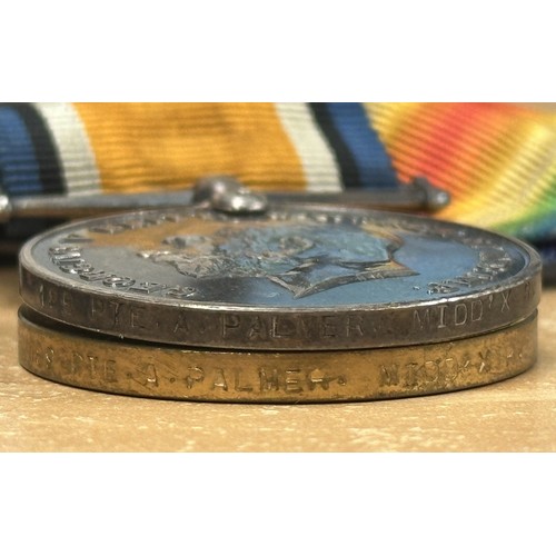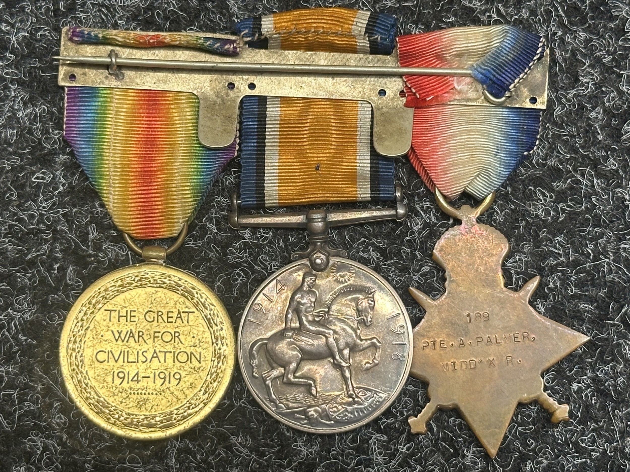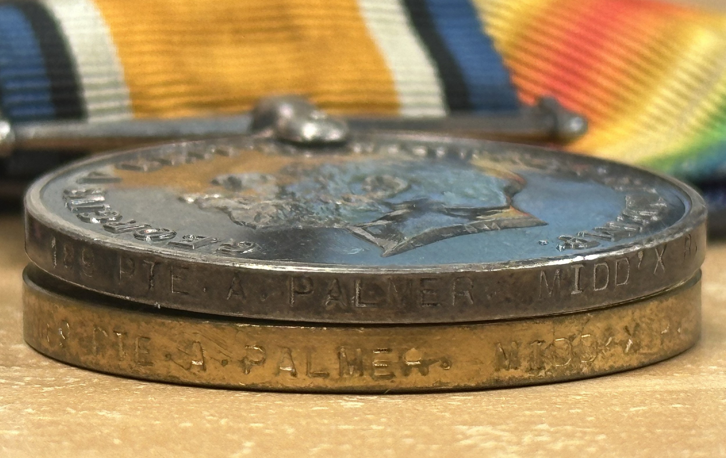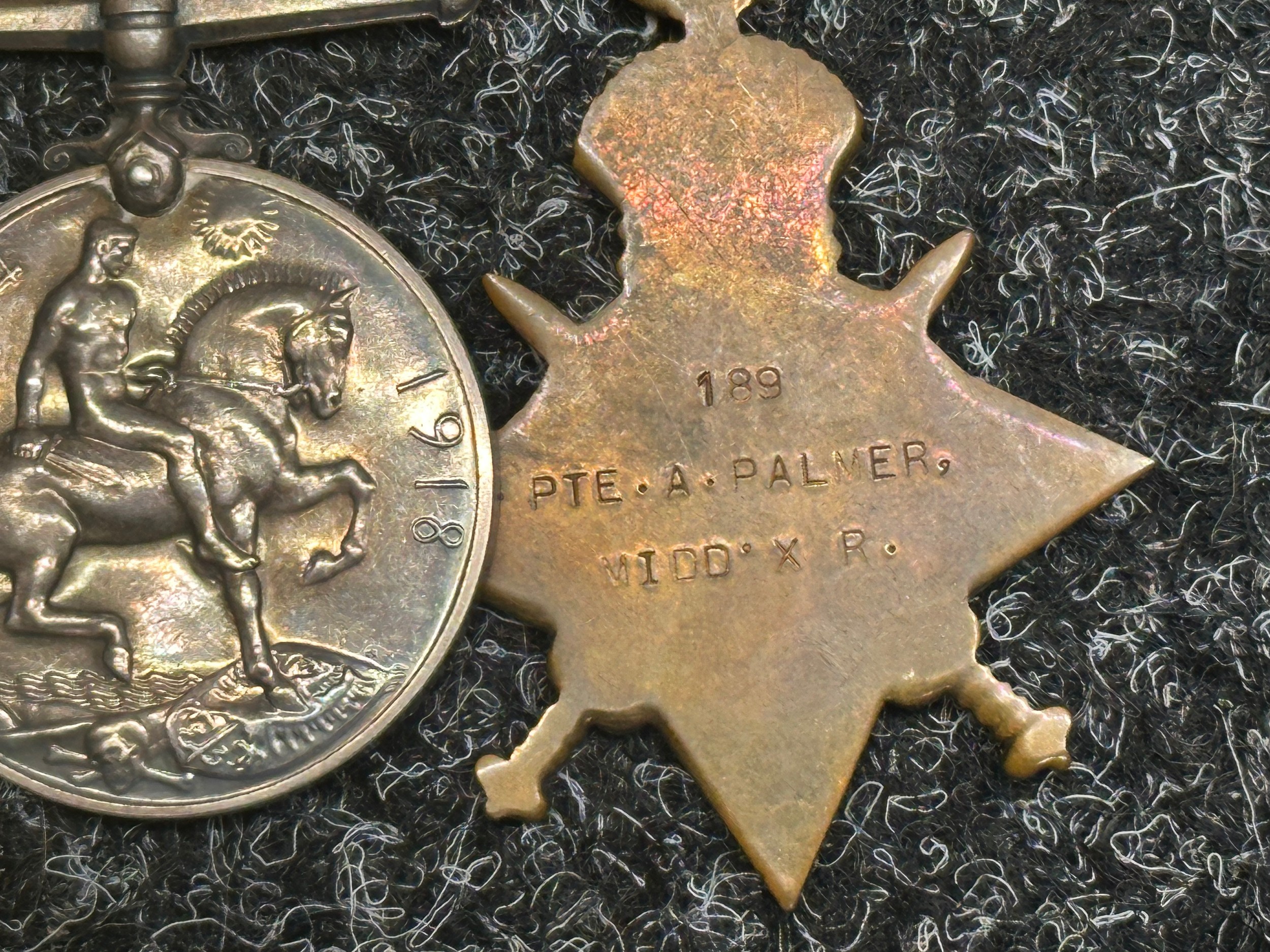 WW1 British 1914-15 Star, War Medal and Victory Medal to 189 Pte A Palmer, Middlesex Regiment. Complete with original ribbons and mounted on a bar.