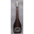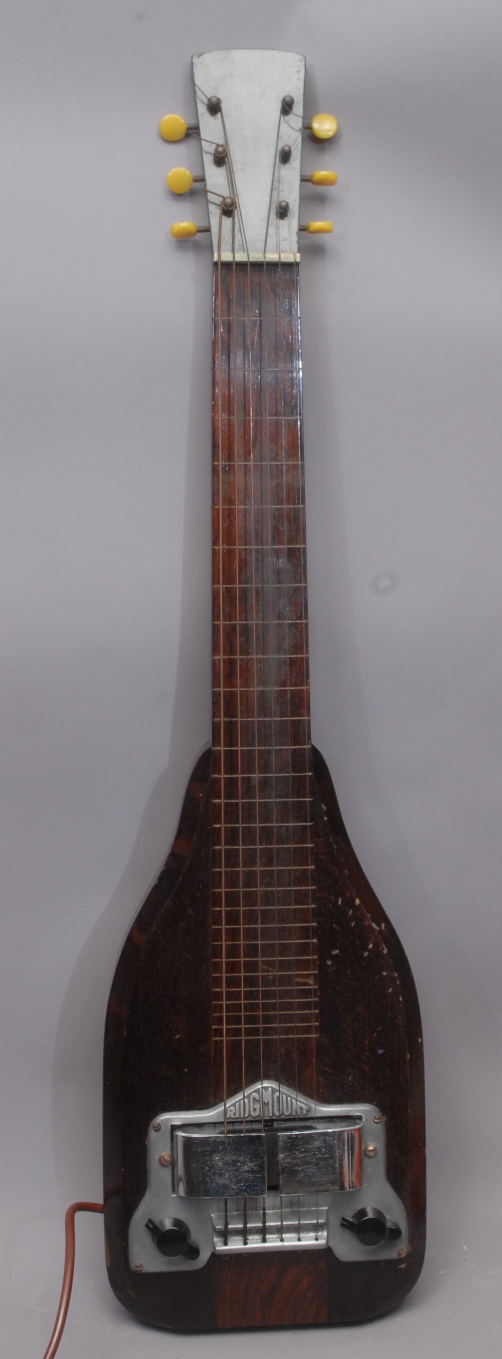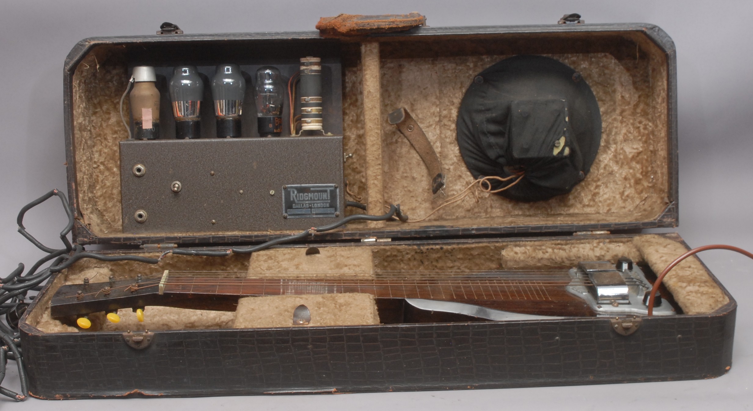 A rare and unusual interesting 1930s/40s Ridgmount Rosewood and oak six string Lap guitar, 80cm long, cased with built in four valve amplifier and speaker, marked Dallas, London