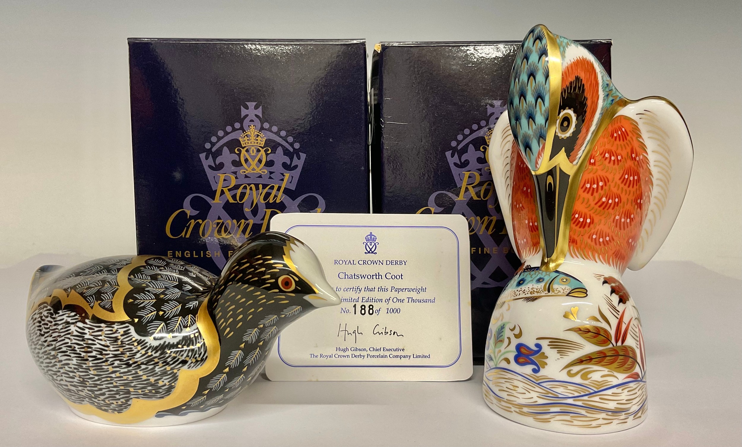 A Royal Crown Derby paperweight, Chatsworth Coot, limited edition 188/1,000, gold stopper, 14cm long, printed mark in red, certificate, boxed; another, Kingfisher, gold stopper, 12.5cm high, printed mark, boxed (2)