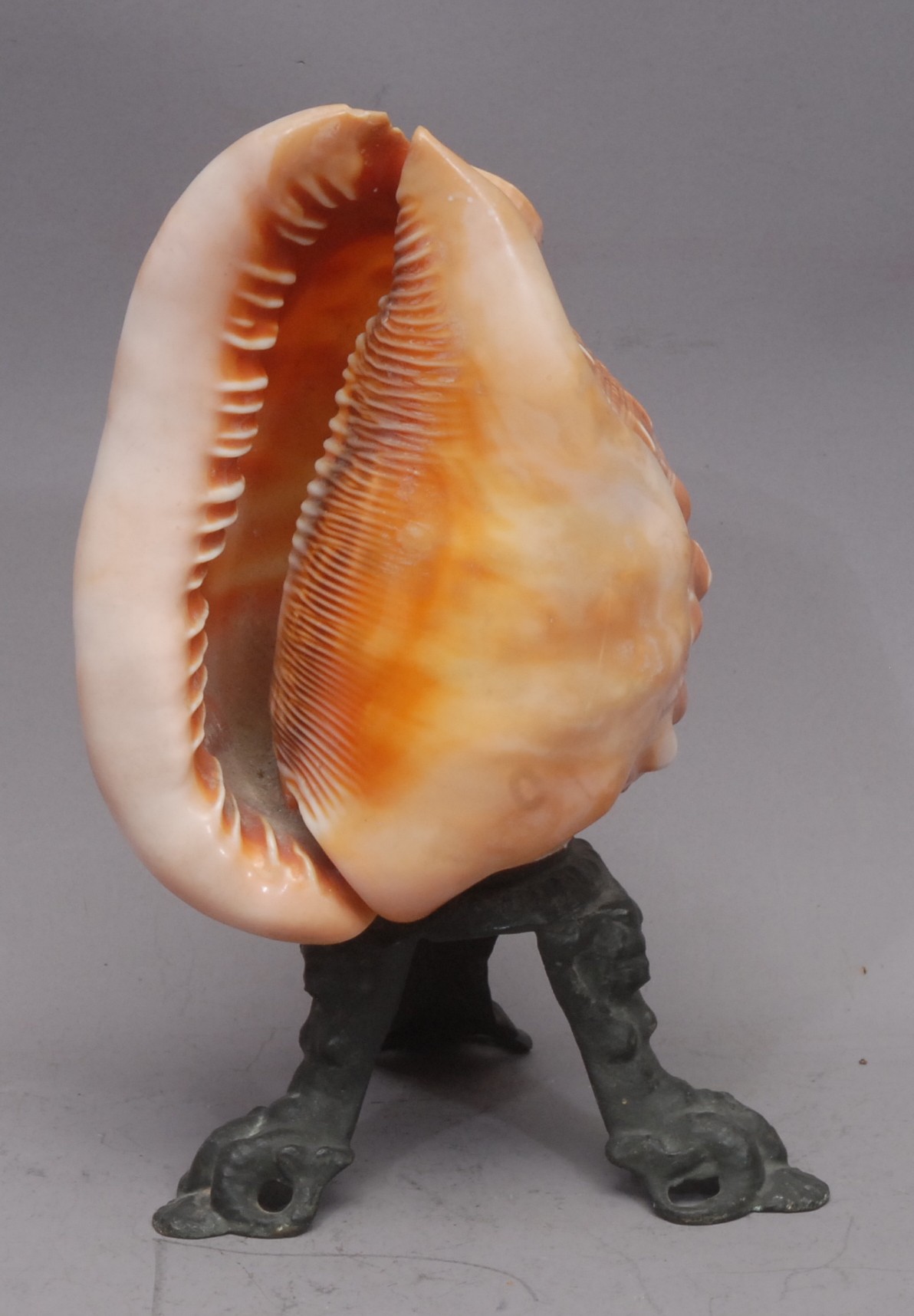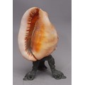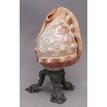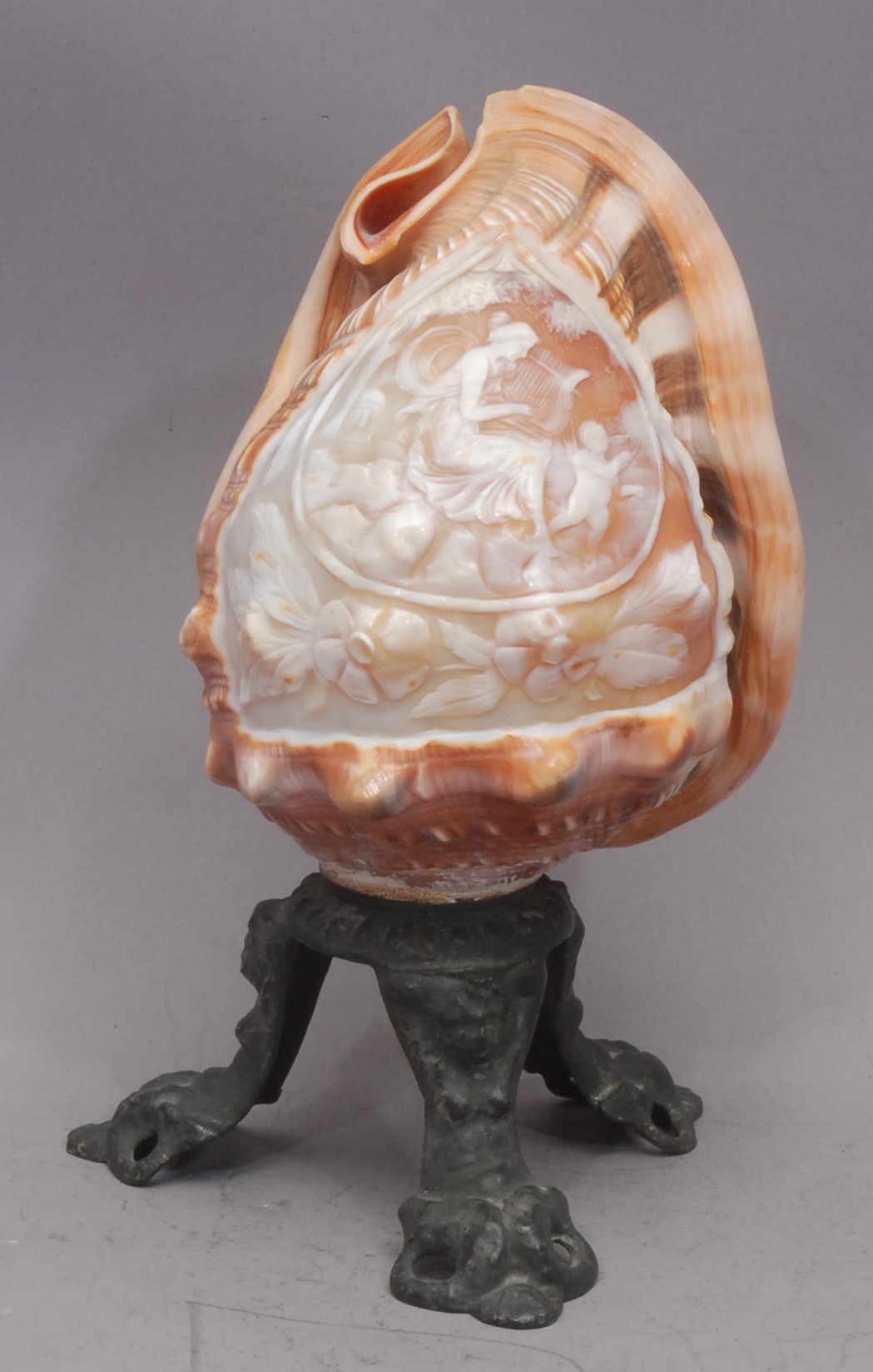 A 19th century Italian cameo shell, worked with Terpsichore, goddess of dance, attended by a cherub in an Arcadian landscape, cast metal herm supports, 21cm high overall