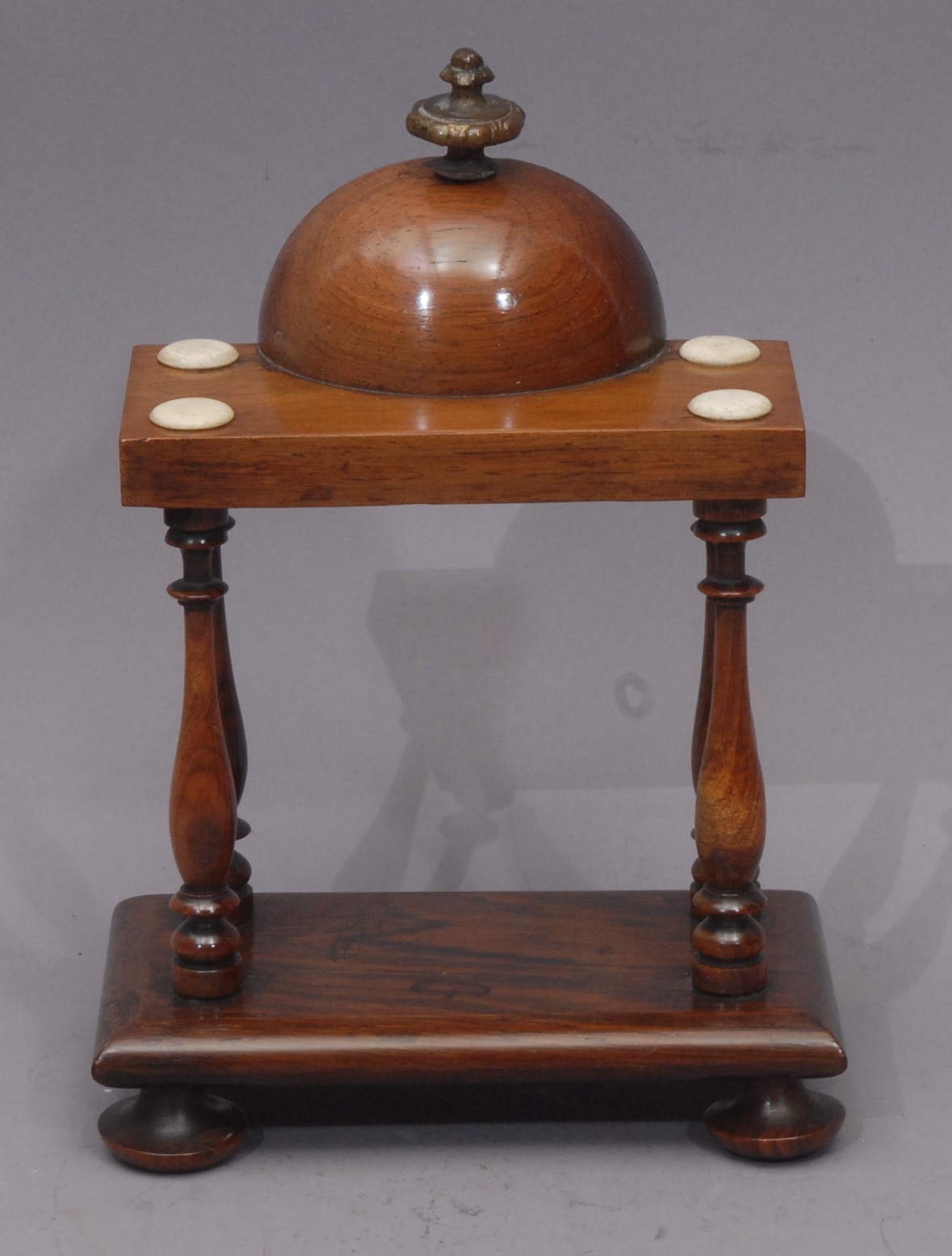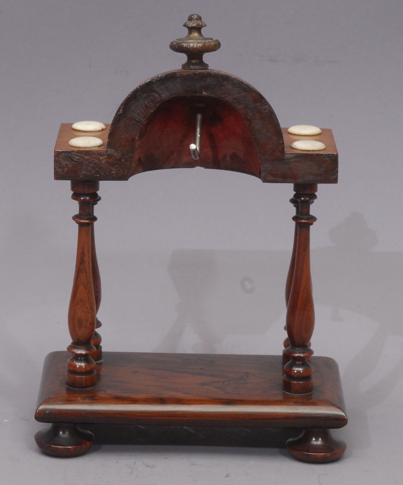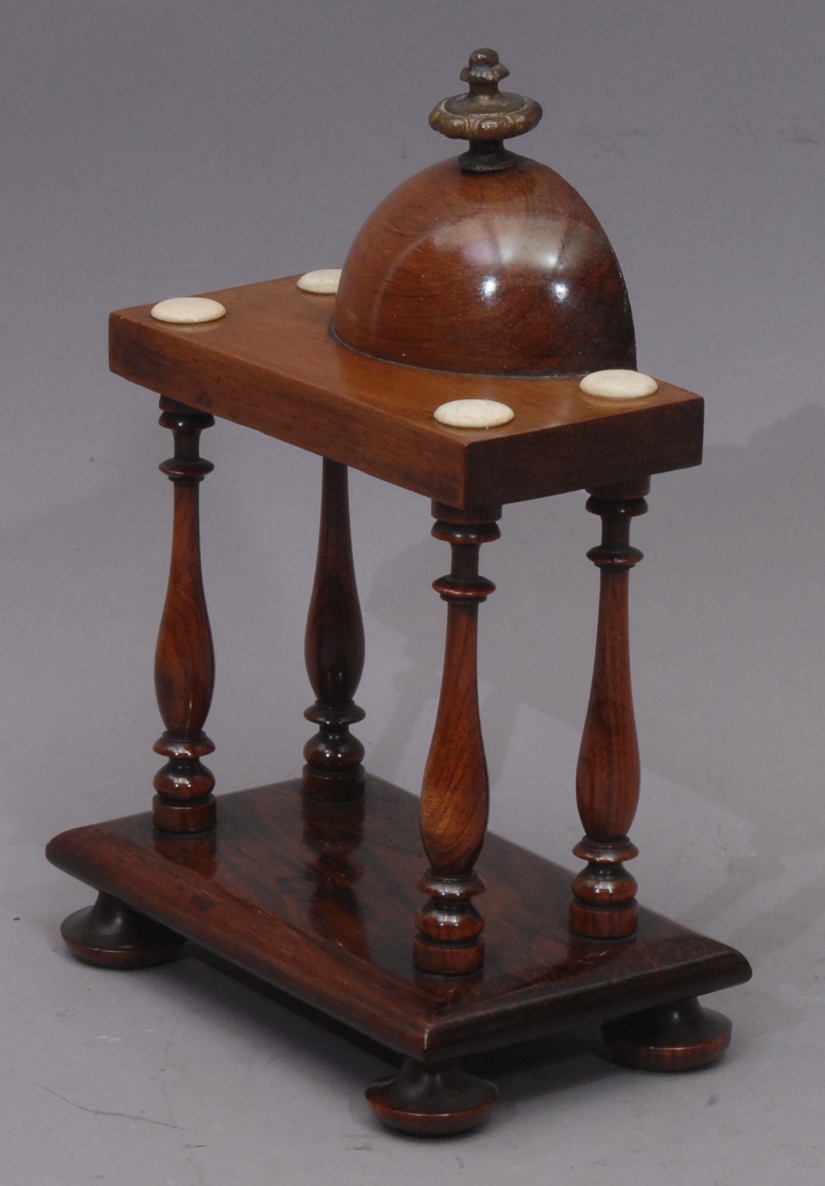 A George IV architectural portico pocket watch stand, the demi-cupola with brass finial, bone roundels to angles, turned pillars, bun feet, 19.5cm high, c.1825