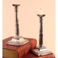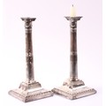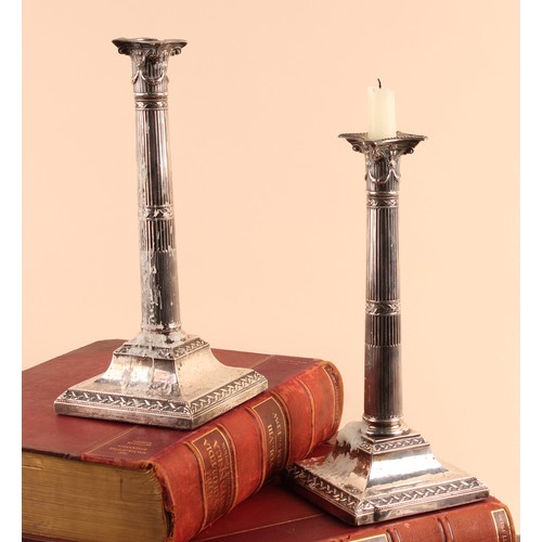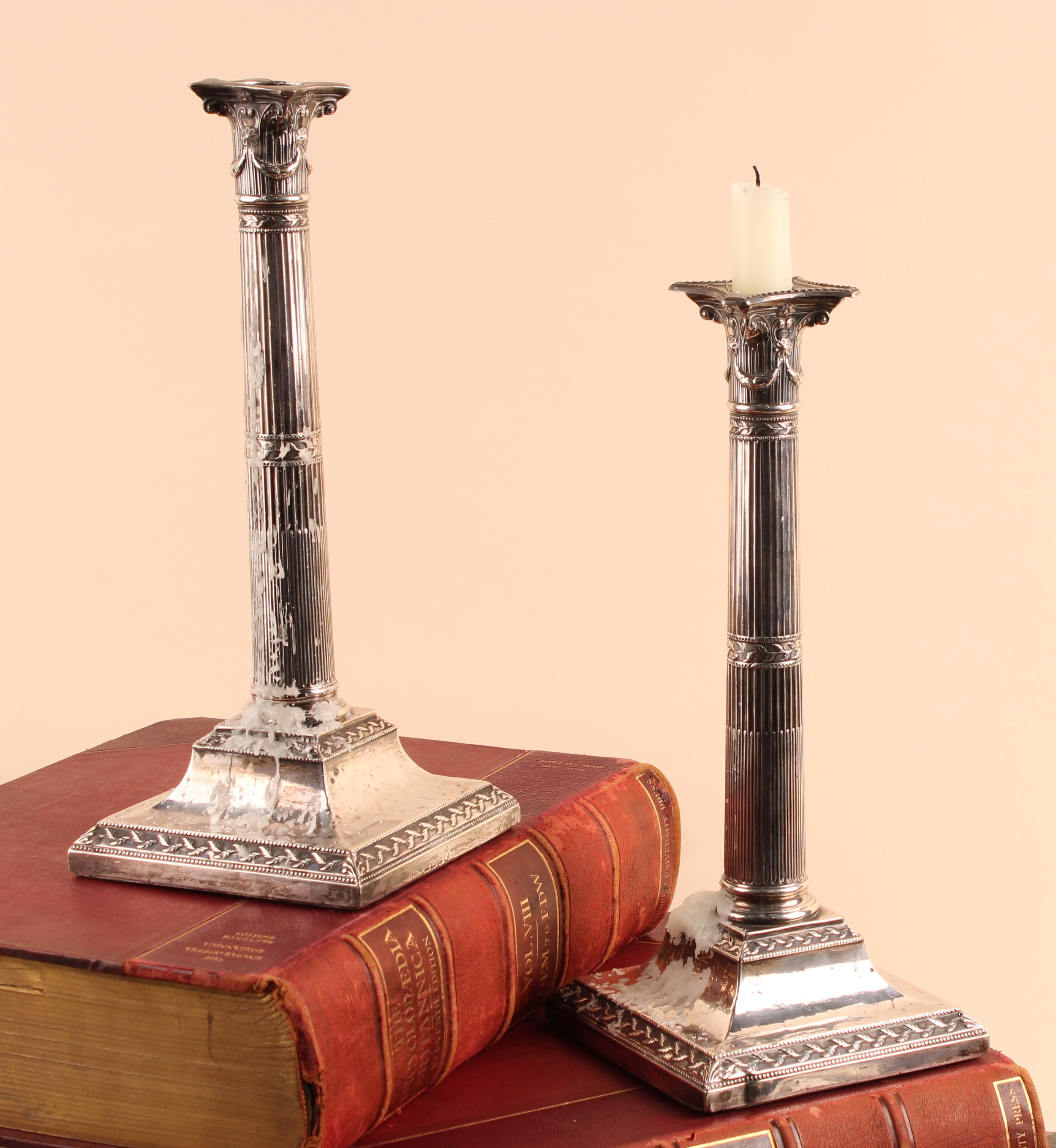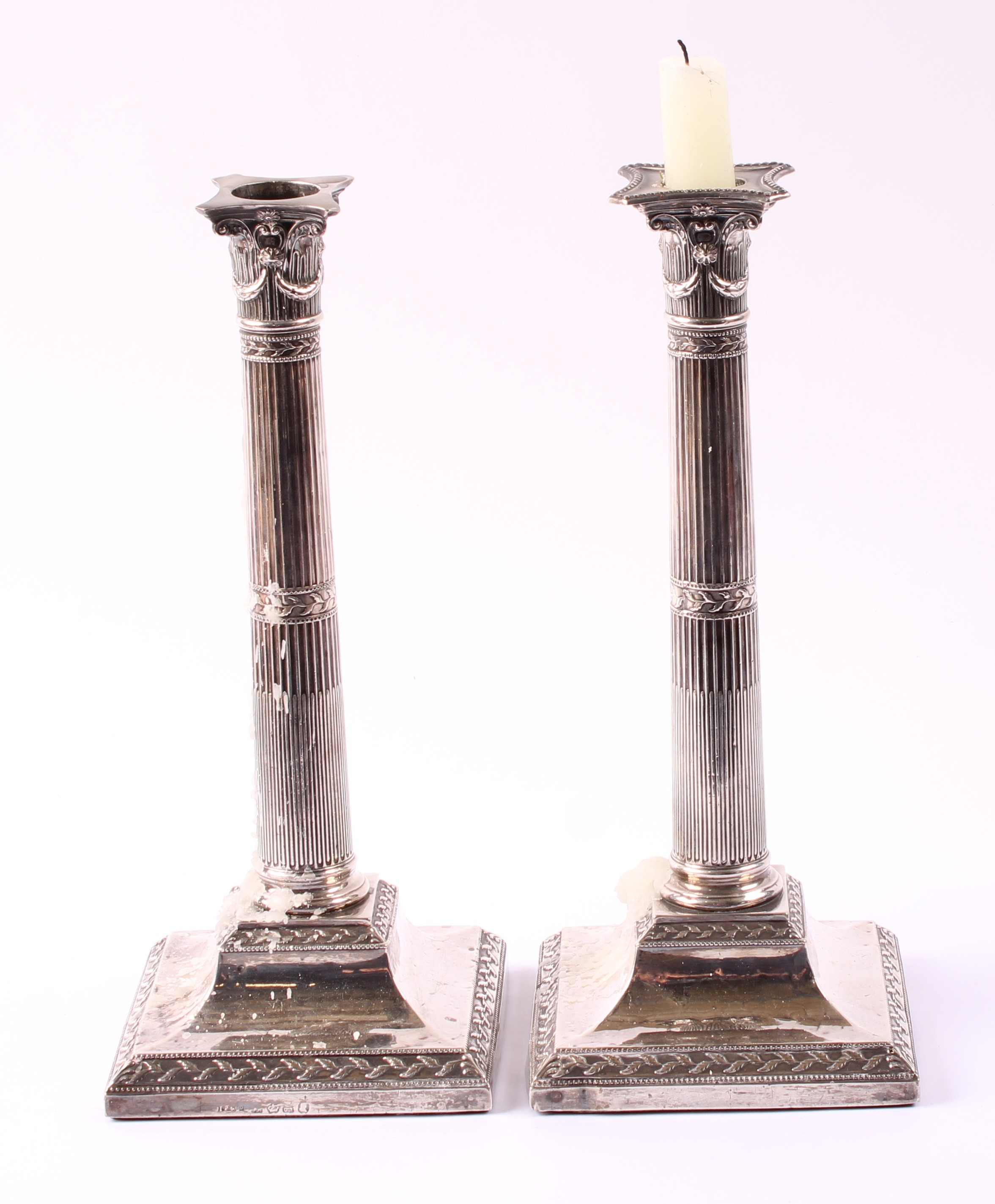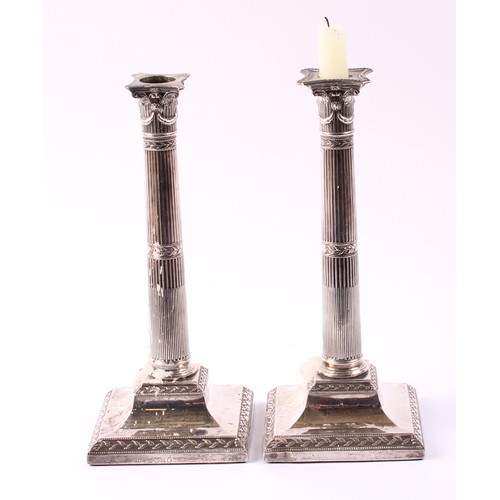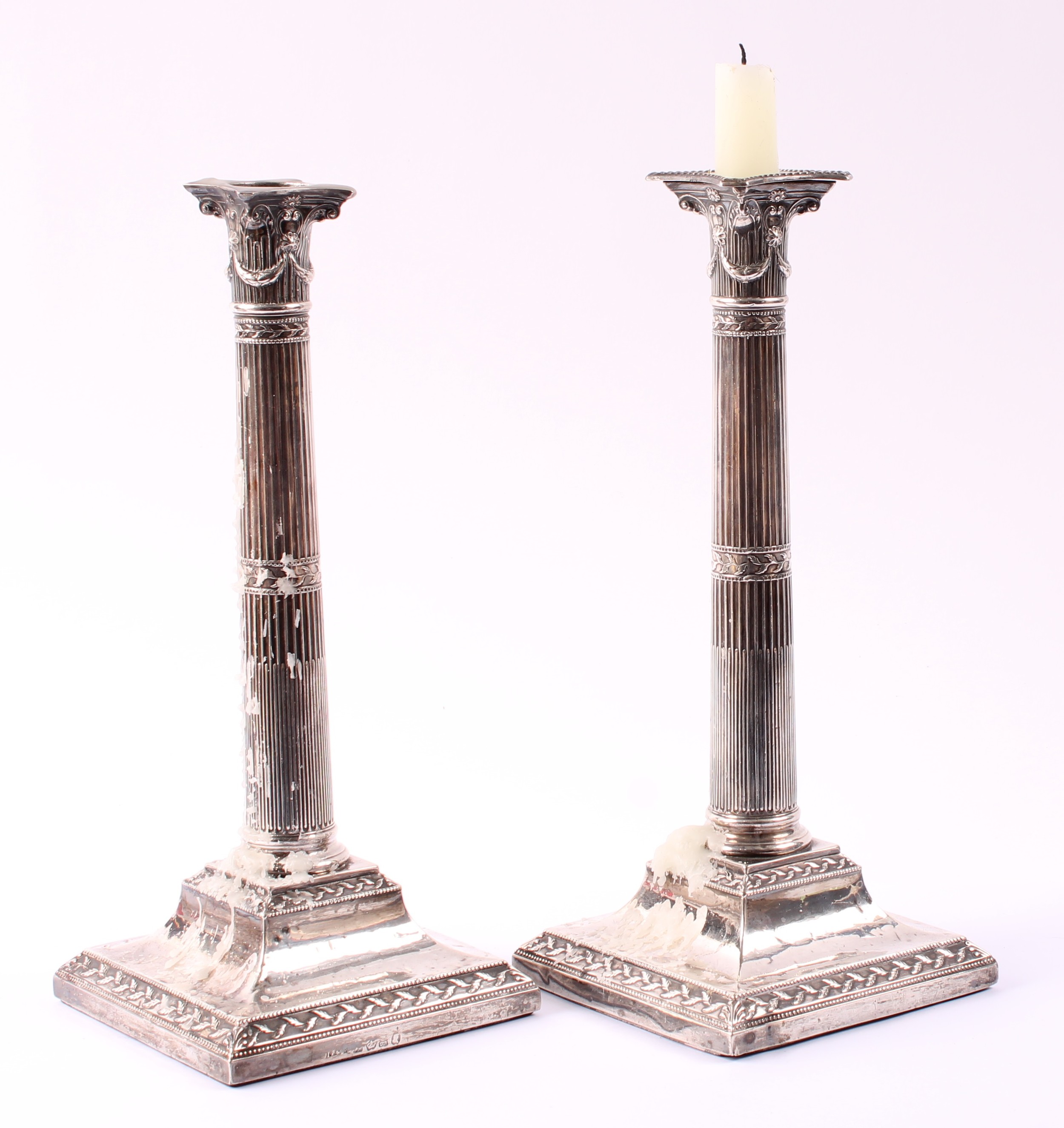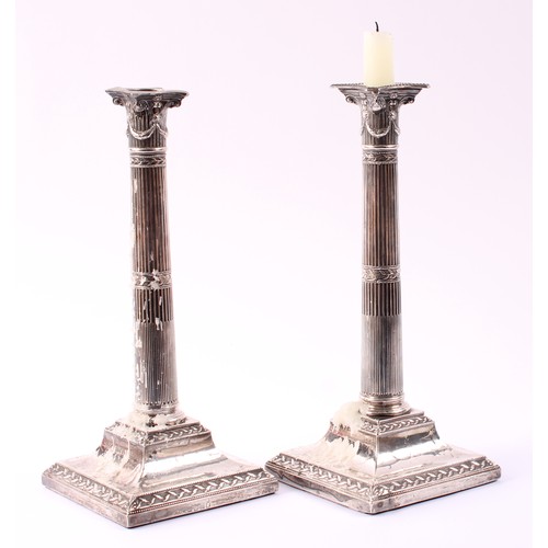 A pair of George III silver table candlesticks of hybrid Ionic form, the capitals with swags issuing from stylised flower heads on stop fluted columns, spreading square bases, the whole with bands of stylised leaves, turned mahogany bases, 29cm high, Sheffield 1788 (one nozzle missing)