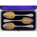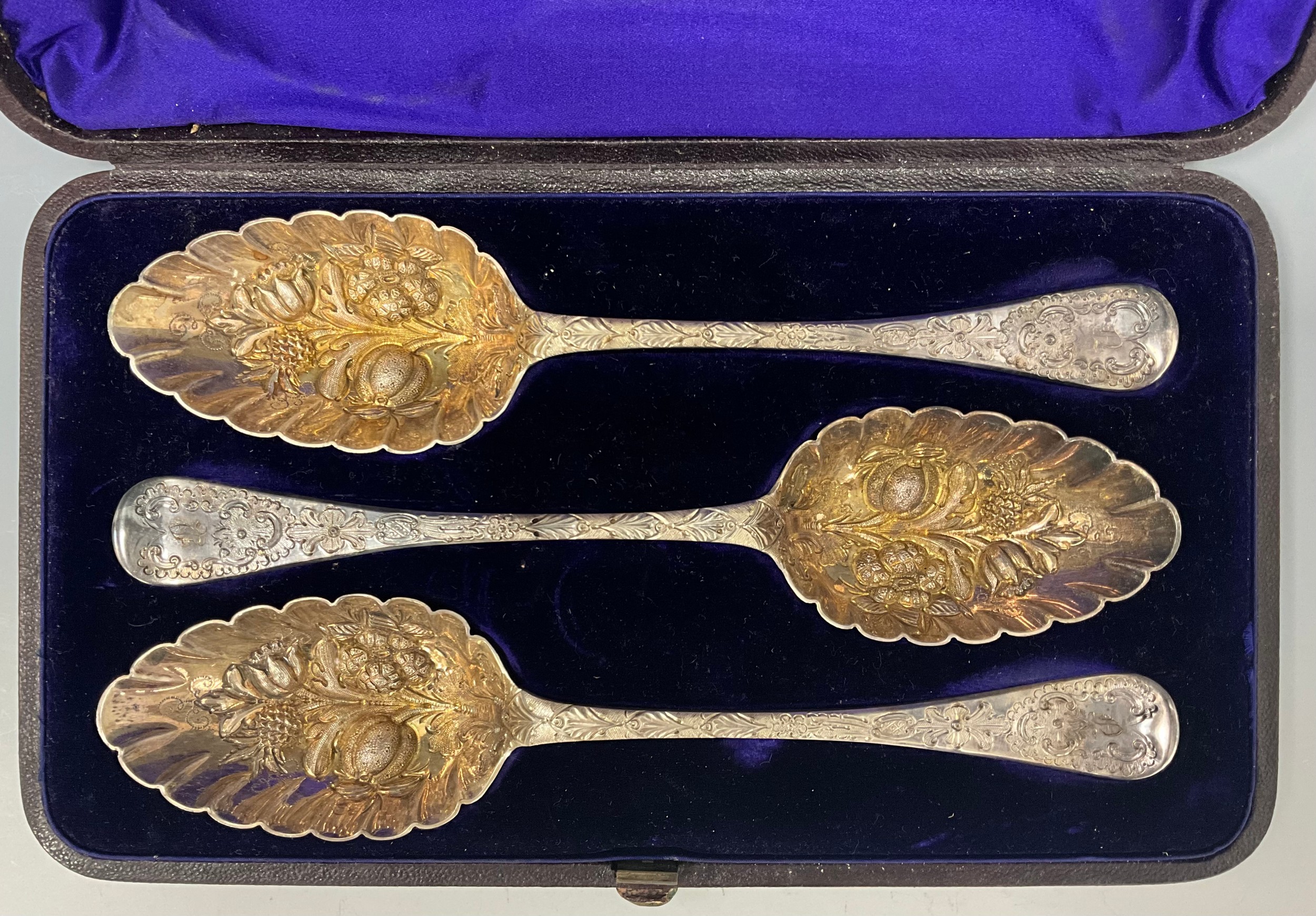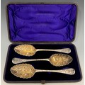 A cased trio of silver berry spoons, deeply embossed bowls, ...