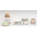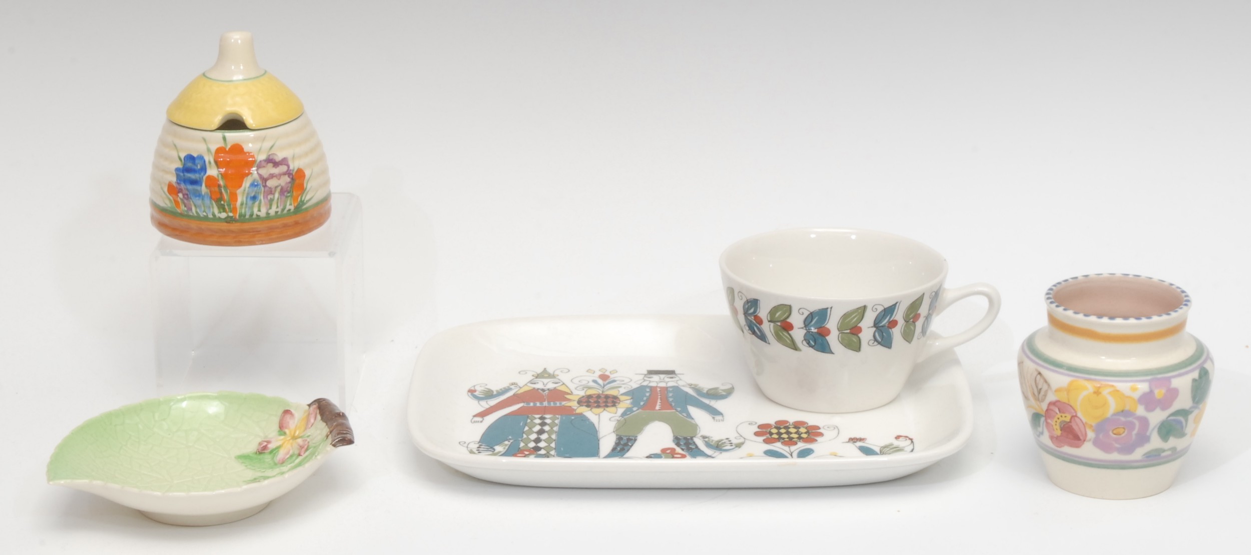 A Clarice Cliff Wilkinson's pottery beehive mustard pot and cover, painted in the Crocus pattern, printed marks, 8cm high, Poole pottery vase, Carltonware leaf dish; a Turi Gramstad Oliver for Figgjo Flint Norwegian cup and saucer, decorated in the Saga pattern (4)