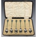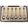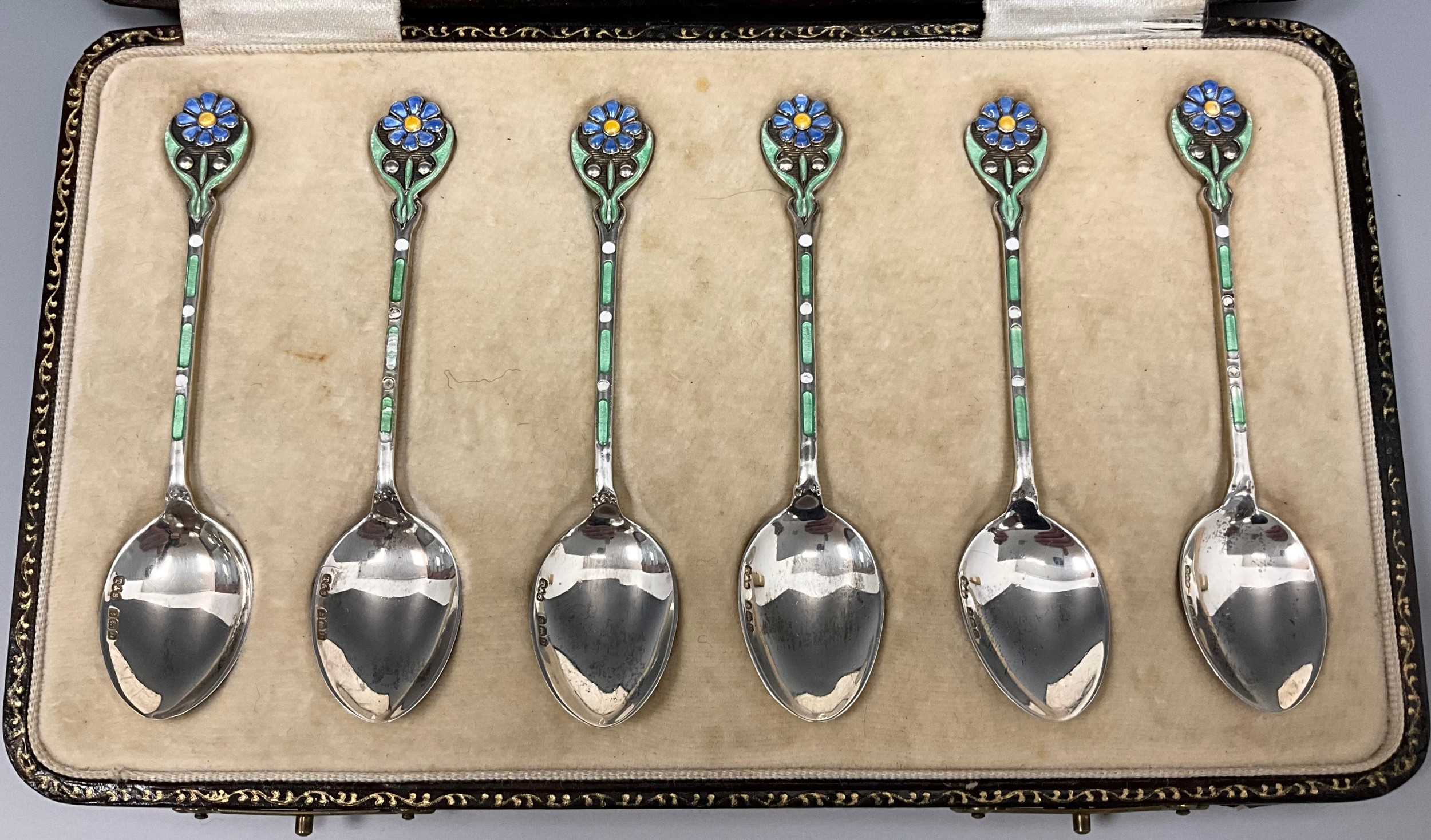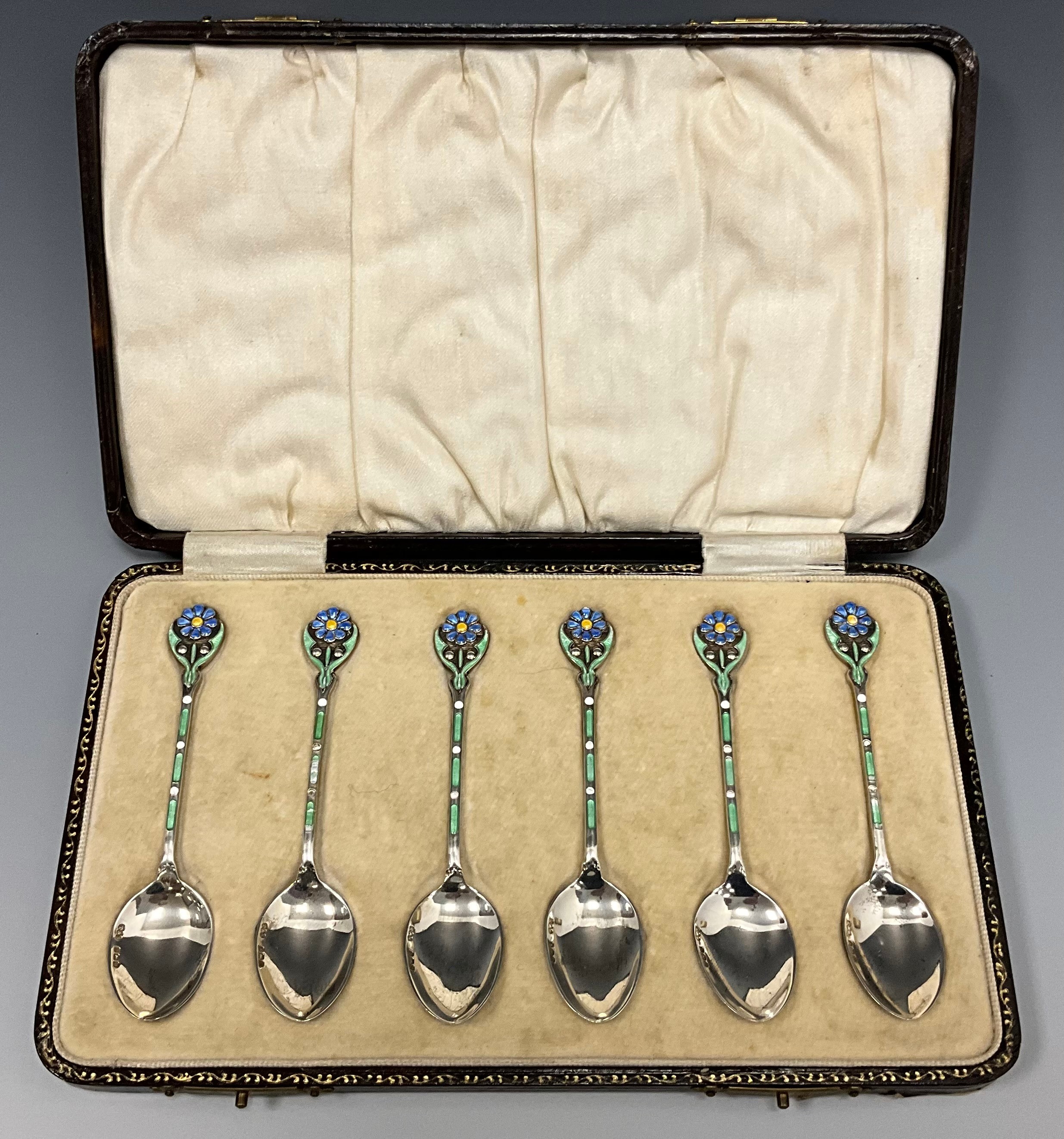 A cased set of six George V silver enamelled floral teaspoons, enamelled in vibrant tones of blue, green and white, Turner & Simpson, Birmingham 1928, 44.6g gross
