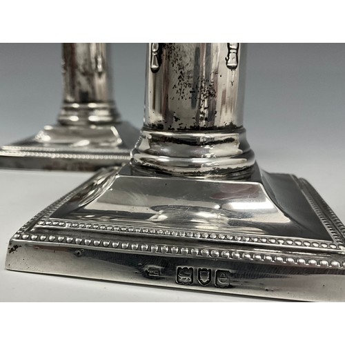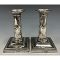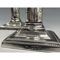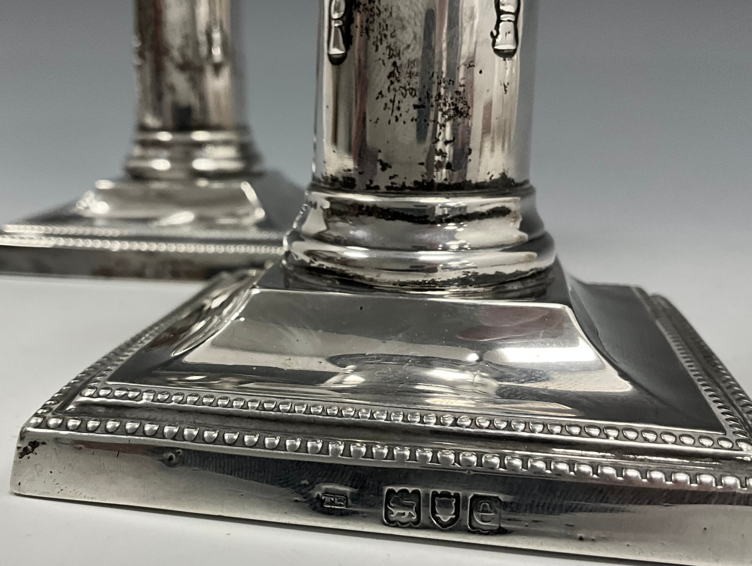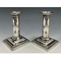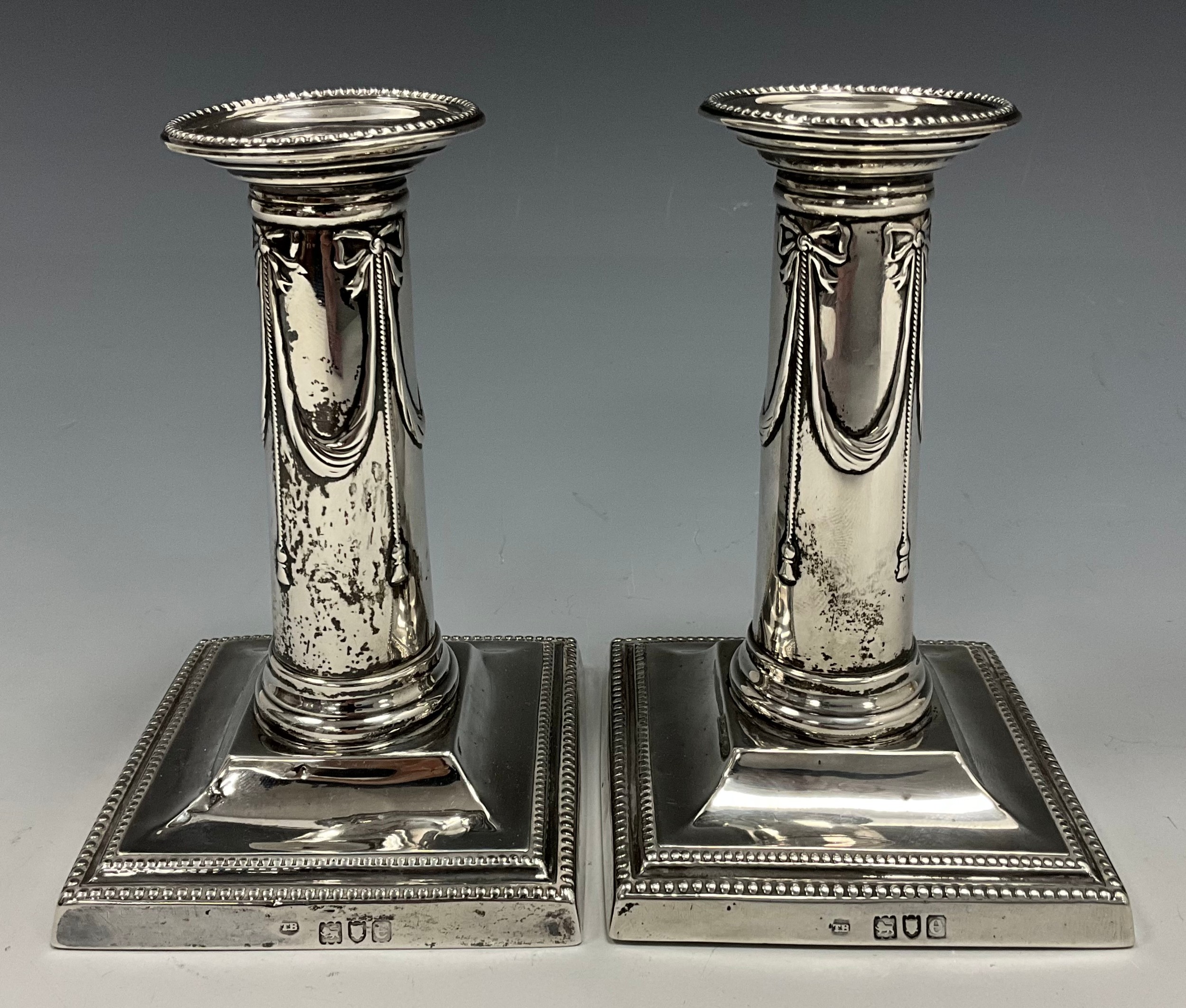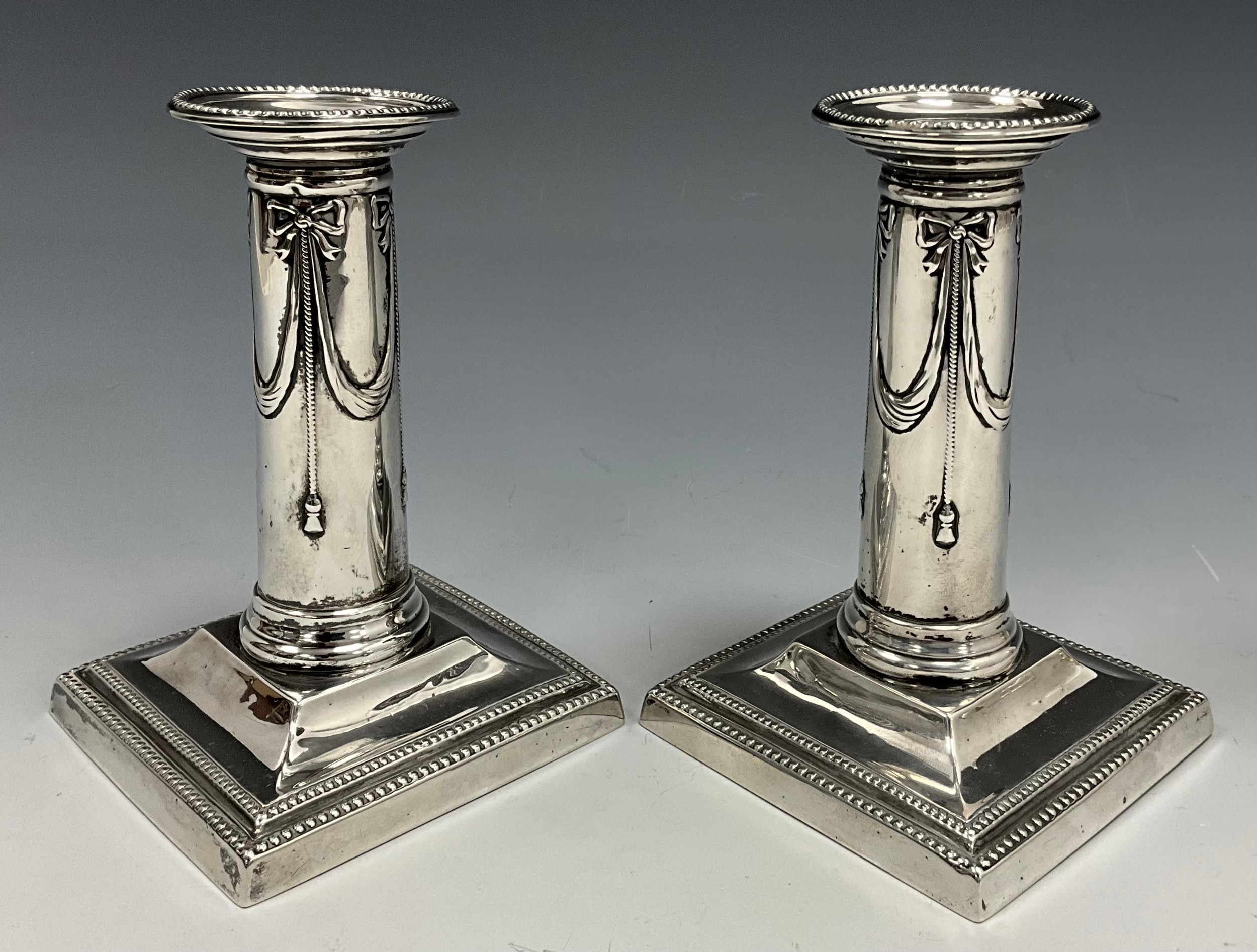 A pair of Edwardian silver candlesticks, embossed with ribbo...
