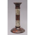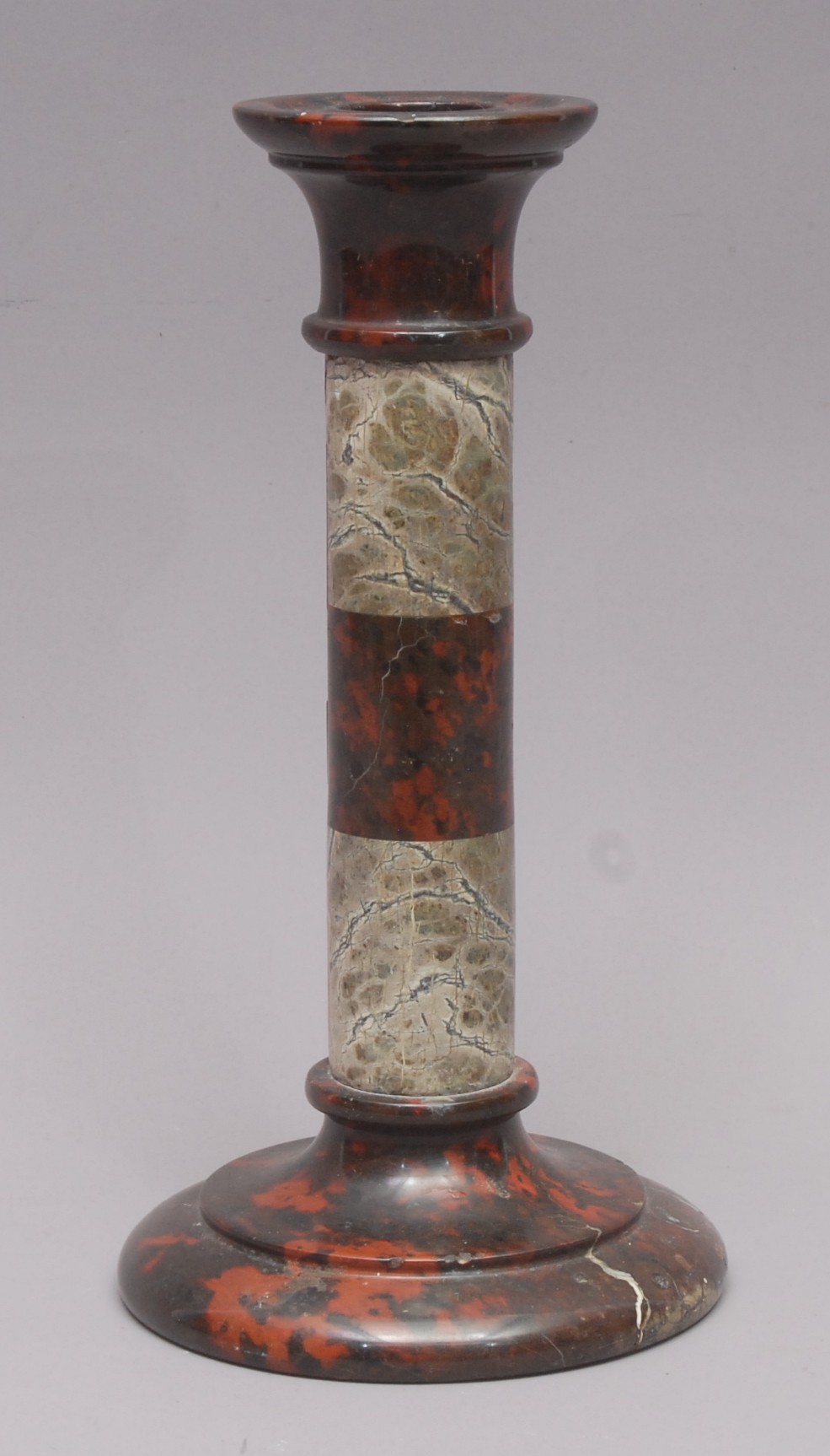 A Cornish serpentine candlestick, everted rim, the column comprised of bands of serpentine, socle base, 22cm high overall