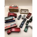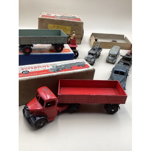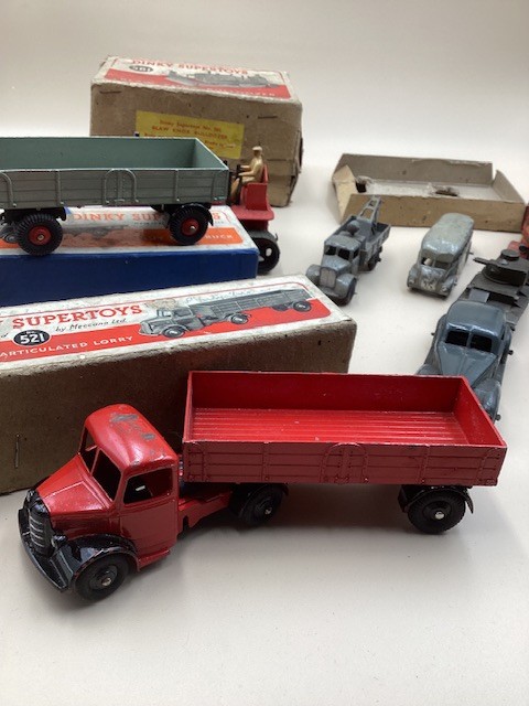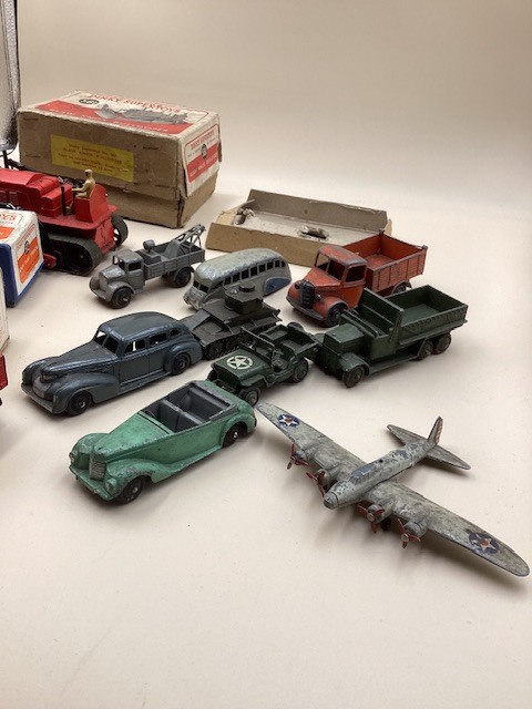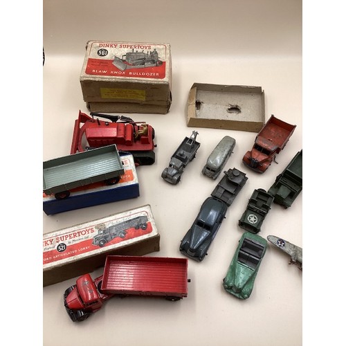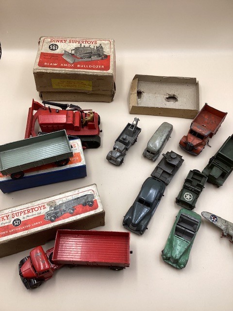 Toys - Dinky - A Dinky Supertoys No. 561 Blaw Knox Bulldozer, original box; No. 521, Bedford Articulated Lorry; a pull truck and separate box; and others, including Boeing Flying Fortress, unboxed, and play worn.
