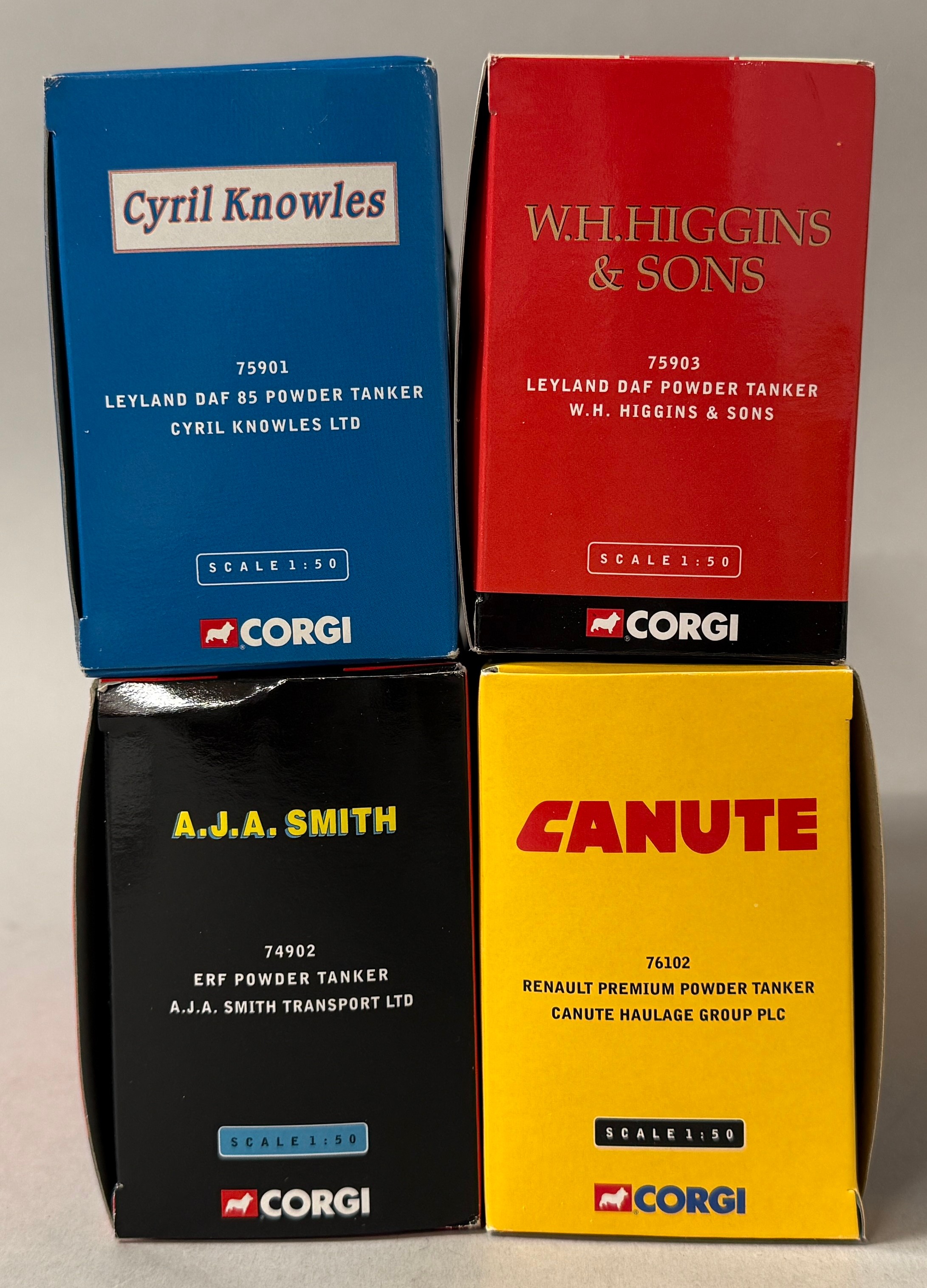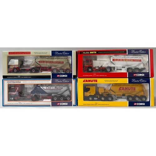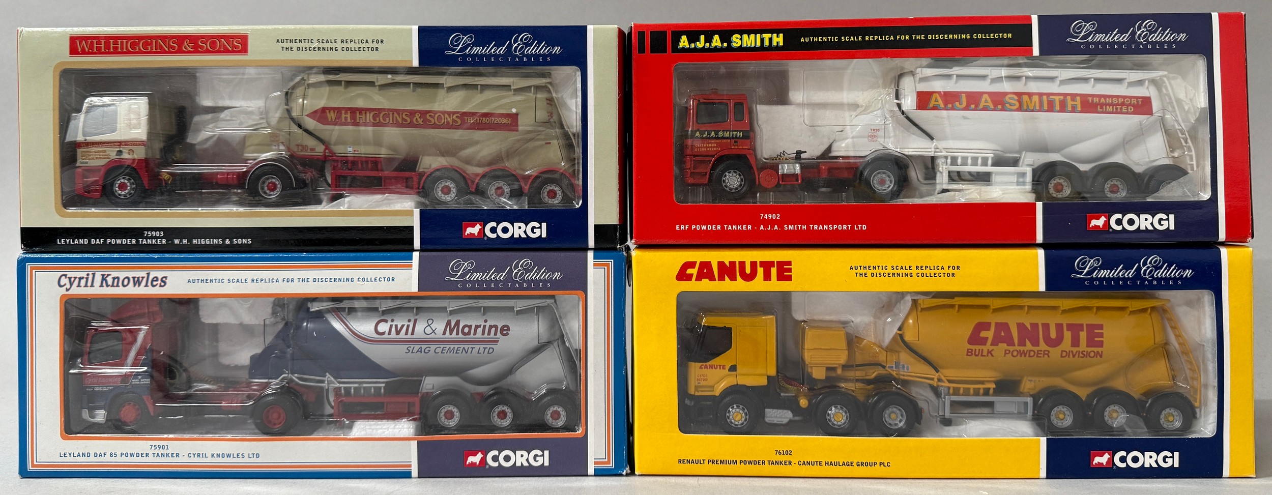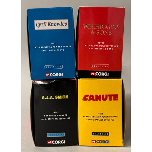 Corgi Toys - 75901 Leyland DAF 85 Powder Tanker, Cyril Knowles Ltd, limited edition 467/4000, 1/50 scale, boxed; 75903 Leyland DAF Powder Tanker, W.H Higgins & Sons, limited edition 666/2500, 1/50 scale, boxed; 74902 ERF Powder Tanker, A.J.A. Smith Transport Ltd, limited edition 1834/2240, 1/50 scale, boxed; 76102 Renault Premium Powder Tanker, Canute Haulage Group PLC, limited edition 1098/2500, 1/50 scale, boxed (4)