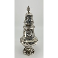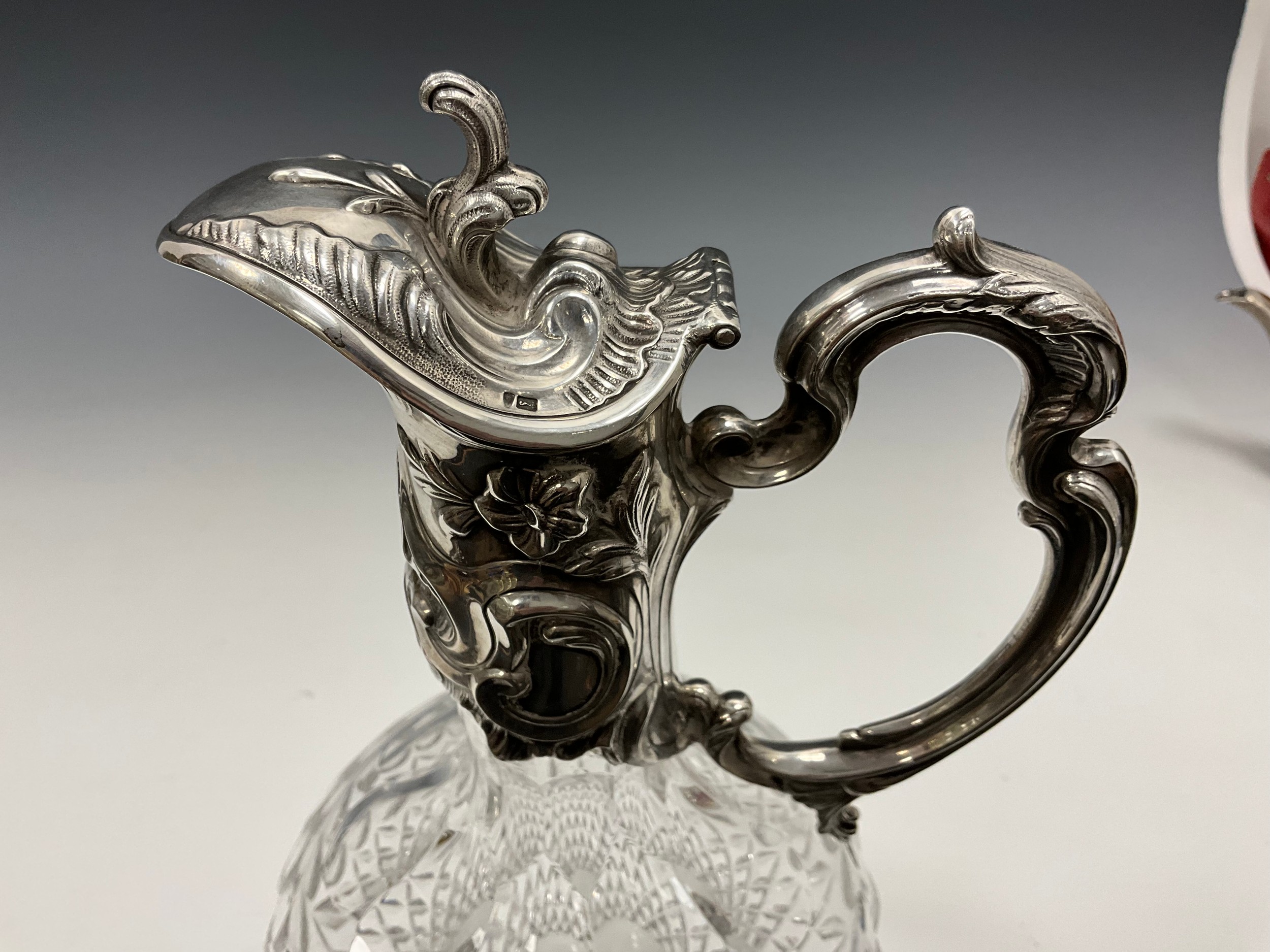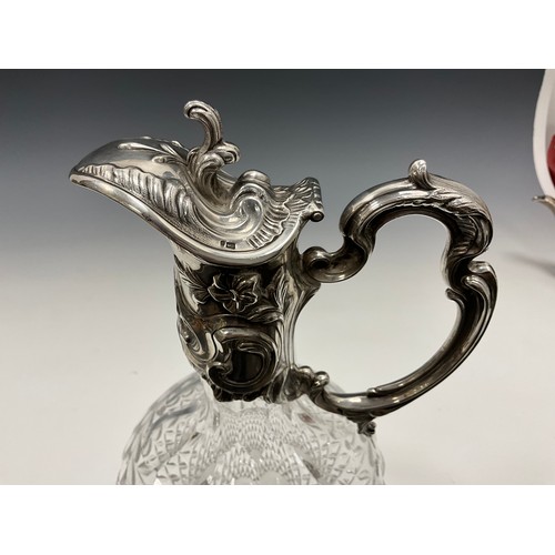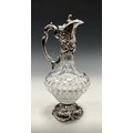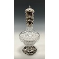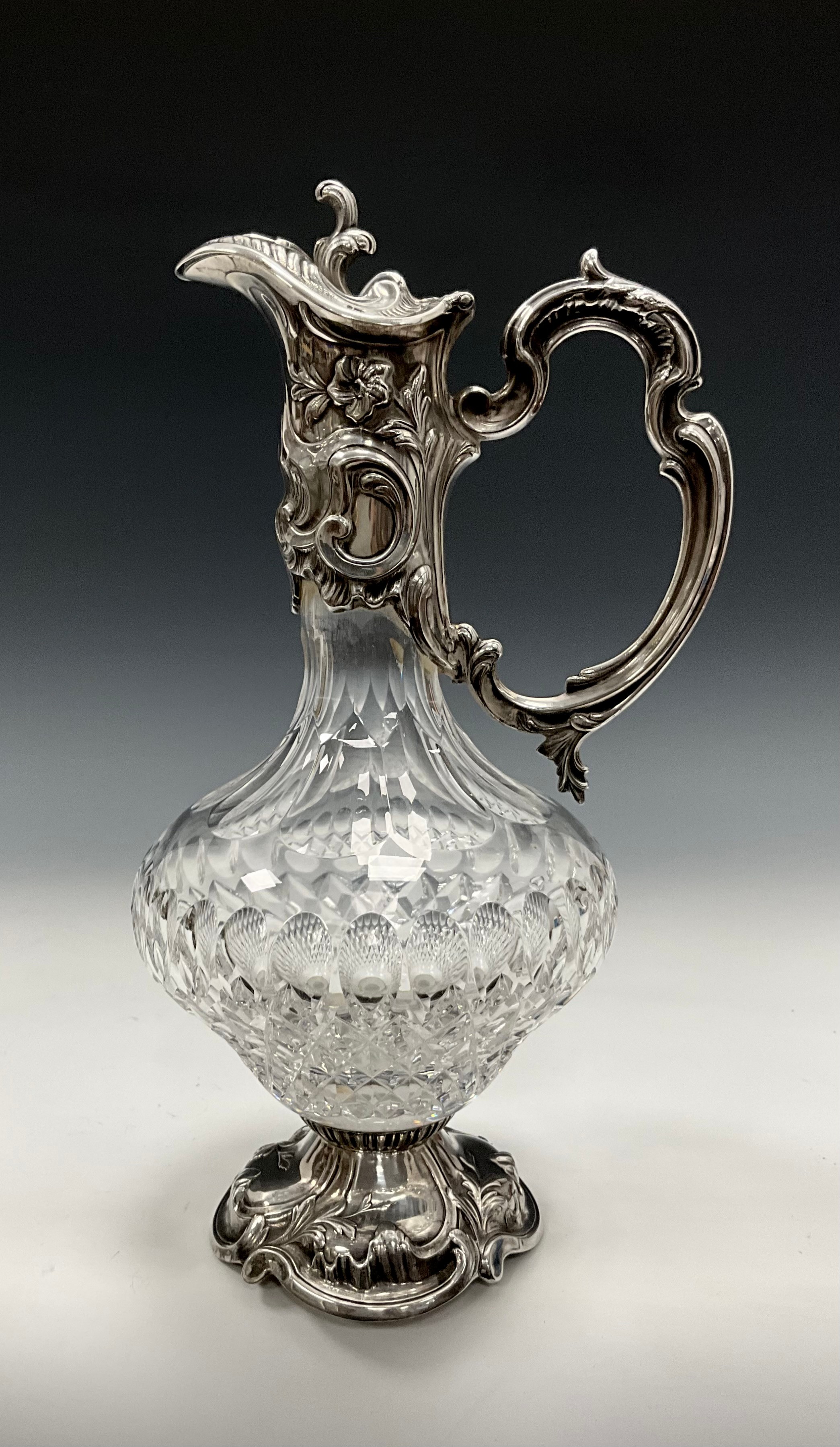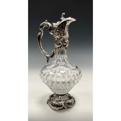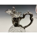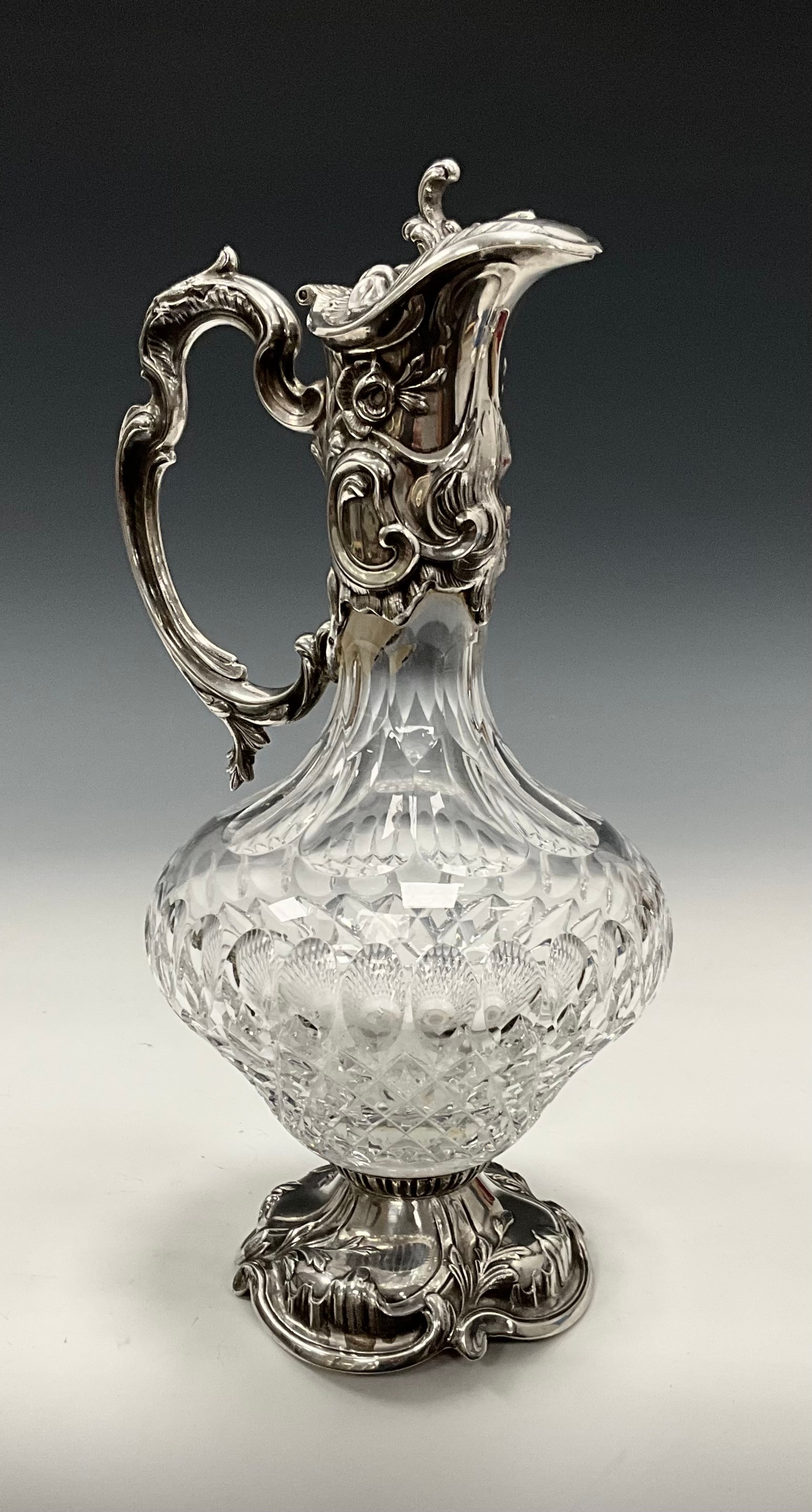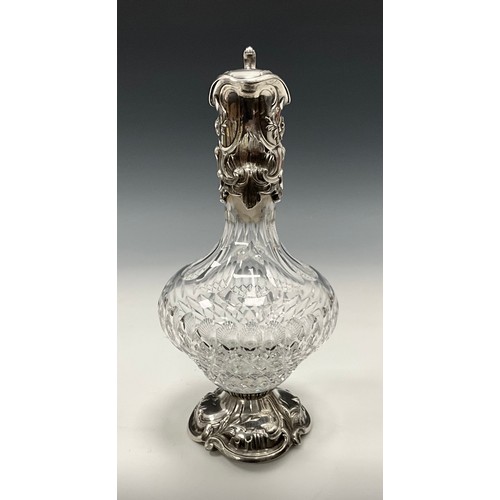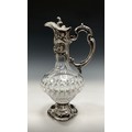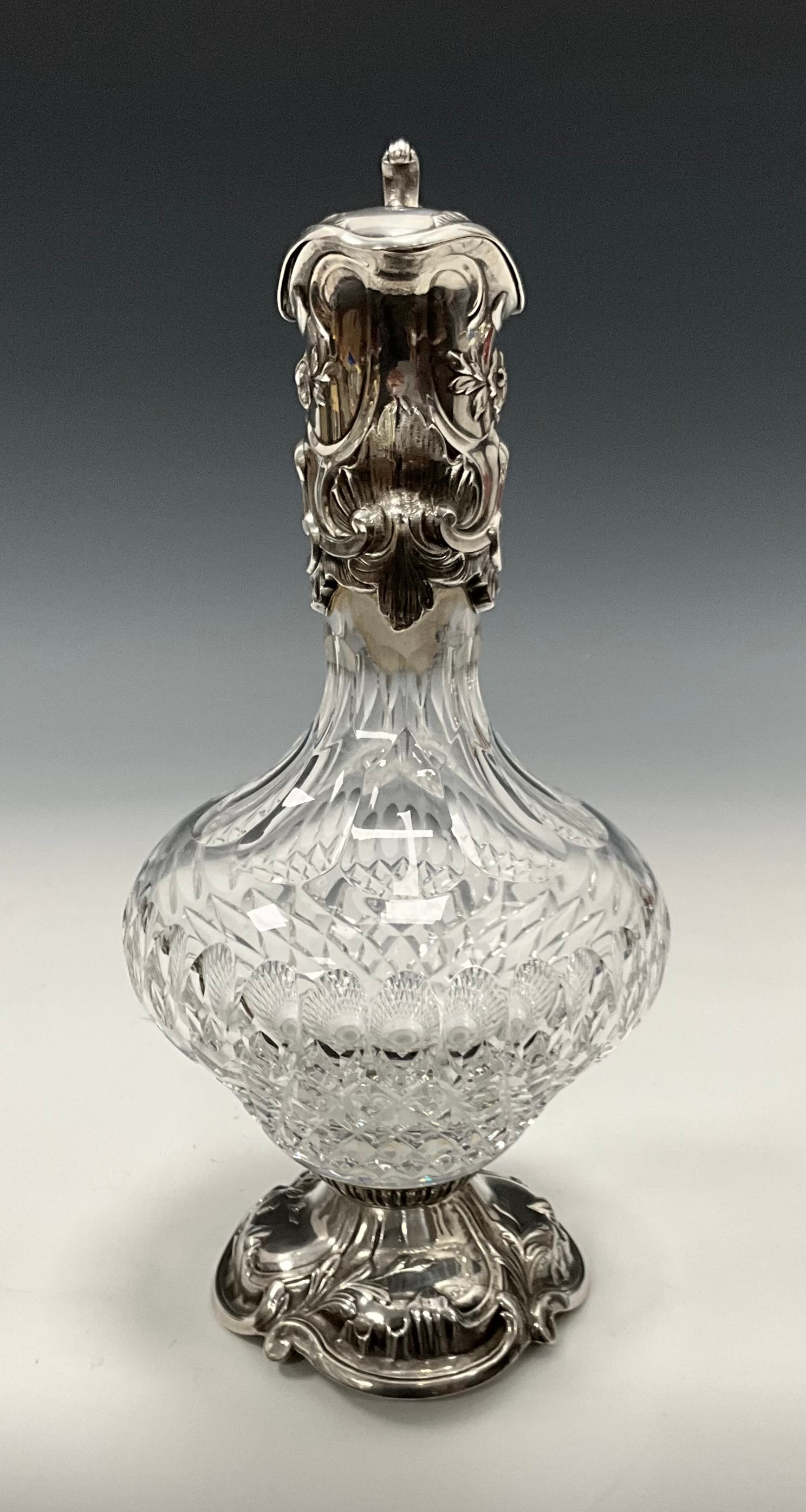 A late 20th century Portuguese silver and cut glass claret jug, having elaborate relief foliage and floral design to neck, handle and footed base, hinged cover to top with feathered finial, the cut glass spherical body having diamond shaped design, Portuguese marks for Ferreira Marques & Irmao, Topazio, stamped 925 to base, approximately 30cm high. c.1990.
