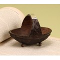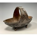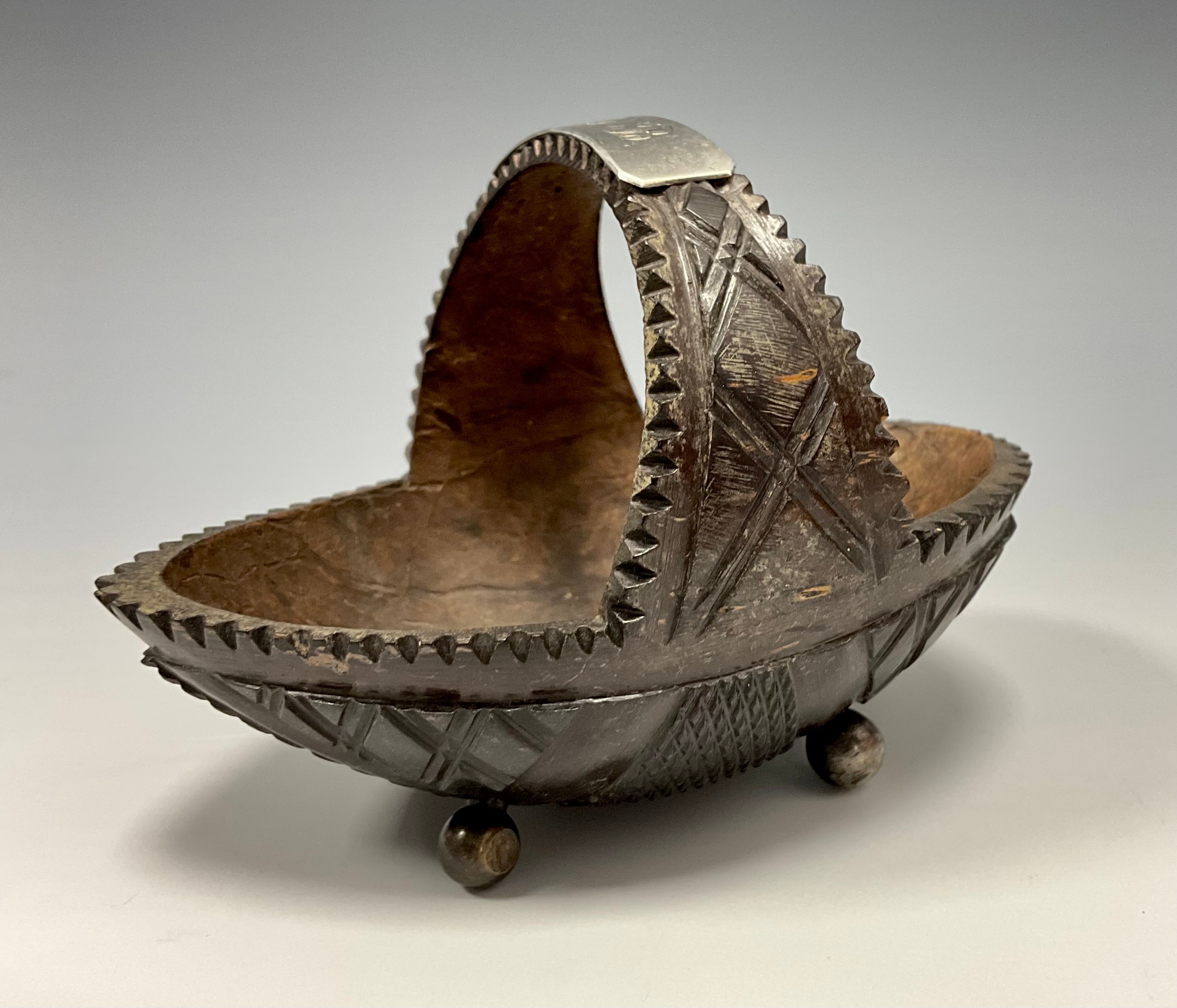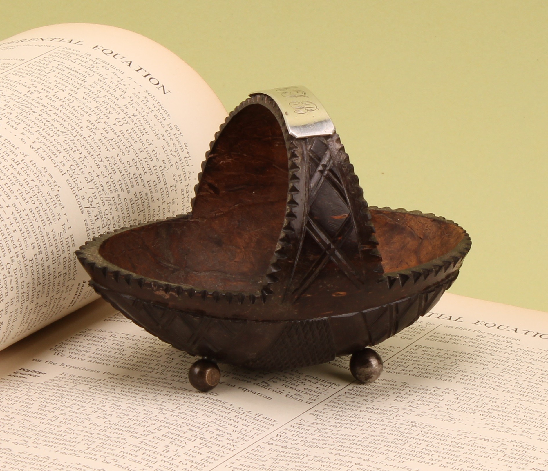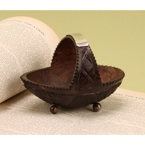 A 19th century silver coloured metal mounted coconut sweetmeat basket, carved overall, arched handle, bun feet, 12cm wide.