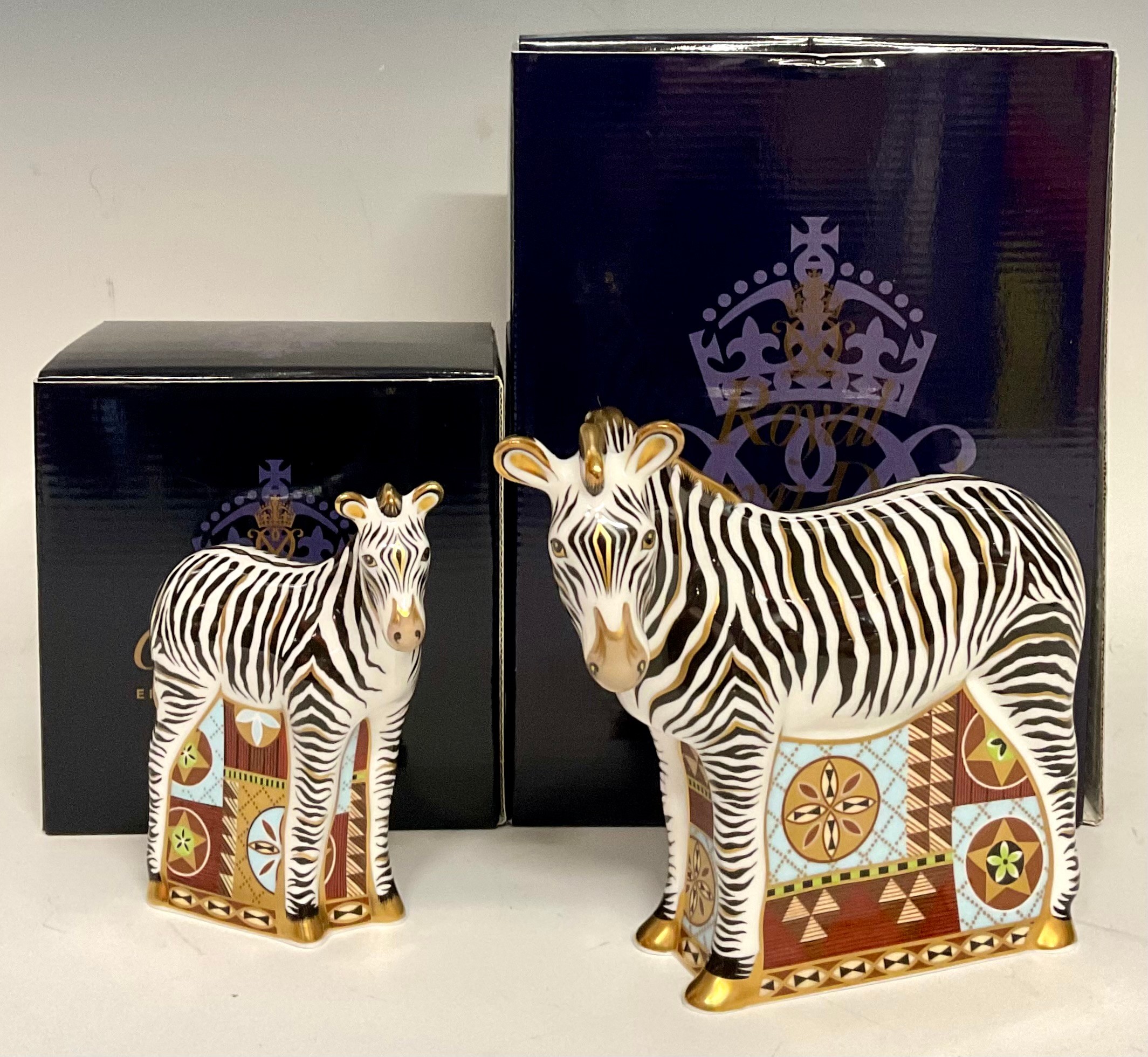 A pair of Royal Crown Derby paperweights, Zebra and Baby Zebra, gold stoppers, the zebra 16cm, the baby 13.5cm, printed marks in red, each boxed (2)