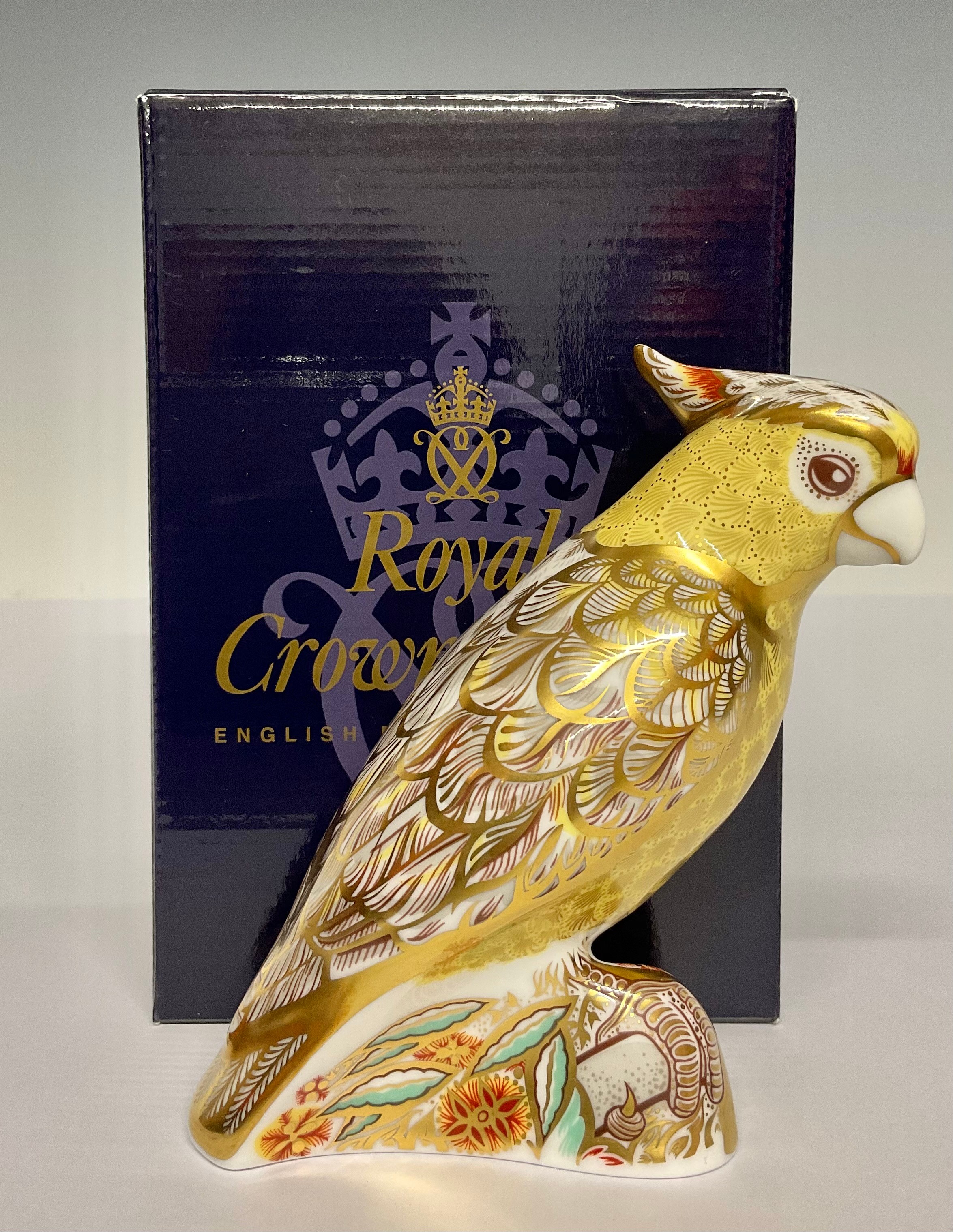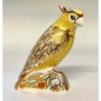 A Royal Crown Derby paperweight, Citron Cockatoo, gold stopp...