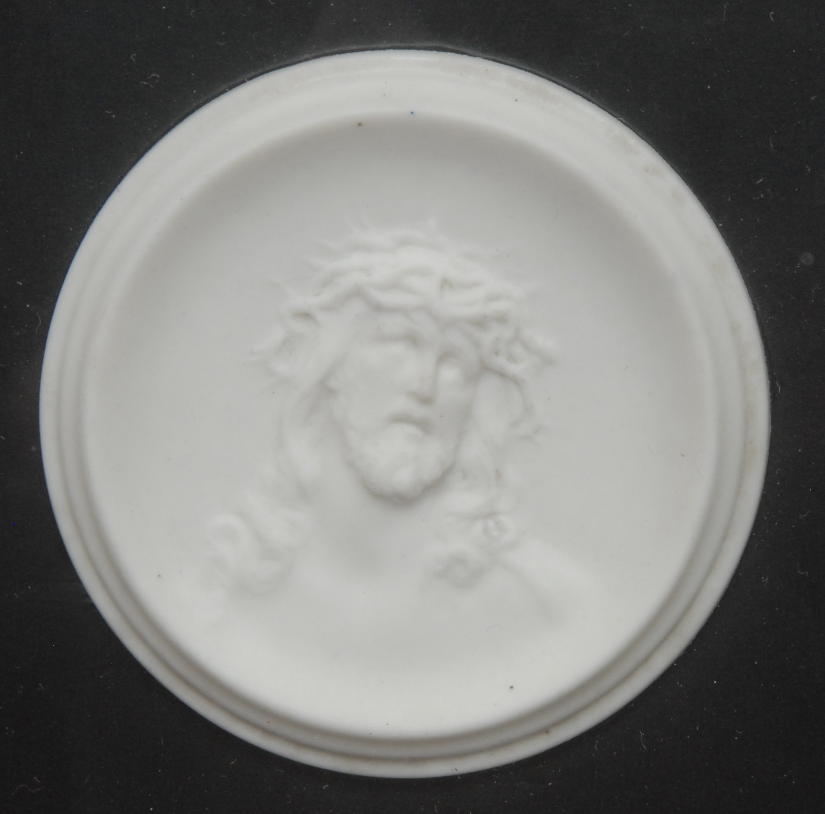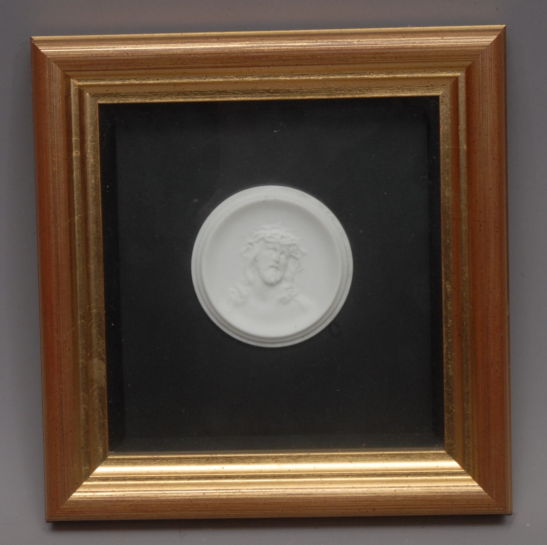 A Grand Tour circular parian intaglio, Christ with Crown of Thorns, 6.5cm, framed and mounted