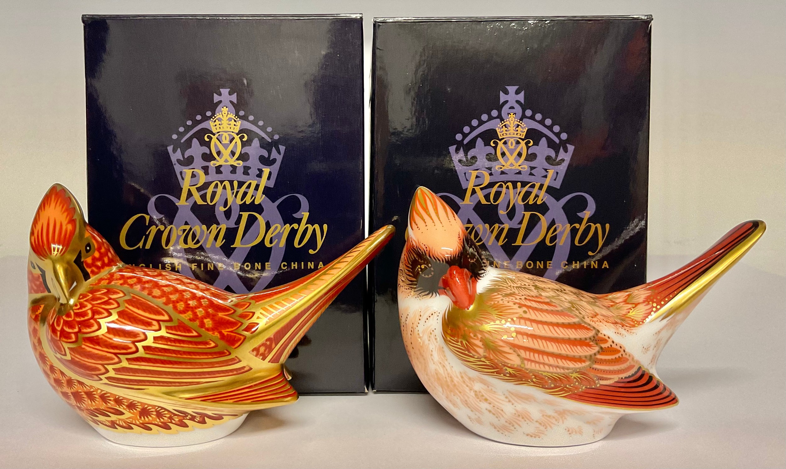 A pair of Royal Crown Derby paperweight, American Red Cardinal, gold stopper, 7.5cm high, printed mark in red, boxed; Female cardinal, gold stopper, 7.5cm, printed mark in red, boxed (2)