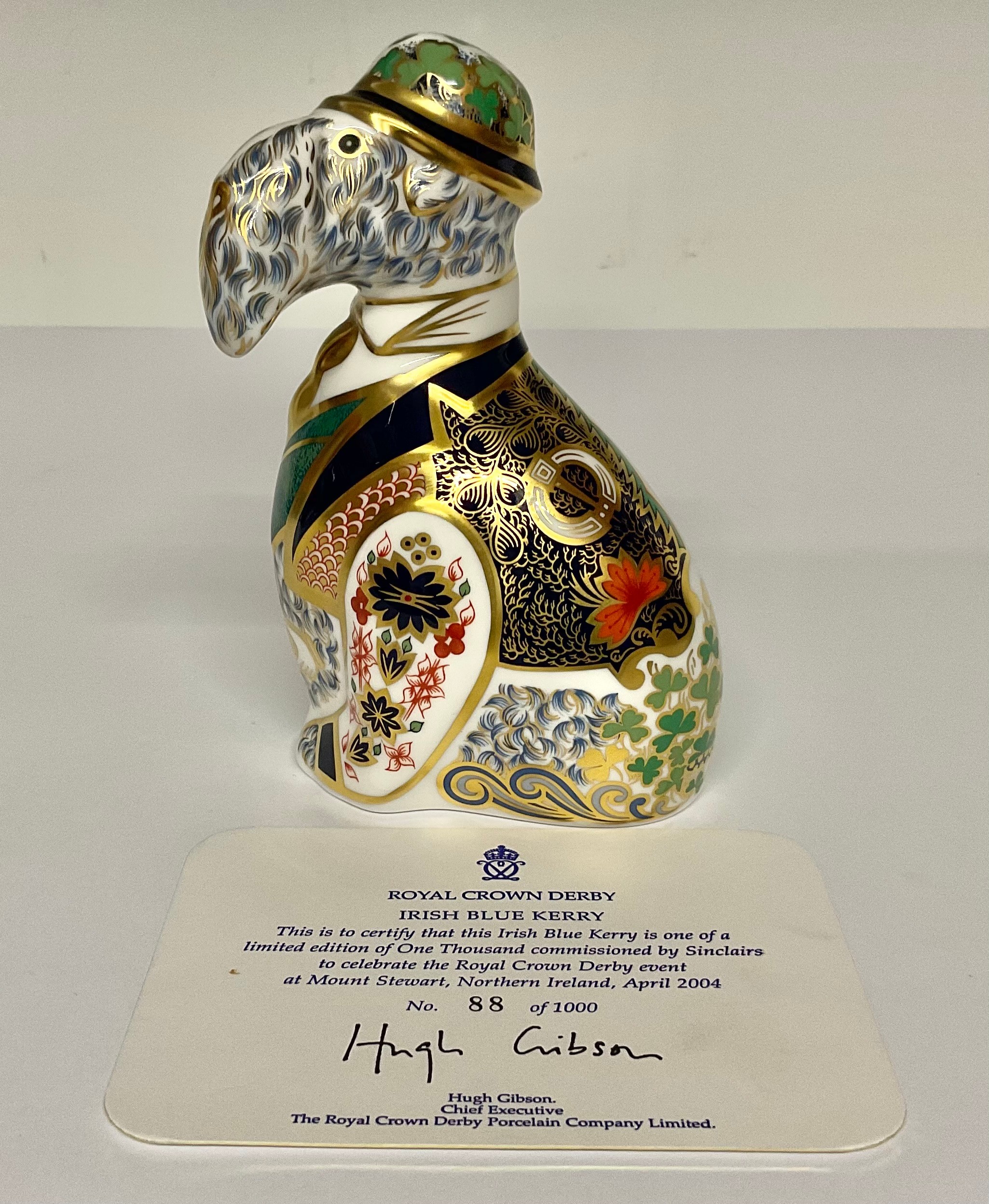 A Royal Crown Derby model, Irish Blue Kerry, commissioned by Sinclairs to celebrate the Royal Crown Derby event at Mount Stewart, Northern Ireland, April 2004, limited edition 88/1,000, 15cm high, printed mark in red, certificate