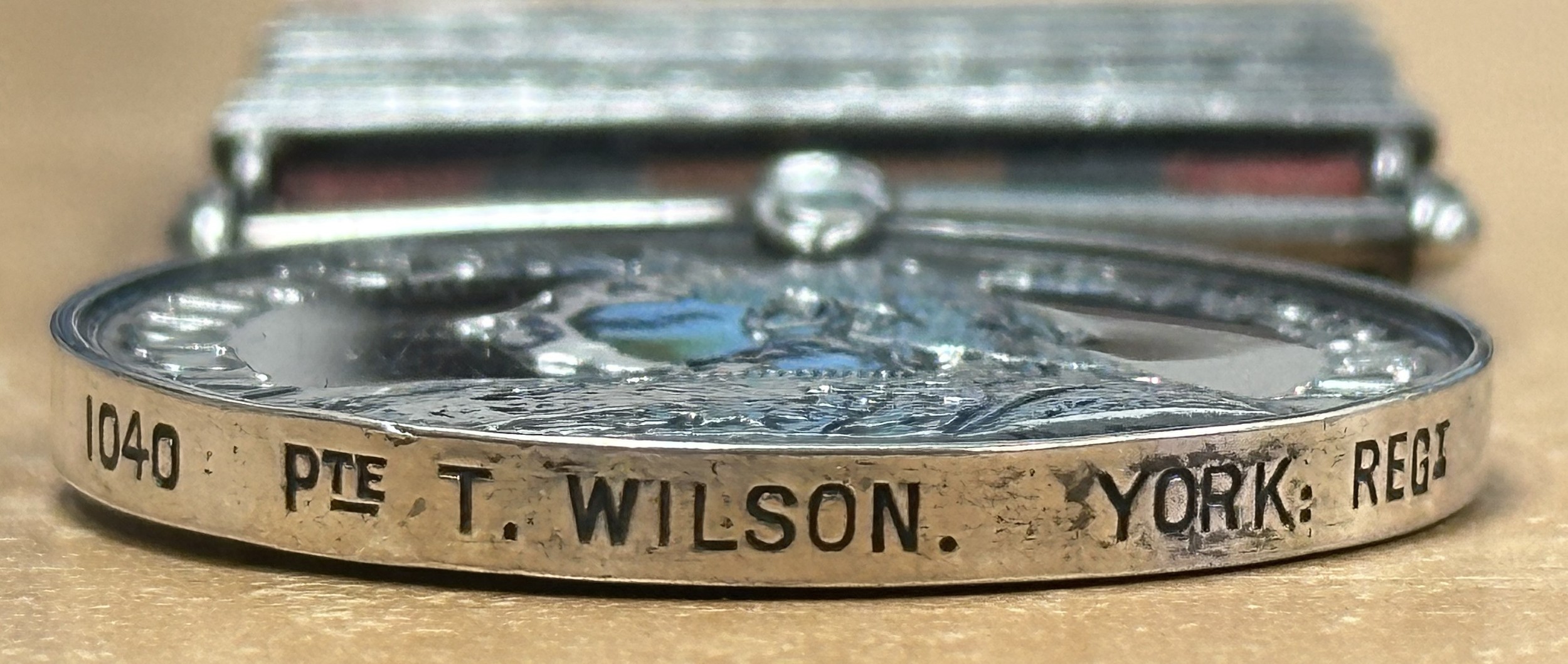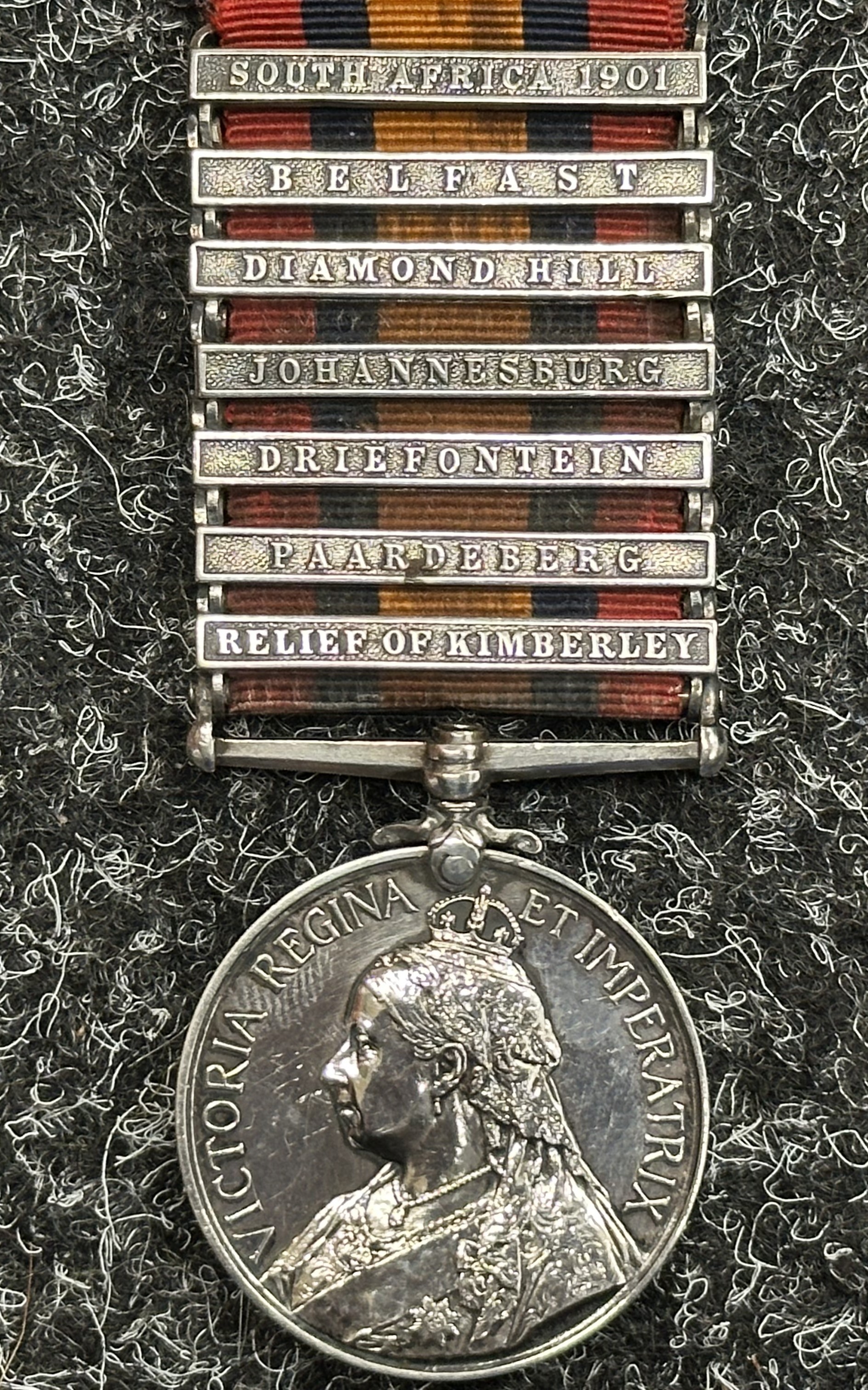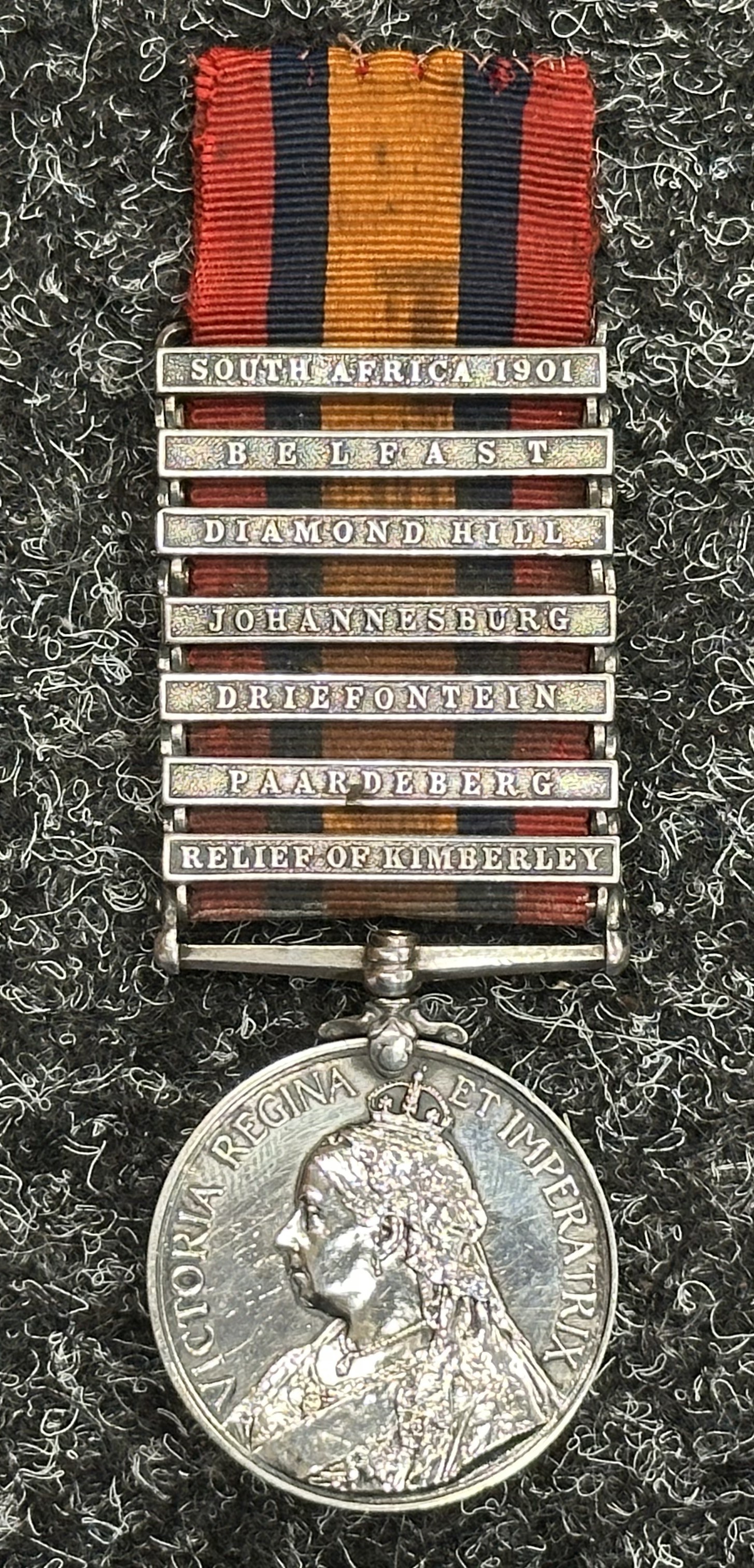 Victorian Queens South Africa Medal with 7 clasps, South Africa 1901, Belfast, Diamond Hill, Johannesburg, Driefontein, Paardeberg, Relief of Kimberley to "1040 Pte T Wilson, York Regt". Complete with ribbon.