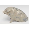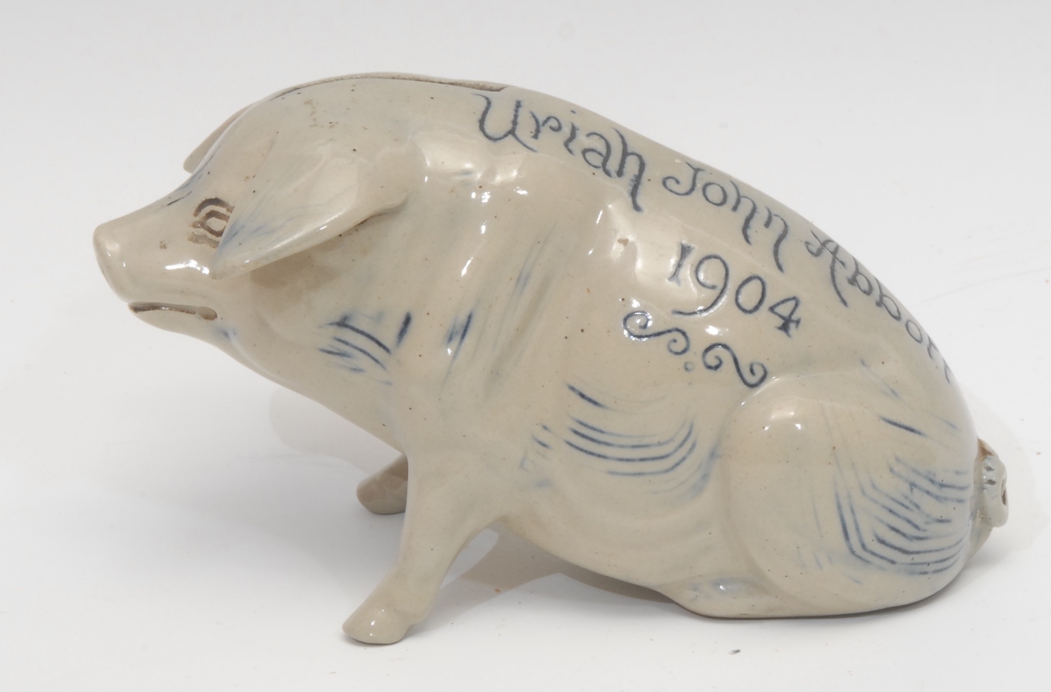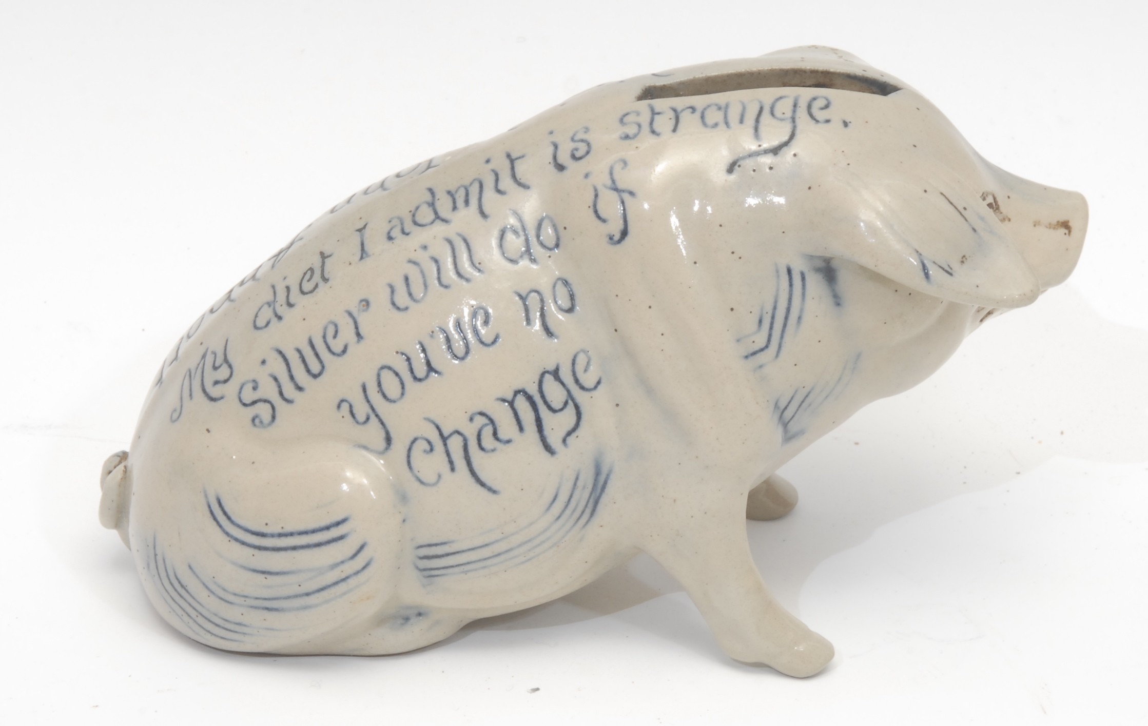 A Horace Elliott Denby pottery pig money bank, hand incised Uriah John Abbott, 1904, My Diet I Admit is Strange, Silver will do if you've no Change, 16cm long, 8.3cm high7.6cm wide