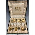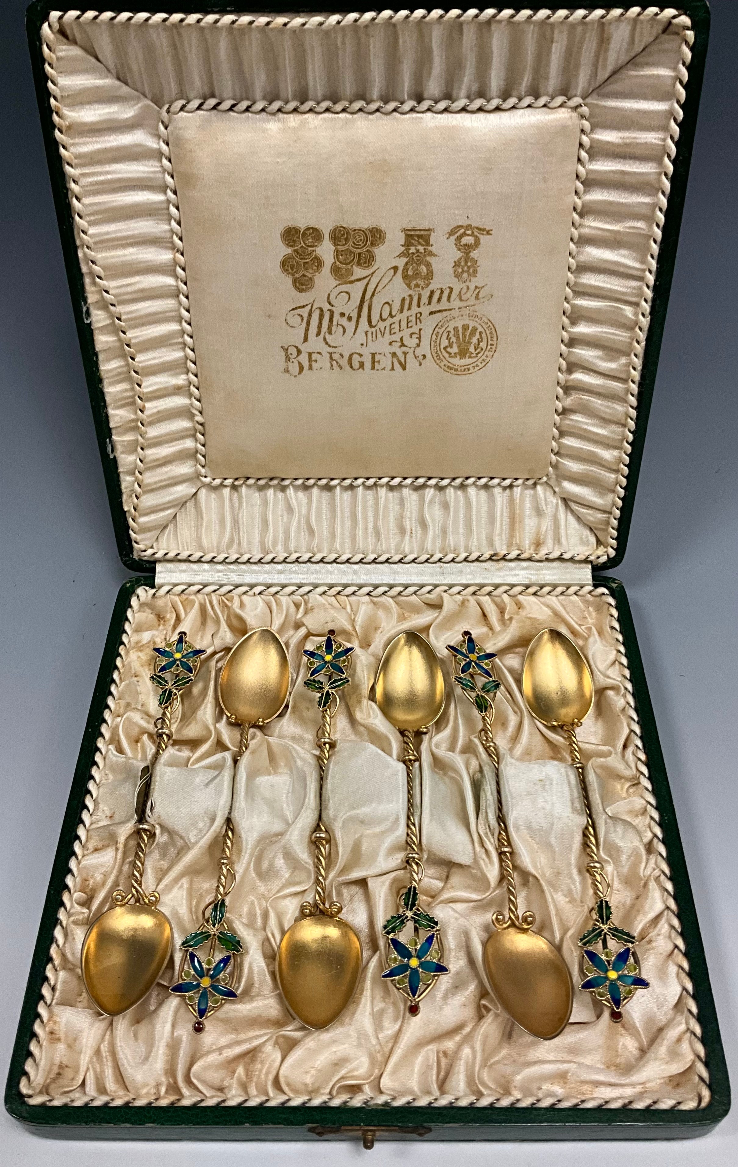 A set of six Norwegian silver and Plique-à-jour enamel tea spoons by Marius Hammer, each with enamelled foliate terminals, spiralled shafts, textured bowls, stamped MH 900, in the original Marius Hammer Juveler Bergen fitted case, NB Marius Hammer (1847-1927) is widely regarded as one of the most important Norwegian silversmiths, A contemporary of Fabergé, he became world famous for fine enamel work. Most of the enamelled pieces reflected the Art Nouveau styles of bright colours and foliate designs and these spoons are typical of his work.