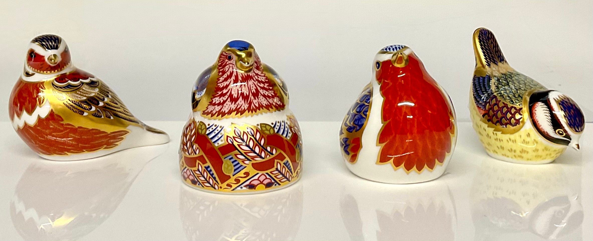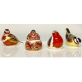 A Royal Crown Derby paperweight, Chaffinch Nesting, Collectors Guild exclusive, gold stopper, 7cm high, printed mark in red; others, Robin, gold stopper, 7cm, printed mark; Chaffinch, gold stopper, printed mark; Blue Tit, gold stopper, printed mark (4)