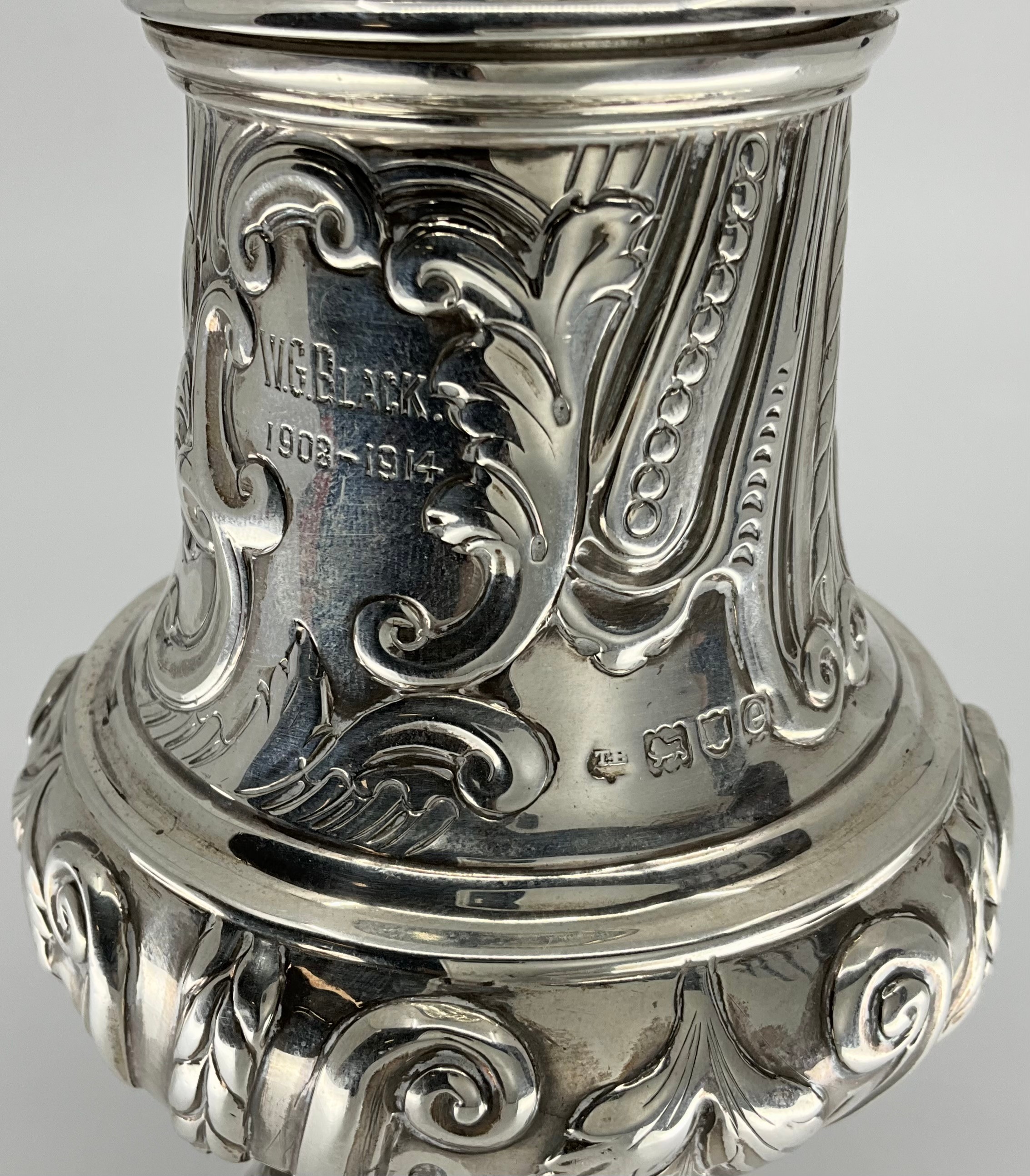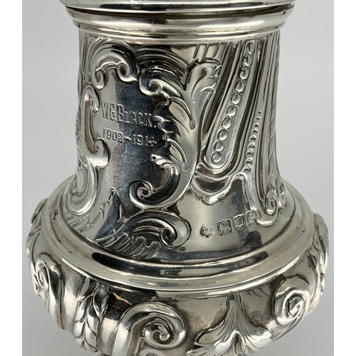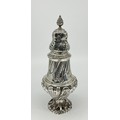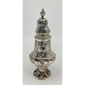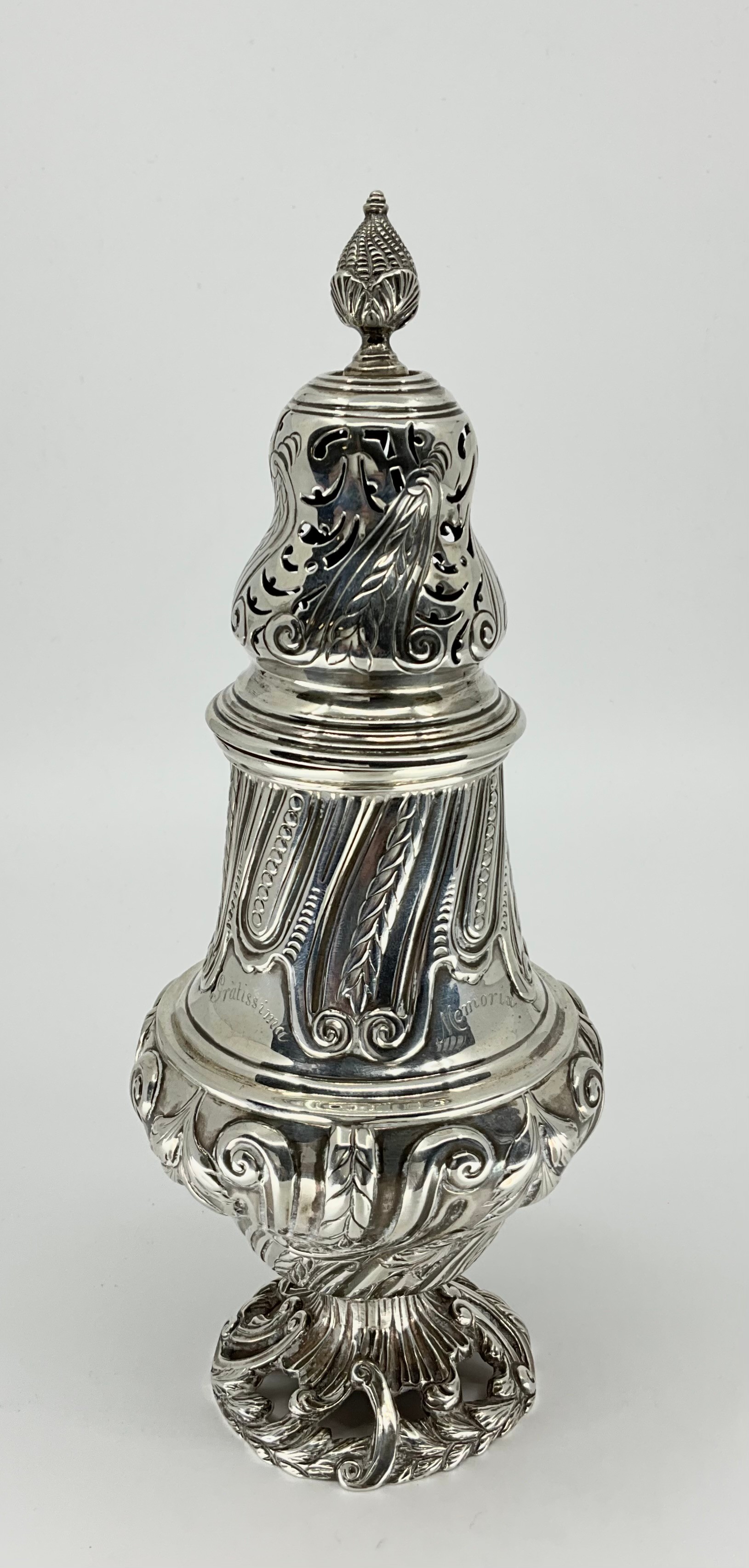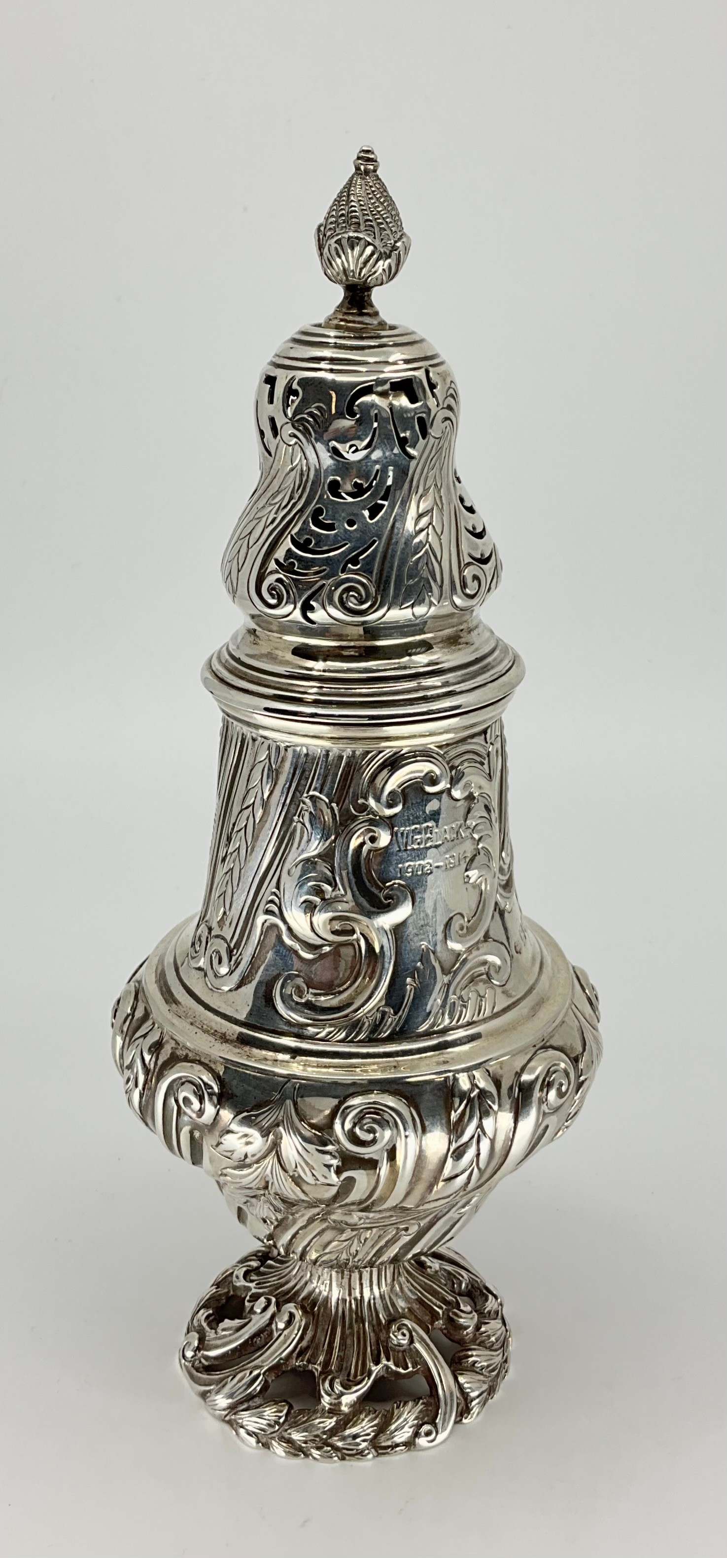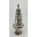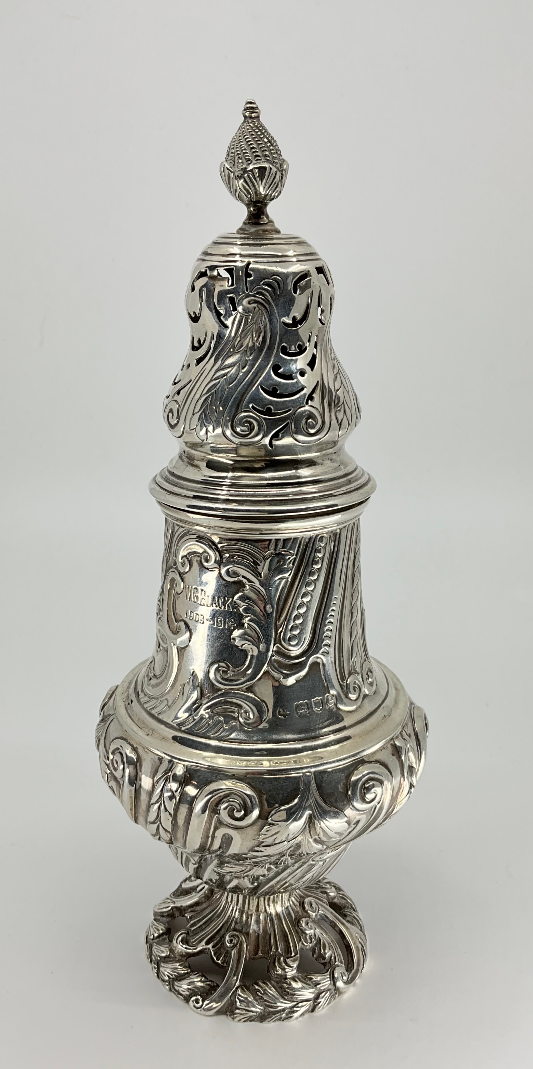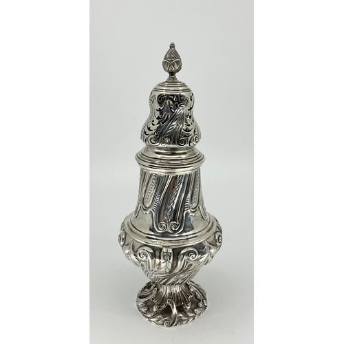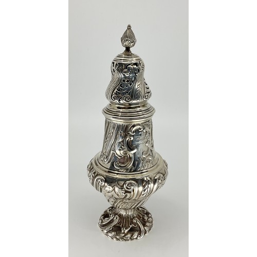 A late Victorian silver sugar castor, repousse decorated with scrolls and leafy swags, 20.6cm high, Thomas Bradbury & Sons, London 1900, 266.3g.