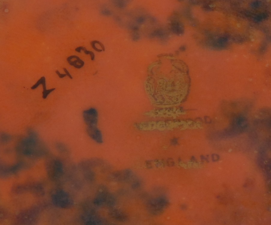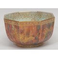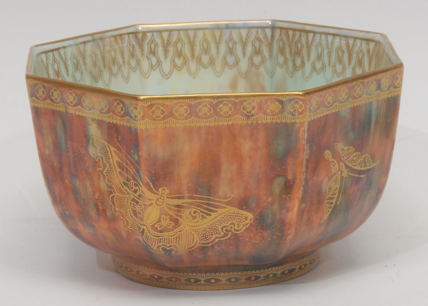 A Wedgwood Fairyland Butterfly lustre octagonal bowl, designed by Daisy Makeig-Jones, the interior with butterflies, on a mottled ground, the exterior conforming on an orange ground, 12cm wide, pattern number Z4830, printed Portland vase mark