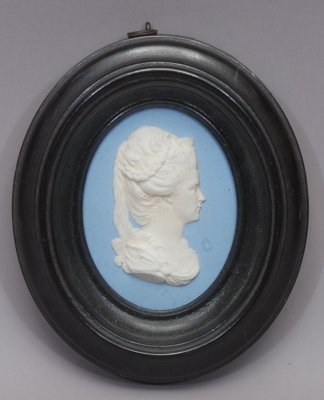 A 19th century jasperware portrait plaque, probably Wedgwood, Frederica Wilhelmina, Princess of Orange (1751 - 1820), 9cm x 7cm, ebonised frame